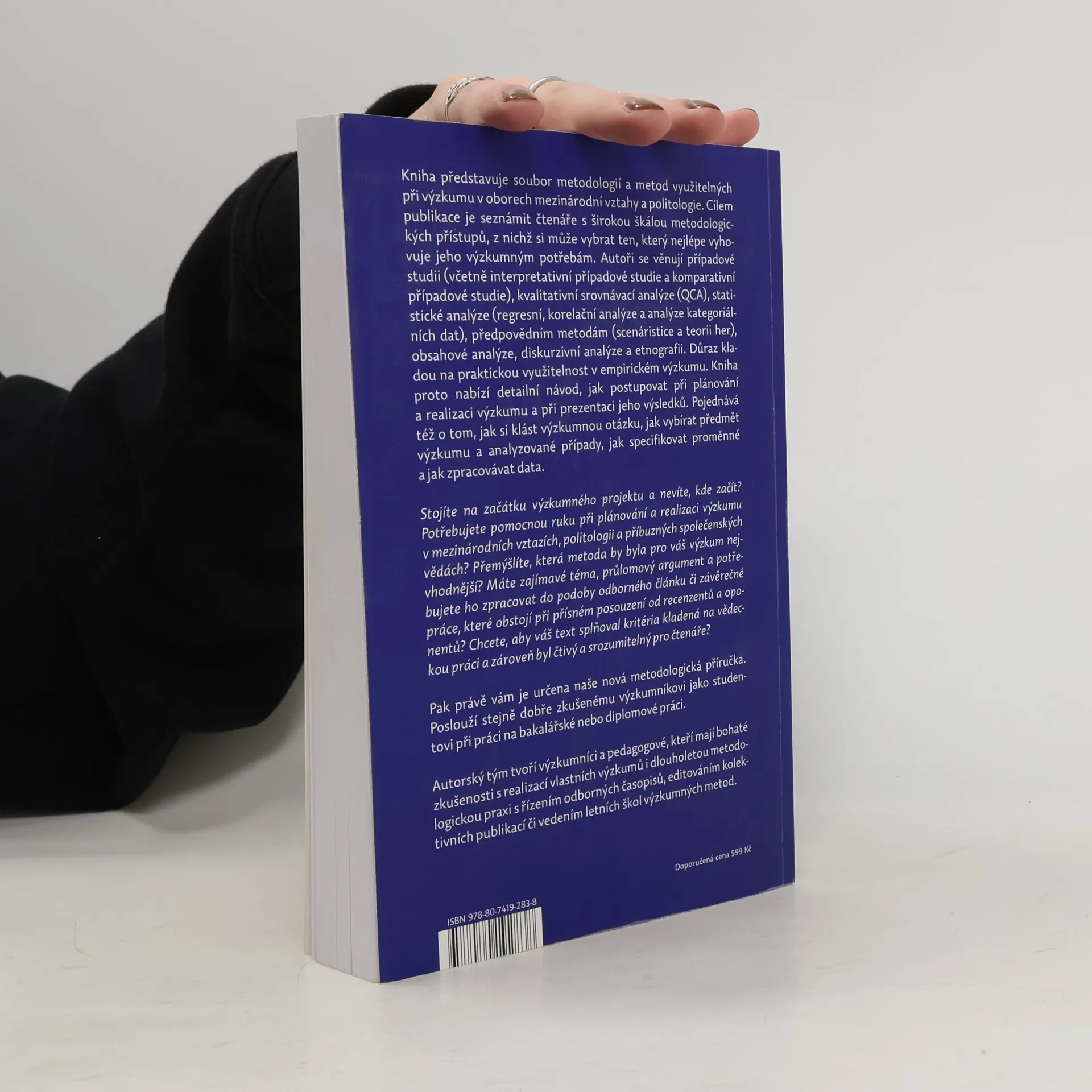 Kniha představuje soubor metodologií a metod pro výzkum v mezinárodních vztazích a politologii. Cílem je seznámit čtenáře s různými metodologickými přístupy, aby si mohli vybrat ten nejvhodnější pro své potřeby. Autoři se zaměřují na případové studie (včetně interpretativních a komparativních), kvalitativní srovnávací analýzu (QCA), statistické analýzy (regresní a korelační), předpovědní metody (scenáristiku a teorii her), obsahovou a diskurzivní analýzu, a etnografii. Důraz je kladen na praktickou využitelnost v empirickém výzkumu. Publikace nabízí detailní návod k plánování a realizaci výzkumu a prezentaci výsledků. Obsahuje rady, jak formulovat výzkumnou otázku, vybírat předmět a případy výzkumu, specifikovat proměnné a zpracovávat data. Pokud začínáte výzkumný projekt a potřebujete pomoc s plánováním v mezinárodních vztazích či politologii, tato metodologická příručka je určena právě vám. Je užitečná jak pro zkušené výzkumníky, tak pro studenty při psaní bakalářských nebo diplomových prací. Autorský tým tvoří zkušení výzkumníci a pedagogové s bohatou praxí v oblasti metodologie a řízení odborných publikací.