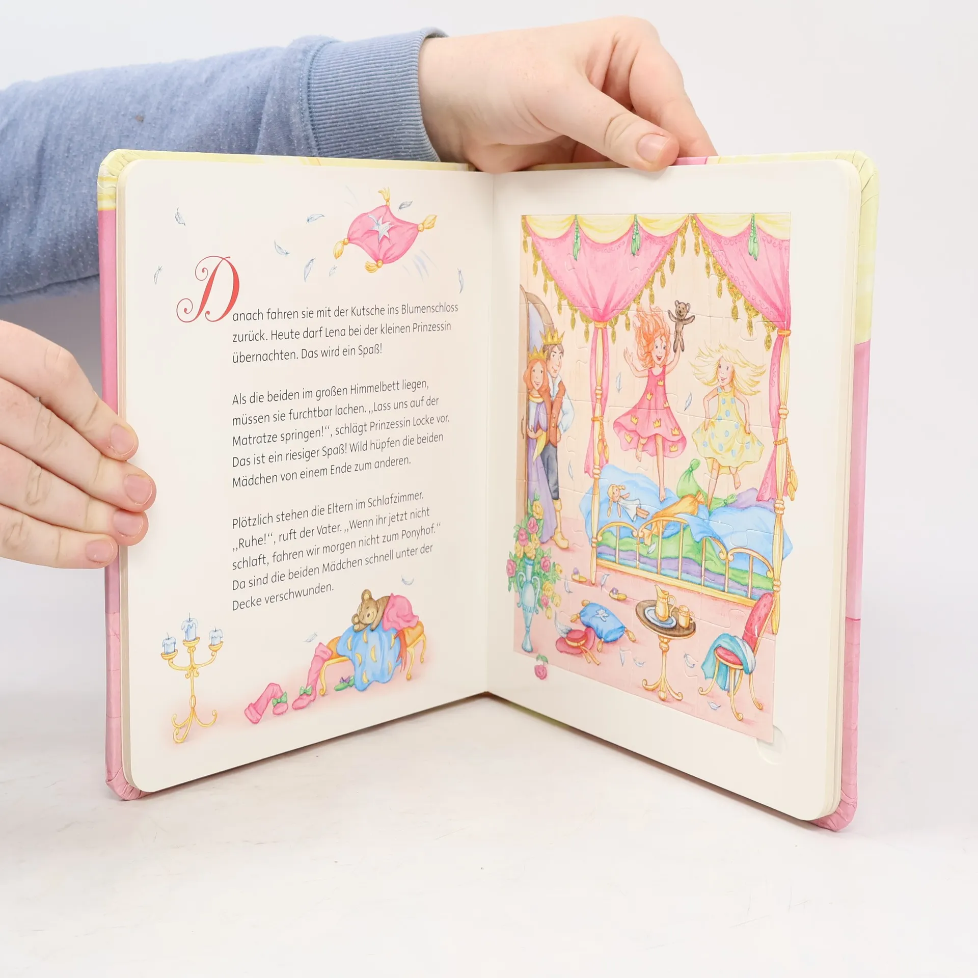 Die kleine Prinzessin ist ein richtiger Wirbelwind! Mit ihrer Freundin Lena fegt sie durch das Blumenschloss, den Ponyhof und die Hofschneiderei, dass ihre widerspenstigen roten Locken nur so fliegen! Darum nennt sie auch jeder „Prinzessin Locke“. Ein märchenhaftes Puzzlebuch nicht nur zum Lesen, sondern auch zum Spielen. Mit fünf herausnehmbaren Kinderpuzzles aus stabiler Pappe und tollen Glitzereffekten.