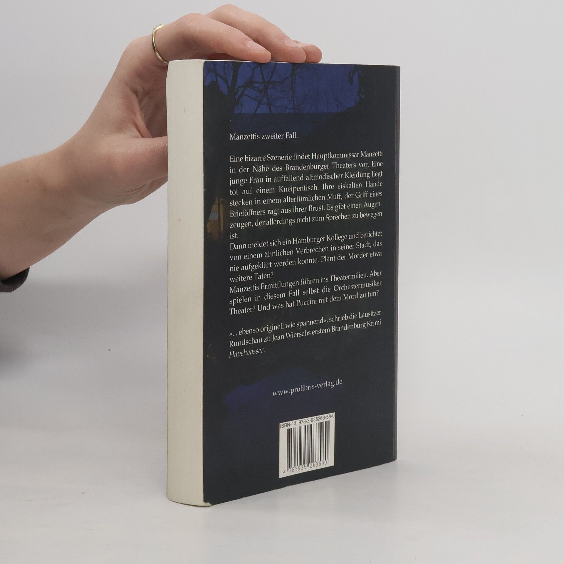Manzettis zweiter Fall. Eine bizarre Szenerie findet Hauptkommissar Manzetti in der Nähe des Brandenburger Theaters vor. Eine junge Frau in auffallend altmodischer Kleidung liegt tot auf einem Kneipentisch. Ihre eiskalten Hände stecken in einem altertümlichen Muff, der Griff eines Brieföffners ragt aus Ihrer Brust. Es gibt einen Augenzeugen, der allerdings kaum zum Sprechen zu bringen ist. Dann meldet sich ein Hamburger Kollege und berichtet von einem ähnlichen Verbrechen in seiner Stadt, das nie aufgeklärt werden konnte. Plant der Mörder etwa weitere Taten? Manzettis Ermittlungen führen ins Theatermilieu. Aber spielen in diesem Fall selbst die Orchestermusiker Theater? Und was hat Puccini mit dem Mord zu tun?