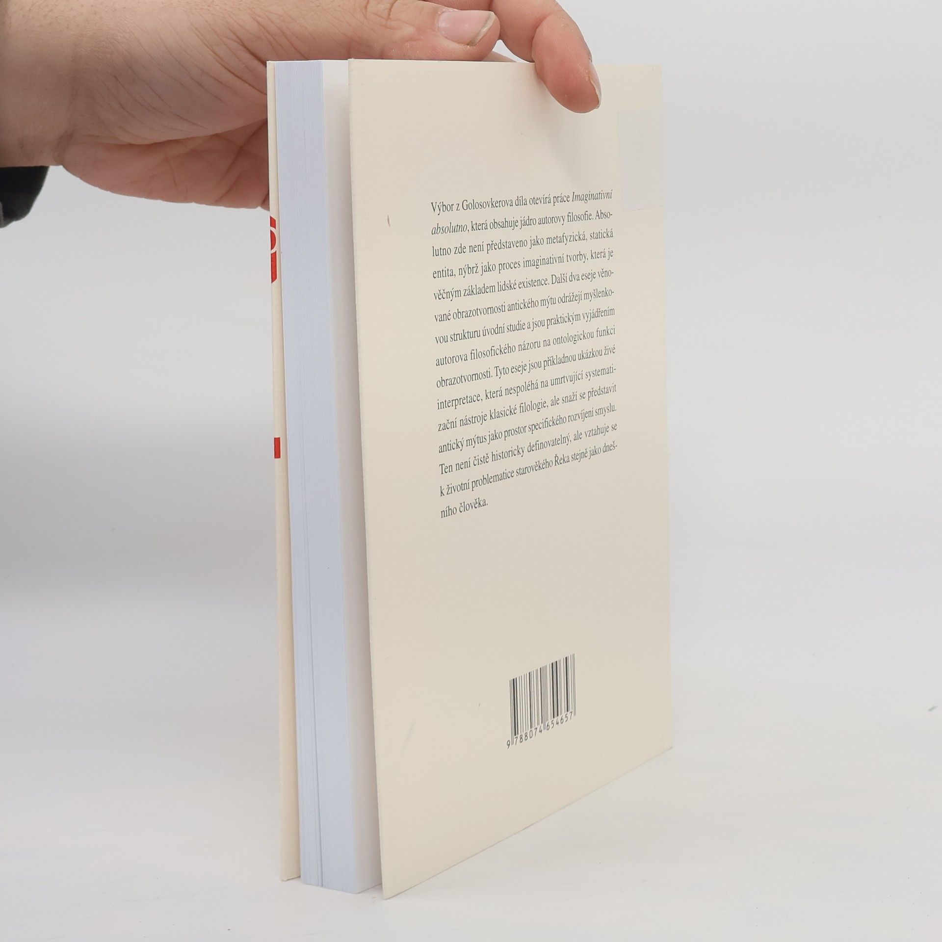Výbor z Golosovkerova díla otevírá práce Imaginativní absolutno, která obsahuje jádro autorovy filosofie. Absolutno zde není představeno jako metafyzická, statická entita, nýbrž jako proces imaginativní tvorby, která je věčným základem lidské existence. Další dva eseje věnované obrazotvornosti antického mýtu odrážejí myšlenkovou strukturu úvodní studie a jsou praktickým vyjádřením autorova filosofického názoru na ontologickou funkci obrazotvornosti. Tyto eseje jsou příkladnou ukázkou živé interpretace, která nespoléhá na umrtvující systematizační nástroje klasické filologie, ale snaží se představit antický mýtus jako prostor specifického rozvíjení smyslu. Ten není čistě historicky definovatelný, ale vztahuje se k životní problematice starověkého Řeka stejně jako dnešního člověka.
