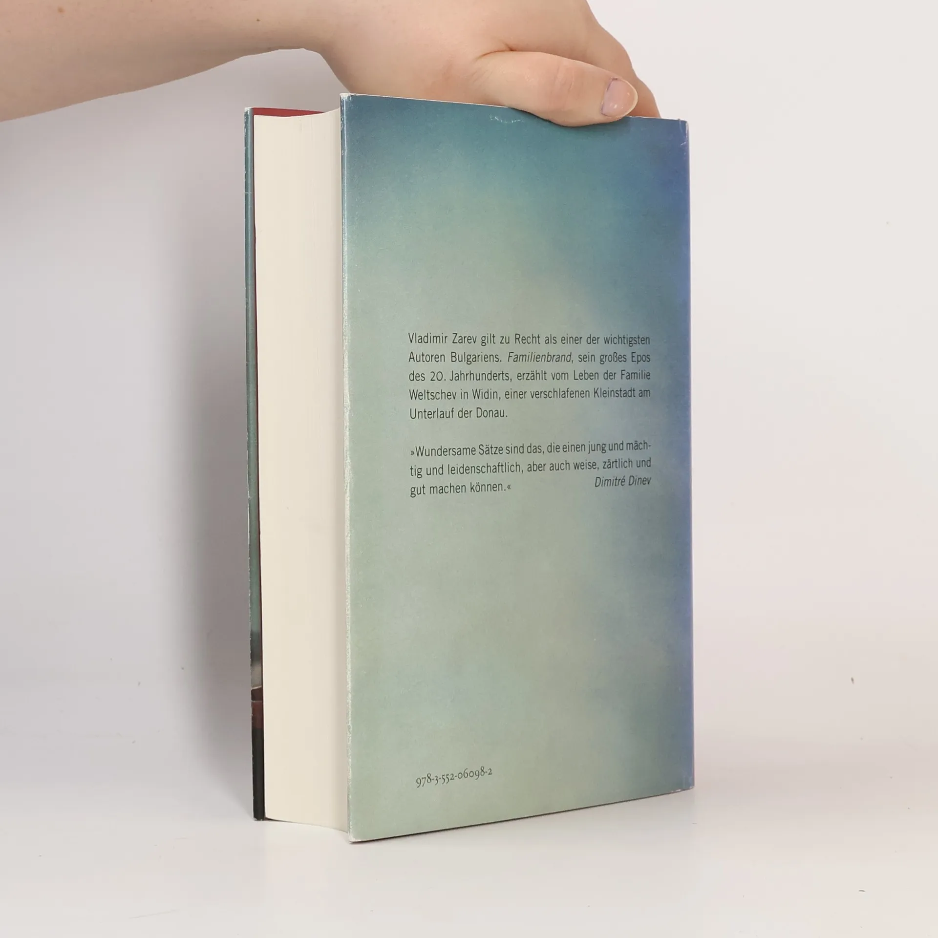 Vladimir Zarev, den nicht nur Dimitré Dinev als einen der wichtigsten Autoren in Bulgarien ansieht, erzählt im Roman „Familienbrand“ die Familiengeschichte der Weltschevs. Petruniza, die Witwe des alten Assen Weltschev, lebt mit ihren fünf Kindern in Widin, einer verschlafenen Kleinstadt am Unterlauf der Donau. Zu Beginn des 20. Jahrhunderts wird auch Widin in den Strom der Politik gerissen; in diesen unruhigen Zeiten suchen die Brüder Weltschev ihr Glück auf unterschiedliche Weise: Panto macht Karriere als Bankier, Ilija als Fabrikant und Ausbeuter. Christo, der sich für den Sozialismus begeistert, wird zum Helden wider Willen, und Jordan will eine Kirche bauen, einen Ort der Buße, doch es wird eine Raststätte, ein Ort der Muße für Sünder aller Art. Die Zukunft aber, die kann nur Jonka erkennen, die als Einzige in der Familie hellseherische Fähigkeiten hat. Ein großes Epos aus Bulgarien im 20. Jahrhundert.