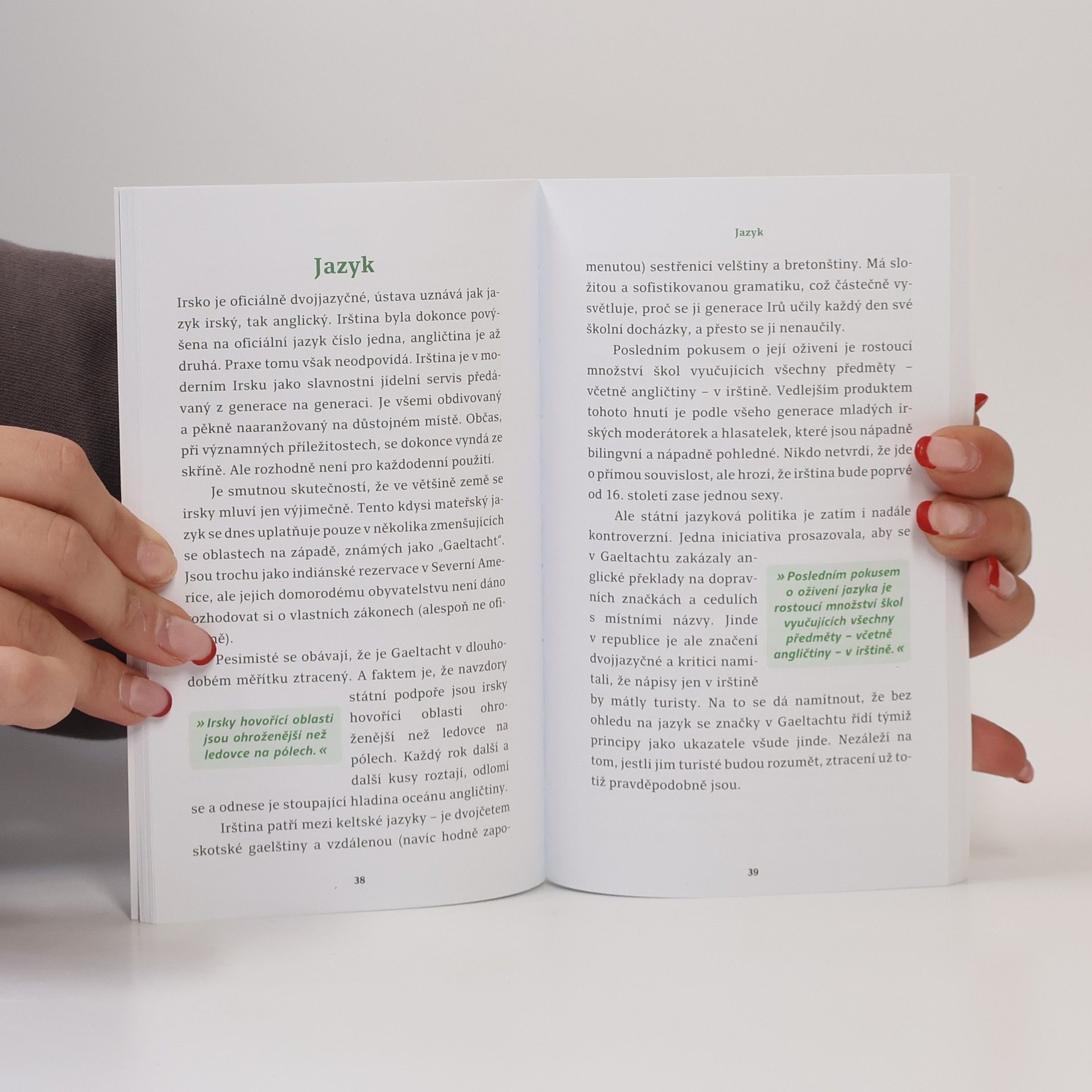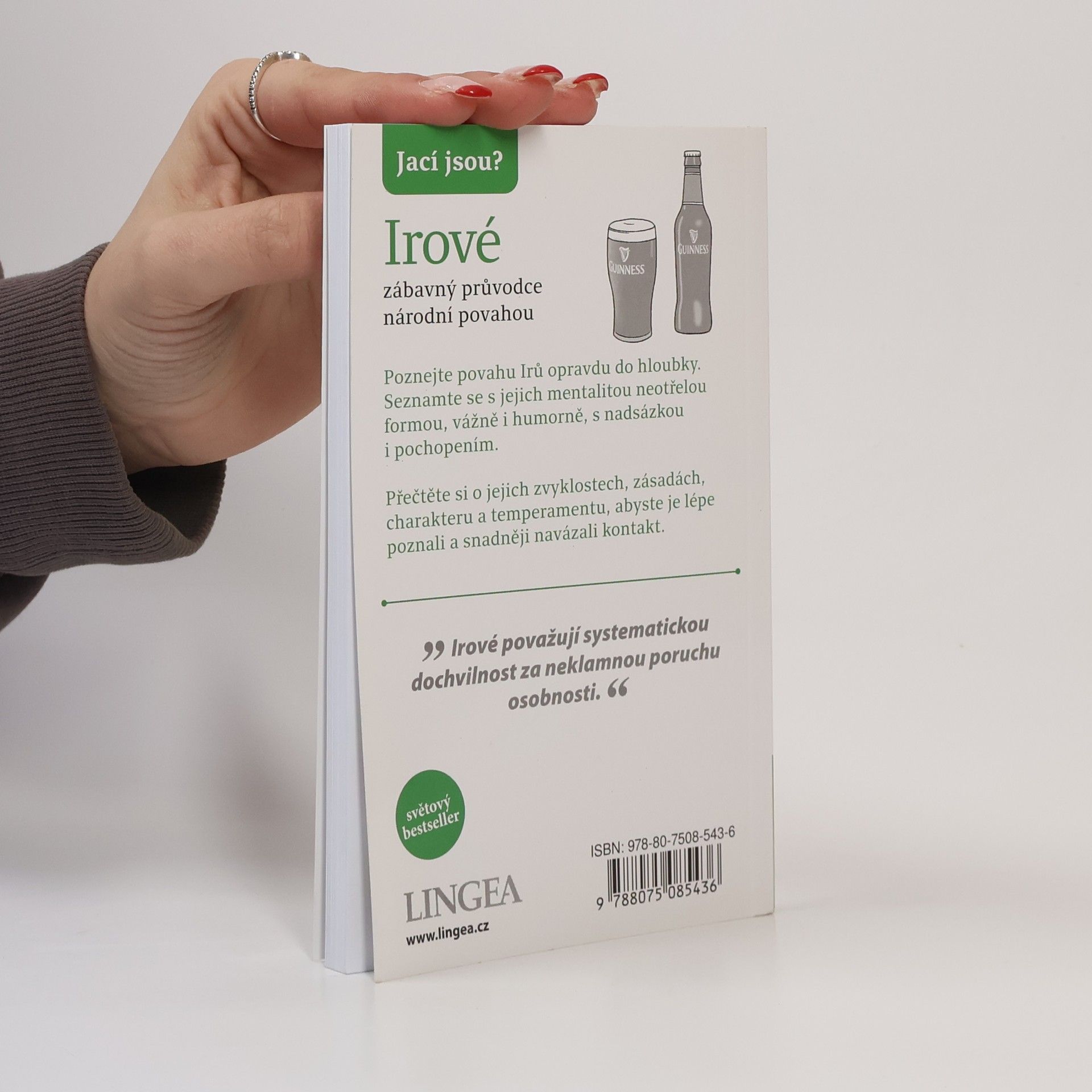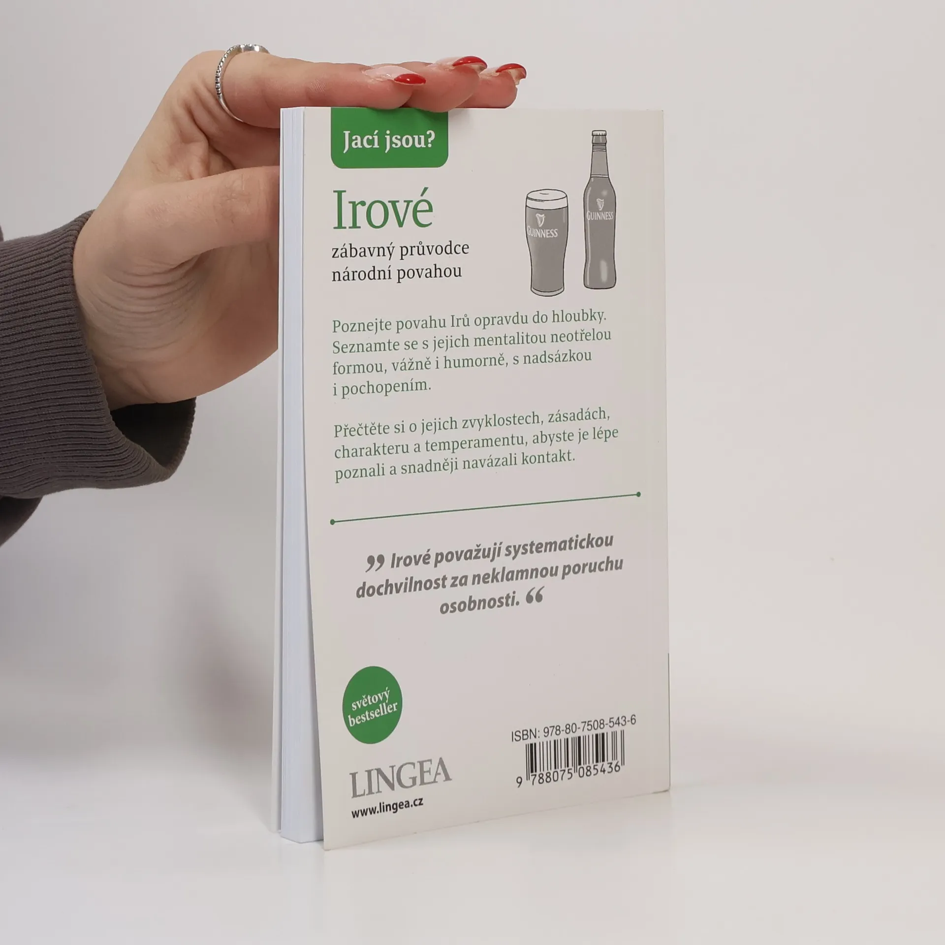 Lidé často mají stereotypní představu o Irech jako o ohnivých zrzounech, kteří se snadno rozčílí. Typický Ir však bývá hnědovlasý a modrooký, a i když jsou potomky Keltů, dnešní Irové by si dobře rozmysleli, než by se pustili do akce bez oblečení. Rádi se považují za vyrovnané osoby s silným vztahem k půdě a lhostejností k materiálním statkům. Irové mají šarm a jsou výřeční, což může souviset s jejich životem na osamělém ostrově. Milují barvité obraty a často přehánějí, což se odráží i v jejich literatuře, za kterou získali čtyři Nobelovy ceny. V zemi s málo posluchači se lidé snadno uchýlí k samomluvě, což může vést k psaní. Irský jazyk dodává angličtině vřelost. Dopravní značení v Irsku odráží každodenní mluvu, a často není cílem poskytnout jasné informace. V některých oblastech se zdá, že značky jsou navrženy tak, aby zmatek zůstával. Irové se považují za šťastlivce, přestože jejich historie je plná války, hladomoru a emigrace. „Irské štěstí“ se stalo synonymem pro přízeň osudu, ačkoli původně mohlo být myšleno sarkasticky. Irové se rádi baví, popíjejí, zpívají a tančí, a irská hospoda je známým symbolem jejich kultury.