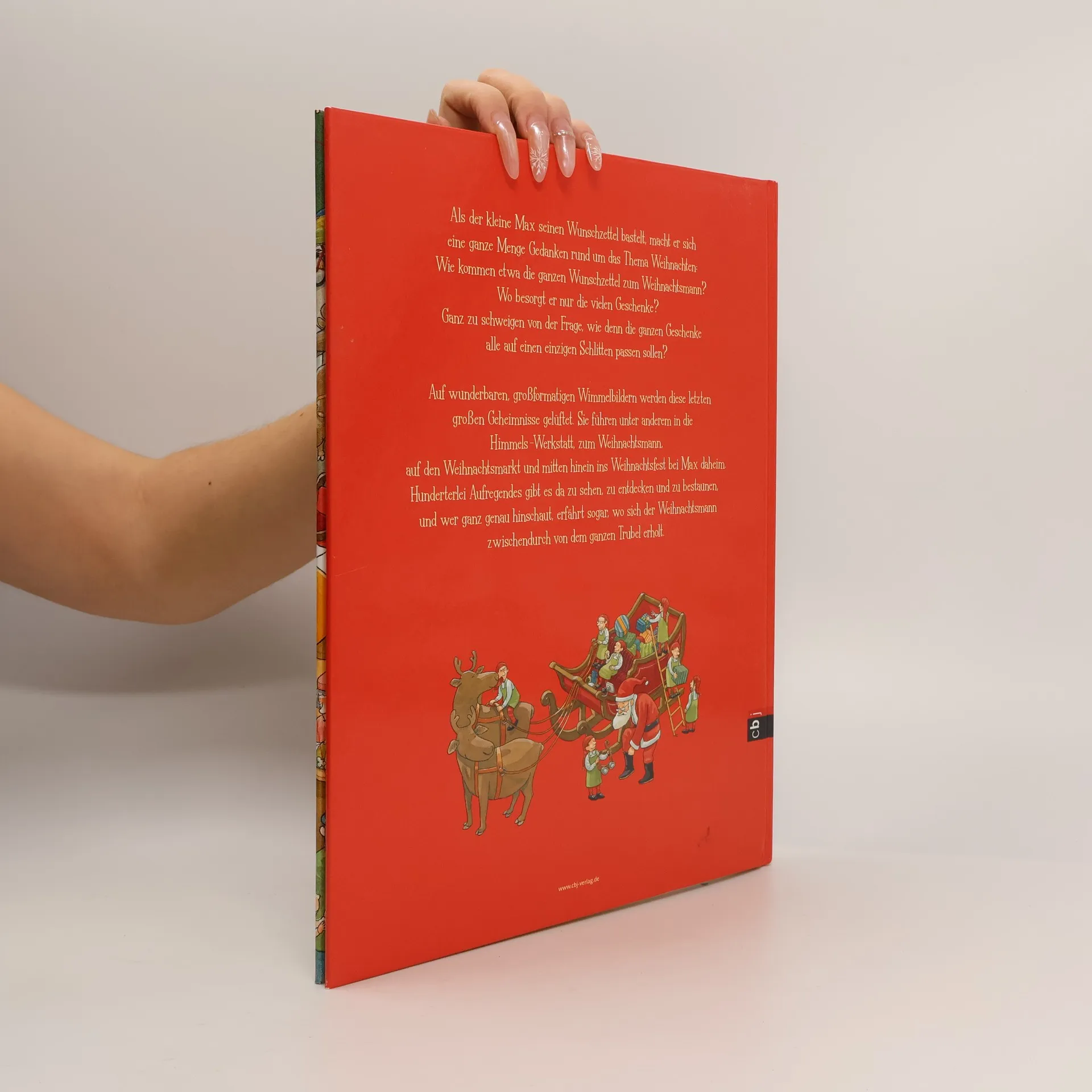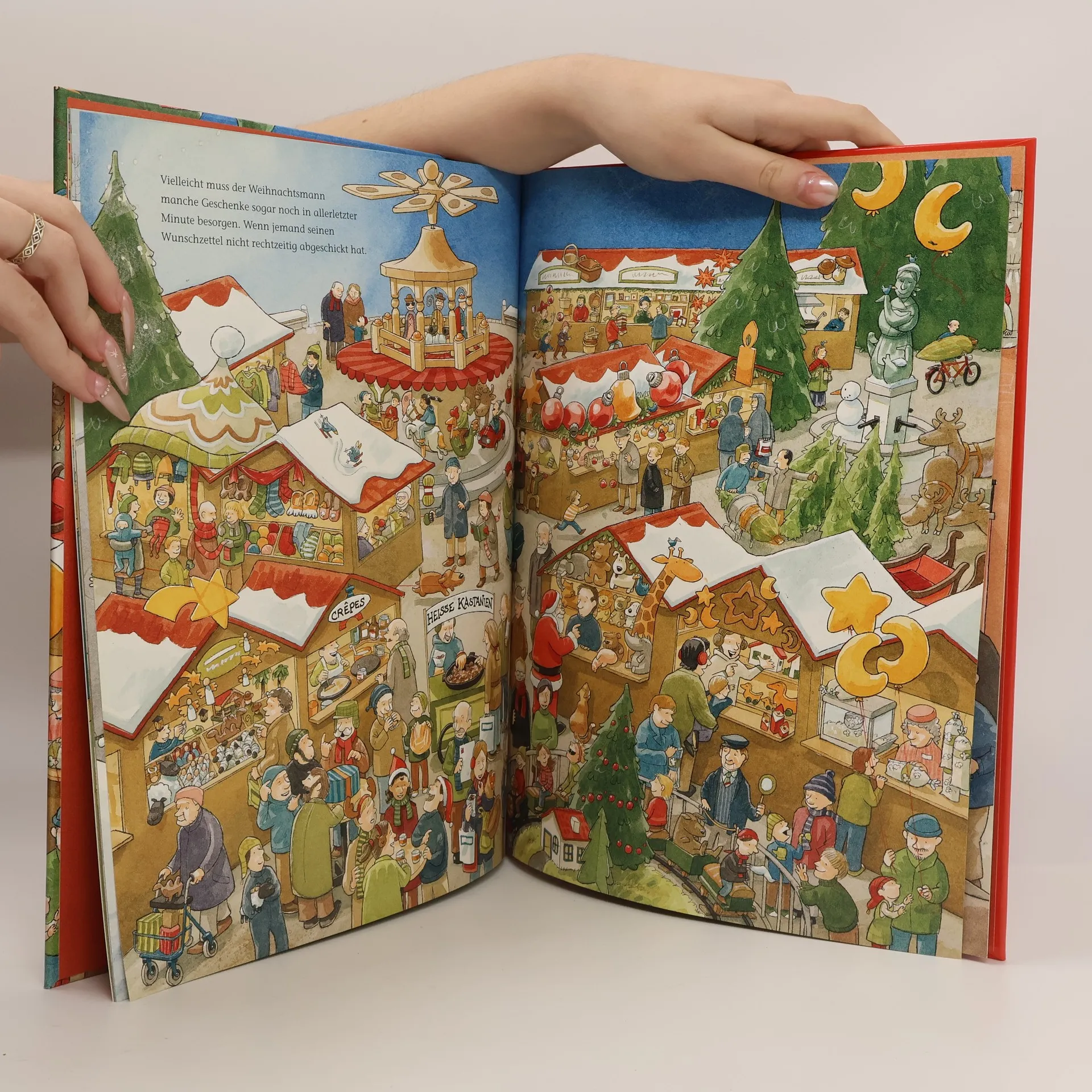 Das große Wimmelbilderbuch zur Weihnachtszeit Wie kommen die Wunschzettel zum Weihnachtsmann? Wie besorgt er nur die vielen Geschenke? Und wie passen die alle auf einen einzigen Schlitten? Große Fragen und Geheimnisse rund um Weihnachten bewegen den kleinen Max – und das Weihnachtswimmelbuch von Alexander Steffensmeier spürt ihnen herrlich aufregend nach. Wunderbar großformatige Wimmelbilder und kleine Erzähltexte von Max führen in die Himmels-Werkstatt, zum Weihnachtsmann und mitten hinein ins Weihnachtsfest bei Max daheim. Und wer ganz genau hinschaut, entdeckt sogar, wo der Weihnachtsmann zwischendurch ein Päuschen macht. • Das riesengroße Bilderbuchvergnügen voller Überraschungen • Der grandiose Entdeckerspaß für die Kleinen ab 4 • Mit echter Buchdecke und griffigem Papier extra für Kinderhände