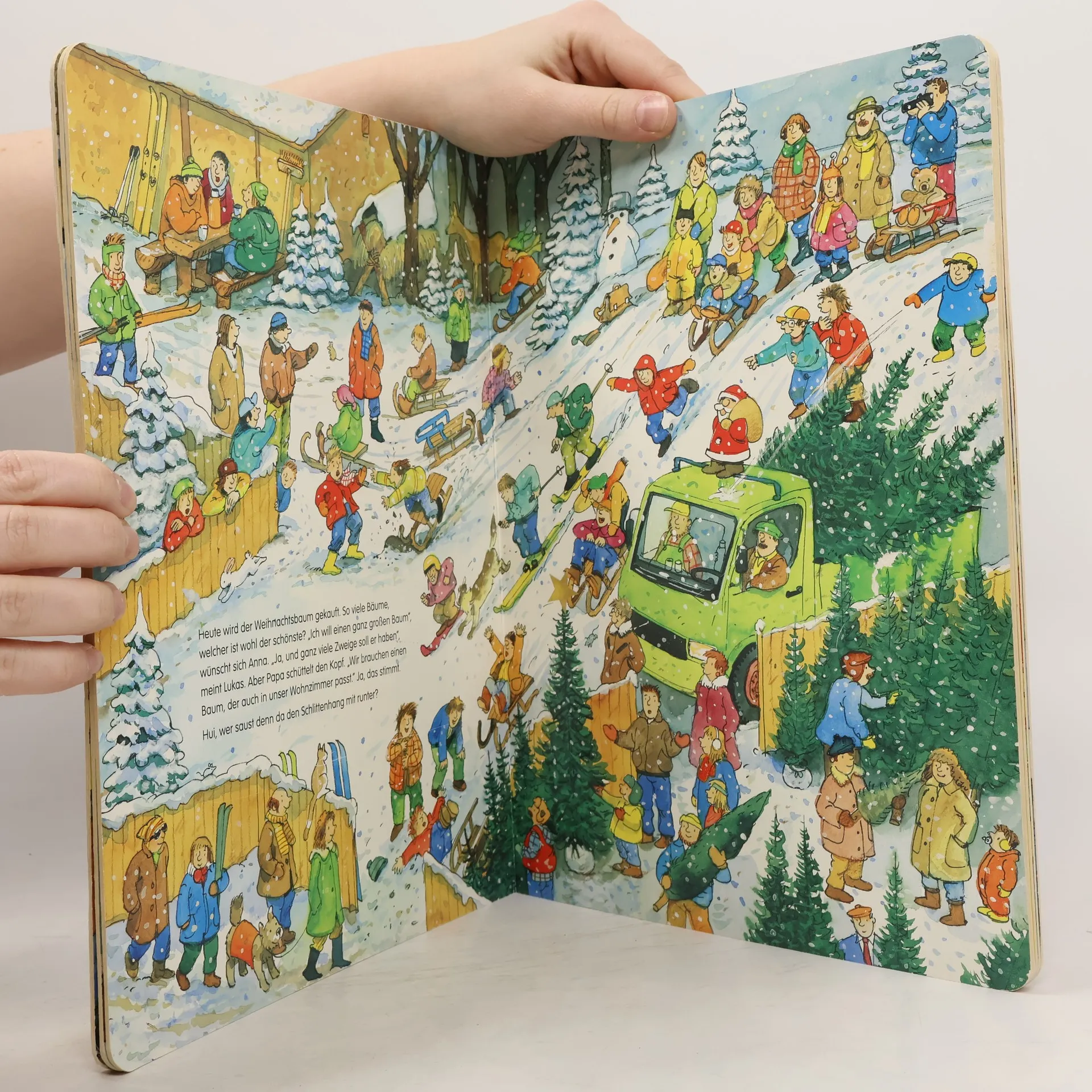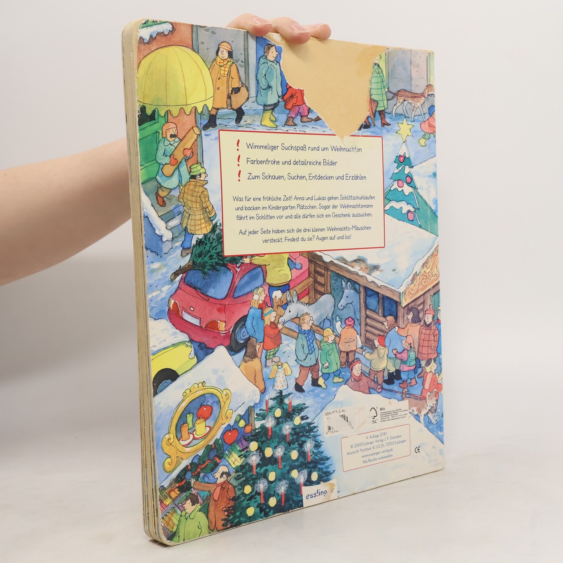 Fröhliches Weihnachts-Wimmelbuch für Kinder ab 2 Jahren – mit kleiner Geschichte und extra Suchaufgabe! Was für eine fröhliche Zeit! Anna und Lukas gehen Schlittschuhlaufen, backen im Kindergarten Plätzchen, suchen einen Tannenbaum aus und streicheln auf dem Weihnachtsmarkt die Esel im Stall. Sogar der Weihnachtsmann fährt im Schlitten vor und alle dürfen sich ein Geschenk aussuchen. Auf jeder Seite haben sich die drei kleinen Weihnachts-Mäuschen versteckt. Wer entdeckt sie gleich? Augen auf und los!