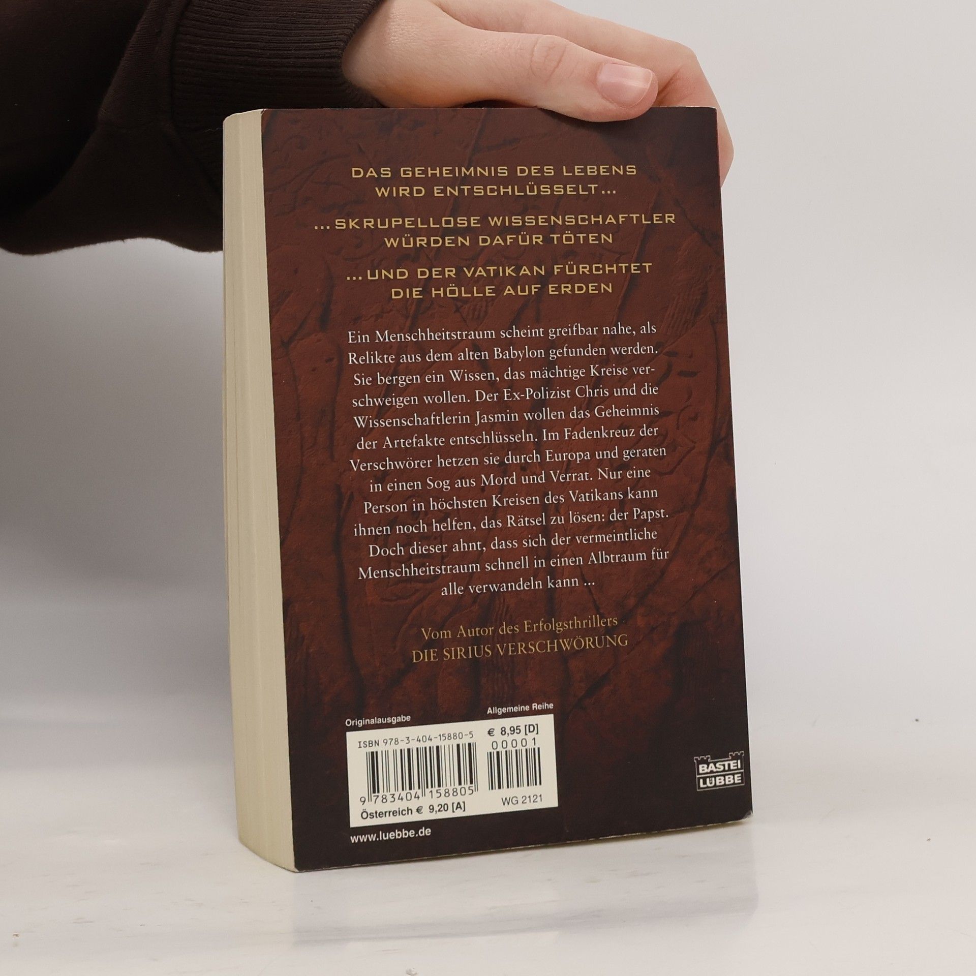 Das Geheimnis des Lebens wird entschlüsselt ... skupellose Wissenschaftler würden dafür töten ... und der Vatikan fürchtet die Hölle auf Erden. Ein Menschheitstraum scheint greifbar nahe, als Relikte aus dem alten Babylon gefunden werden. Sie bergen ein Wissen, das mächtige Kreise verschweigen wollen. Der Ex-Polizist Chris und die Wissenschaftlerin Jasmin wollen das Geheimnis der Artefakte entschlüsseln. Im Fadenkreuz der Verschwörer hetzen sie durch Europa und geraten in einen Sog aus Mord und Verrat. Nur eine Person in höchsten Kreisen des Vatikans kann ihnen noch helfen, das Rätsel zu lösen: der Papst. Doch dieser ahnt, dass sich der vermeintliche Menschheitstraum schnell in einen Albtraum für alle verwandeln kann ...