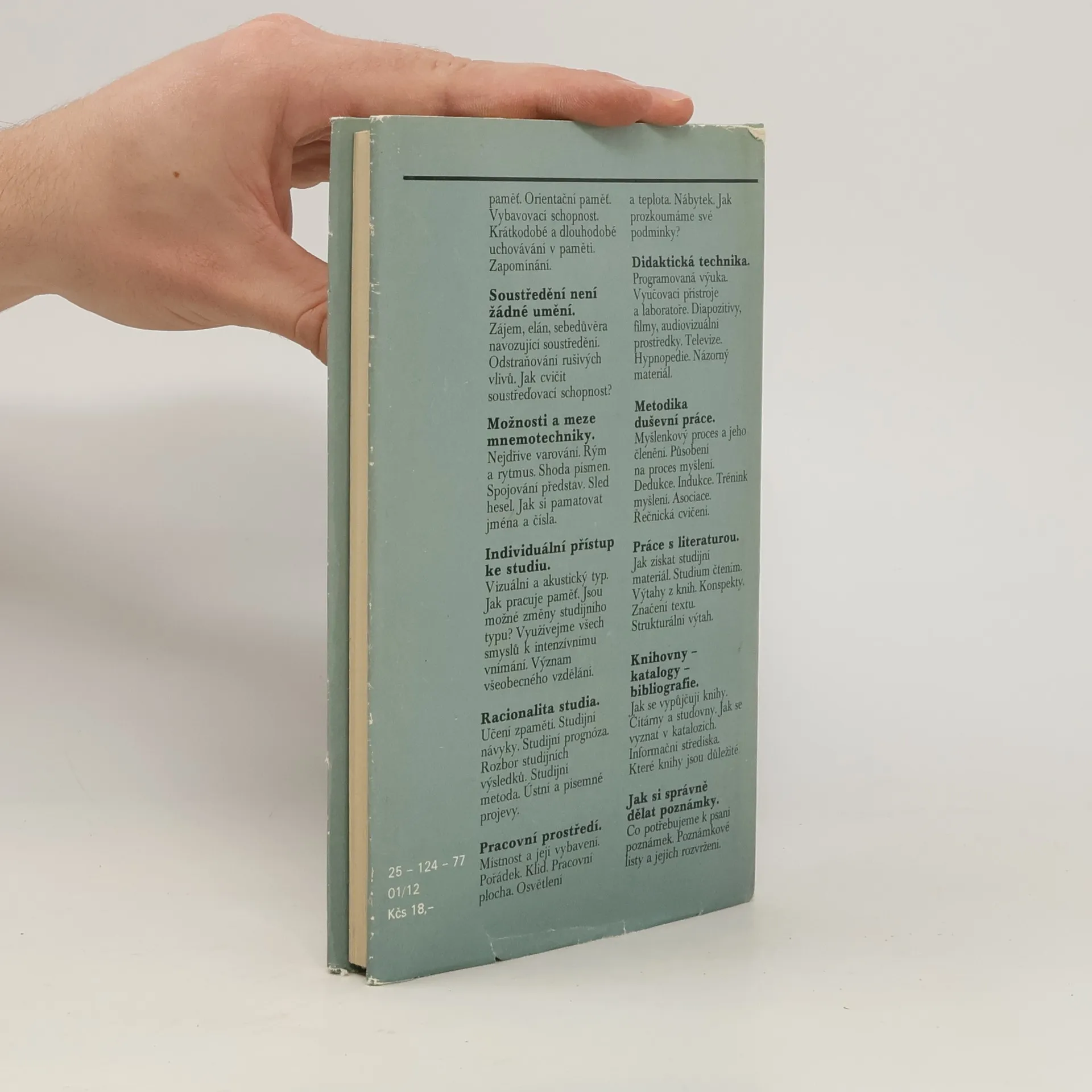 Upravený překlad knížky západoněmeckého průmyslového psychologa přístupným způsobem podává návod, jak dosáhnout vyšší účinnosti duševní práce. Ukazuje z jakých zdrojů je možno čerpat vědomosti, zdůrazňuje význam ujasnění cíle, probírá zásady duševní a tělesné hygieny, podstatu studijního procesu, činnost paměti, metodiku duševní práce aj.