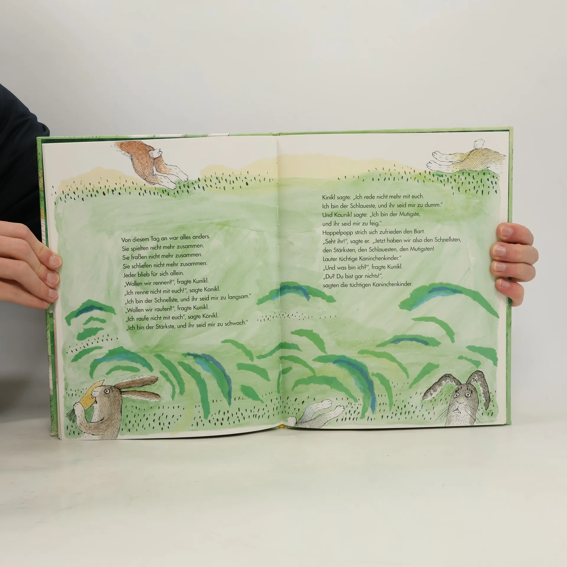 Kanikl, Könikl, Kinikl, Kaunikl und Kunikl wohnen in einem schönen Kaninchenbau. Sie haben es warm und gemütlich, sie spielen zusammen, essen gemeinsam und kuscheln sich eng aneinander, wenn sie müde sind und schlafen wollen. Doch eines Tages kommt ein Anderer und fragt, wer von Ihnen etwas besonders gut kann. Sie finden heraus, wer von ihnen der Tapferste ist und wer am schnellsten laufen kann ... von da an haben sie es schwer miteinander. Doch plötzlich droht Gefahr - ein Dachs. Und jetzt erkennen Kanikl, Könikl, Kinikl, Kaunikl und Kunikl, dass sie nur gemeinsam jede Gefahr überwinden können!