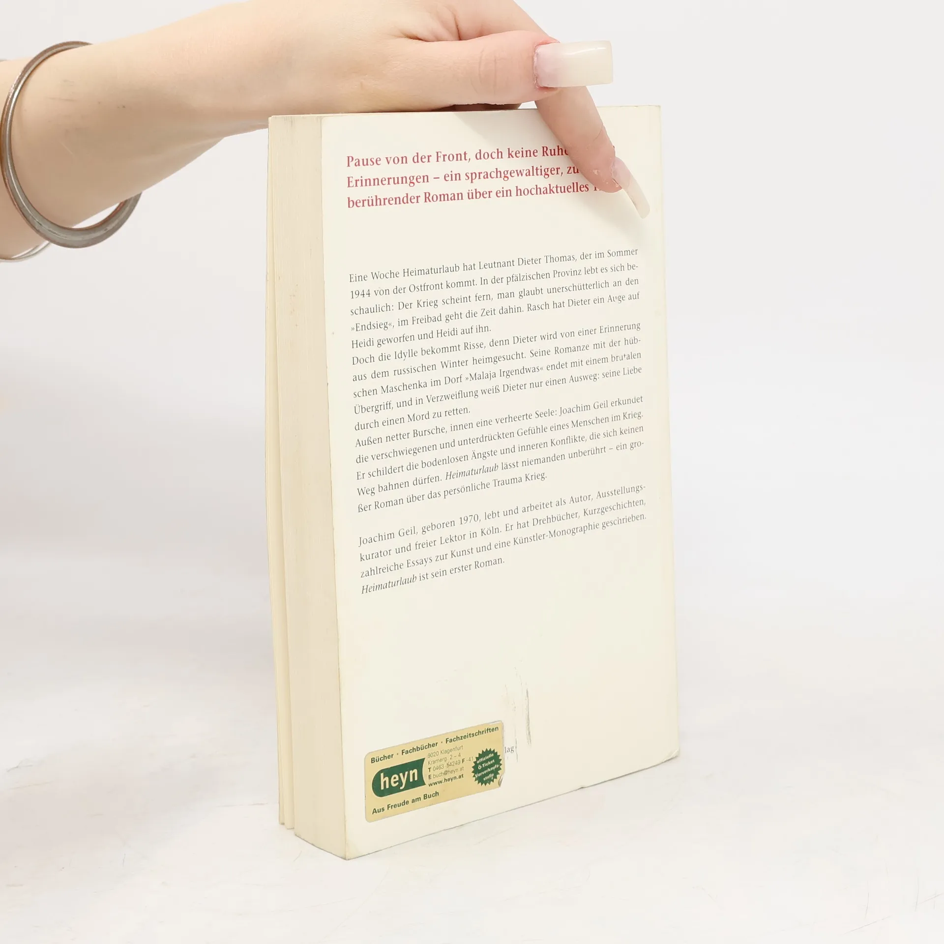 Joachim Geil Heimaturlaub Eine Woche Heimaturlaub hat Leutnant Dieter Thomas, der im Sommer 1944 von der Ostfront kommt. In der pfälzischen Provinz lebt es sich beschaulich: Der Krieg scheint fern, man glaubt unerschütterlich an den 'Endsieg', im Freibad geht die Zeit dahin. Rasch hat Dieter ein Auge auf Heidi geworfen und Heidi auf ihn. Doch die Idylle bekommt Risse, denn Dieter wird von einer Erinnerung aus dem russischen Winter heimgesucht. Seine Romanze mit der hübschen Maschenka im Dorf 'Malaja Irgendwas' endet mit einem brutalen Übergriff, und in Verzweiflung weiß Dieter nur einen Ausweg: seine Liebe durch einen Mord zu retten. Außen netter Bursche, innen eine verheerte Seele: Joachim Geil erkundet die verschwiegenen und unterdrückten Gefühle eines Menschen im Krieg. Er schildert die bodenlosen Ängste und inneren Konflikte, die sich keinen Weg bahnen dürfen. Heimaturlaub lässt niemanden unberührt – ein großer Roman über das persönliche Trauma Krieg. Joachim Geil, geboren 1970, lebt und arbeitet als Autor, Ausstellungskurator und freier Lektor in Köln. Er hat Drehbücher, Kurzgeschichten, zahlreiche Essays zur Kunst und eine Künstler-Monografie geschrieben. Heimaturlaub ist sein erster Roman.