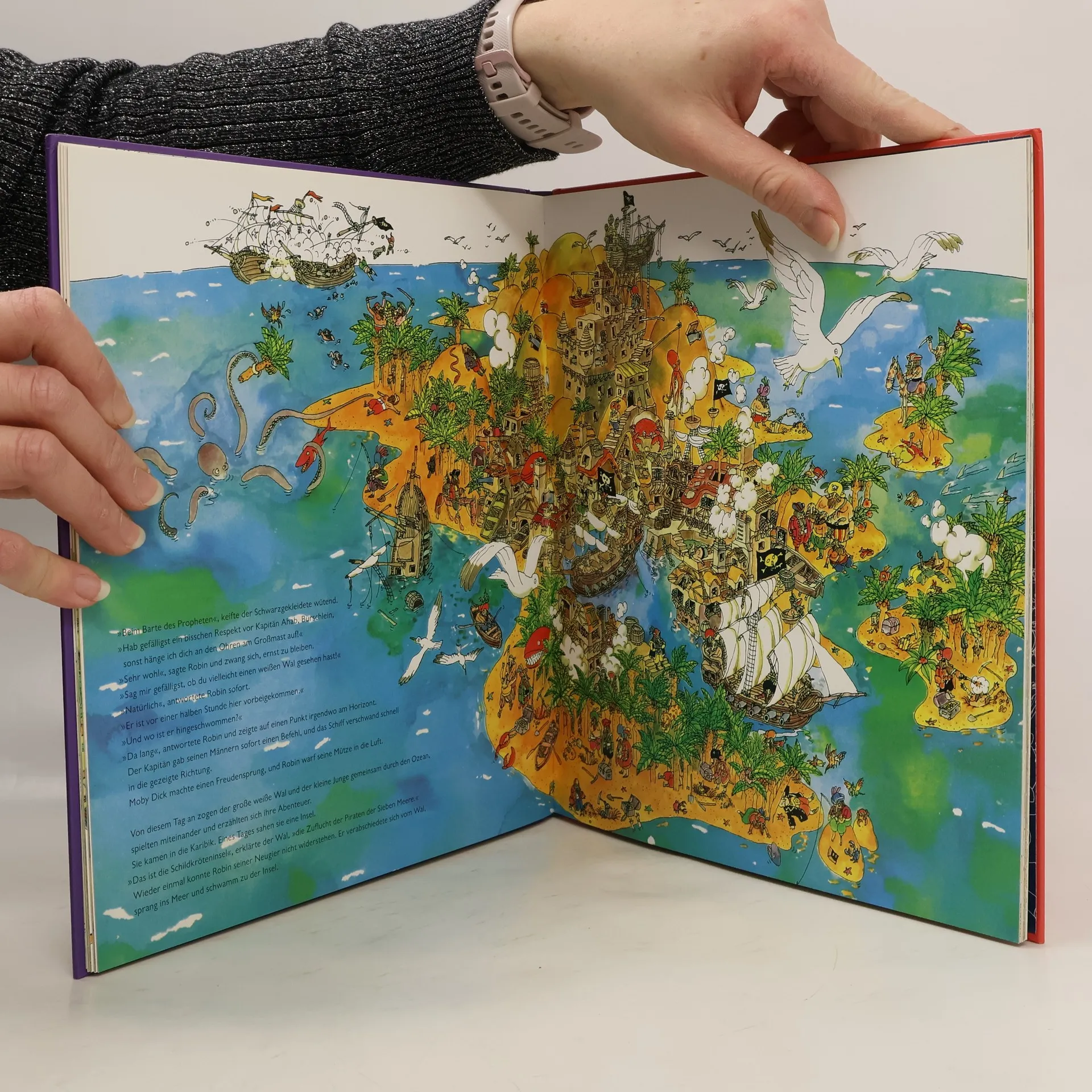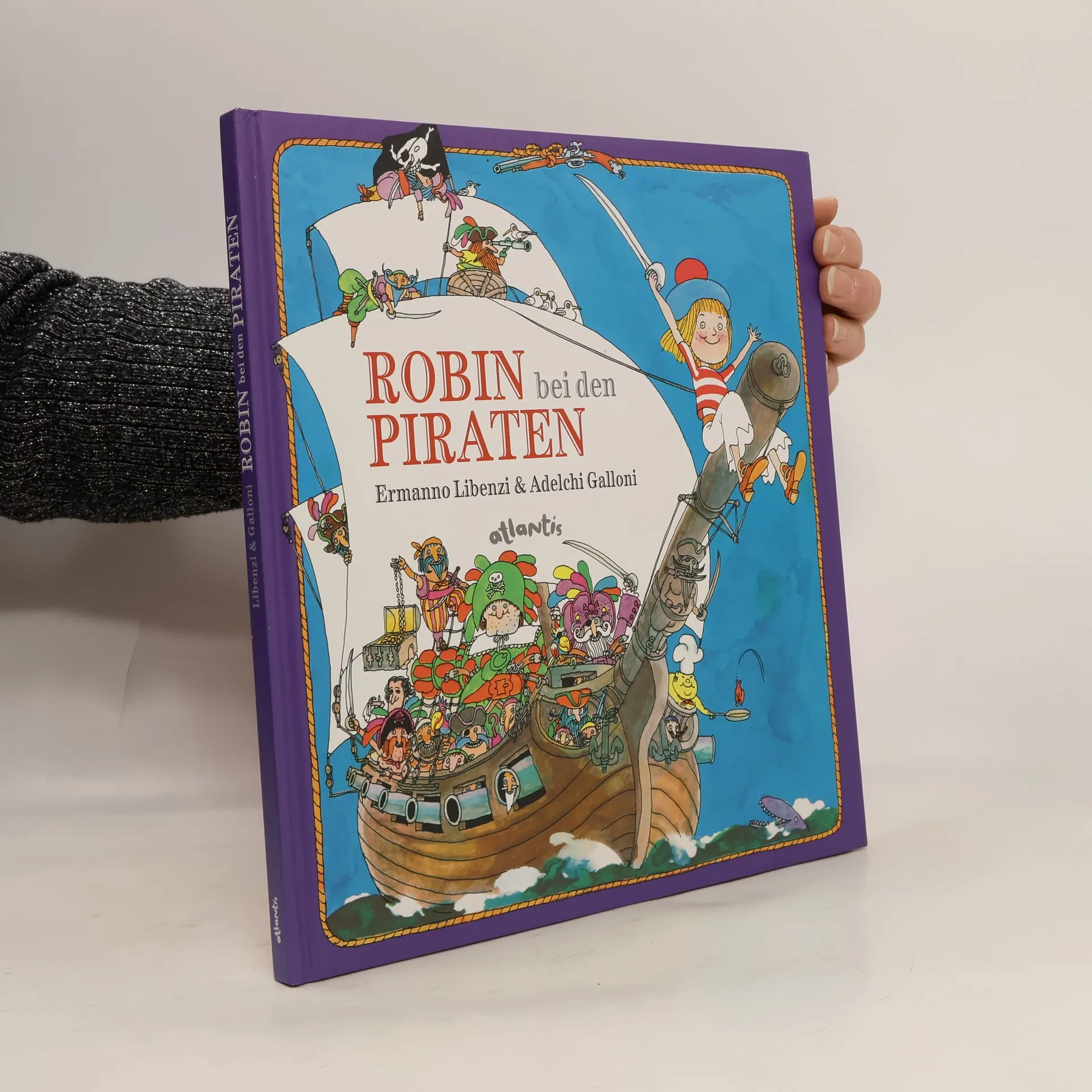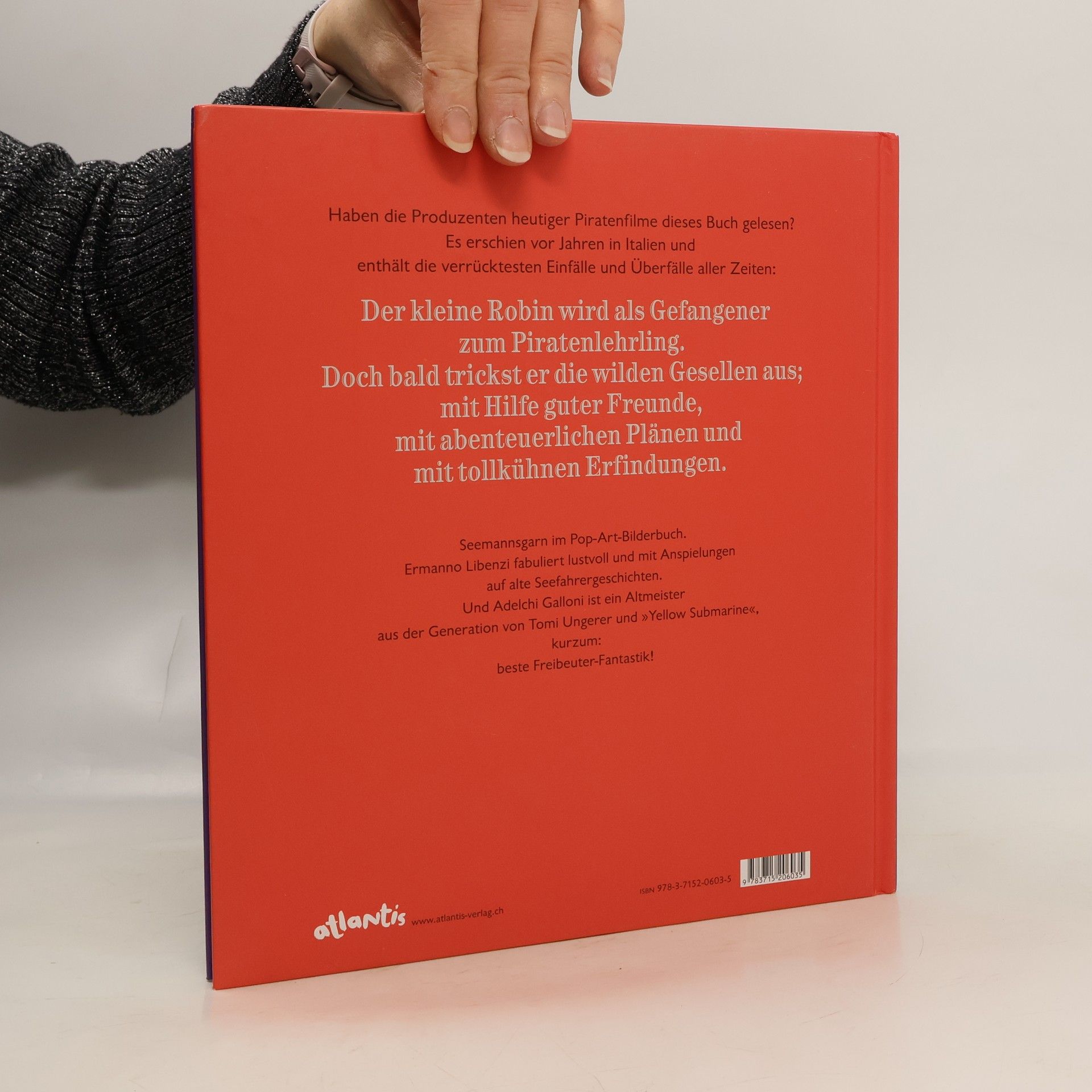 Eine Krake, die einen Goldschatz bewacht, ein Geisterschiff, eine Insel voller Piraten – kaum hat Robin die Nase im Wind, steckt er mitten in den wunderlichen Abenteuern. Dabei lebte er eben noch friedlich bei seinem Großvater auf dem Leuchtturm. Jetzt aber hilft er Moby Dick, sich zu verstecken, er wird Piratenlehrling von Käptn Hook und trifft allerlei kuriose und altbekannte Gestalten: von Kapitän Nemo mit seinem U-Boot bis zum einem Erfinder, der Robin am Ende hilft, mit einer lenkbaren Taube nach Hause zu fliegen. Ermanno Libenzi fabuliert lustvoll und mit Anspielungen auf bekannte Seefahrergeschichten, und Adelchi Galloni ist ein Altmeister aus der Generation von Tomi Ungerer und der Bildwelt von Yellow Submarine, kurzum: beste Freibeuter- Fantastik aus den 70er-Jahren!