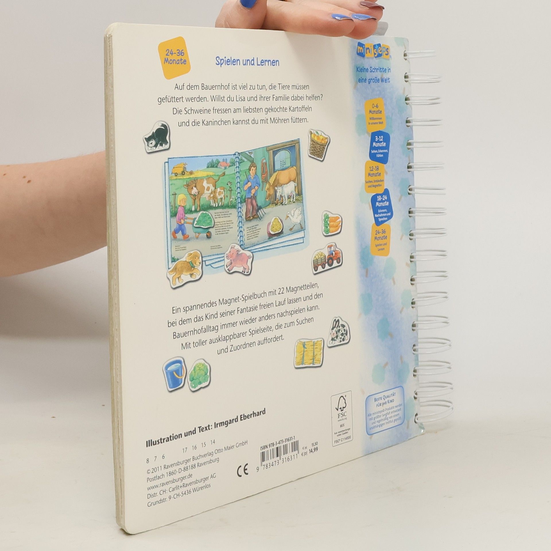 Betrachten und Spielen: Dieses wundervoll gestaltete Bauernhof-Buch bietet viele spannende Möglichkeiten. Man kann es betrachten und entdecken, wie die Tiere auf Lisas Bauernhof versorgt werden und welche Arbeit auf dem Land anfällt. Dank der 22 Magnete können die Kleinen auch spielerisch in die Geschichte eingreifen. Die ausklappbare Doppelseite am Schluss liefert viele weitere Spielideen. Vertrauen schenken. Das Leben entdecken. Babys und Kleinkinder wollen mit allen Sinnen die Welt entdecken. ministeps begleitet die Kleinen auf ihren ersten Schritten ins Leben. Die vielfältigen ministeps Bücher, Spiele und Spielsachen bieten für jedes Kind die optimalen Sinnesanreize. Sie fördern das Erkennen von Farben, Formen und Bildern, sie laden zum (Be-) Greifen ein und ermutigen zum Krabbeln und Sprechen. Alle ministeps Produkte sind von höchster Ravensburger Qualität. Und das spüren nicht nur die Kleinen. Auch die Großen haben die Sicherheit, den Kindern immer ideale Anreize zu bieten.