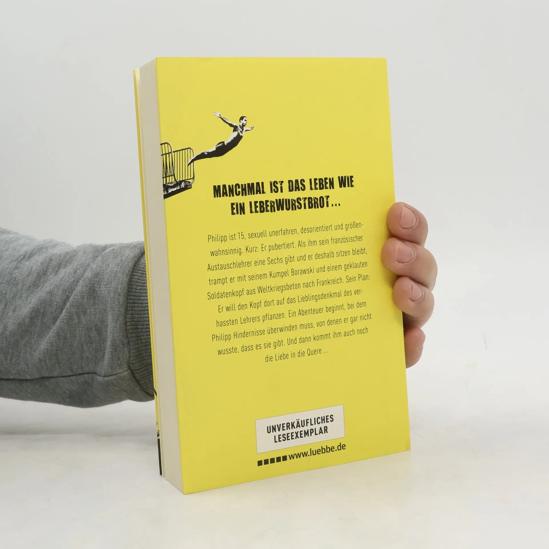 Manchmal ist das Leben wie ein Leberwurstbrot ... Philipp ist 15, sexuell unerfahren, desorientiert und größenwahnsinnig. Kurz: Er pubertiert. Als ihm sein französischer Austauschlehrer eine Sechs gibt und er deshalb sitzen bleibt, trampt er mit seinem Kumpel Borawski und einem geklauten Soldatenkopf aus Weltkriegsbeton nach Frankreich. Sein Plan: Er will den Kopf dort auf das Lieblingsdenkmal des verhassten Lehrers pflanzen. Ein Abenteuer beginnt, bei dem Philipp Hindernisse überwinden muss, von denen er gar nicht wusste, dass es sie gibt. Und dann kommt ihm auch noch die Liebe in die Quere ...
