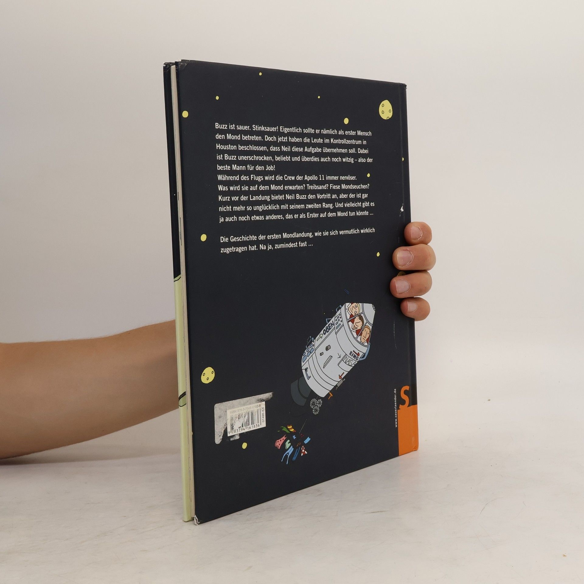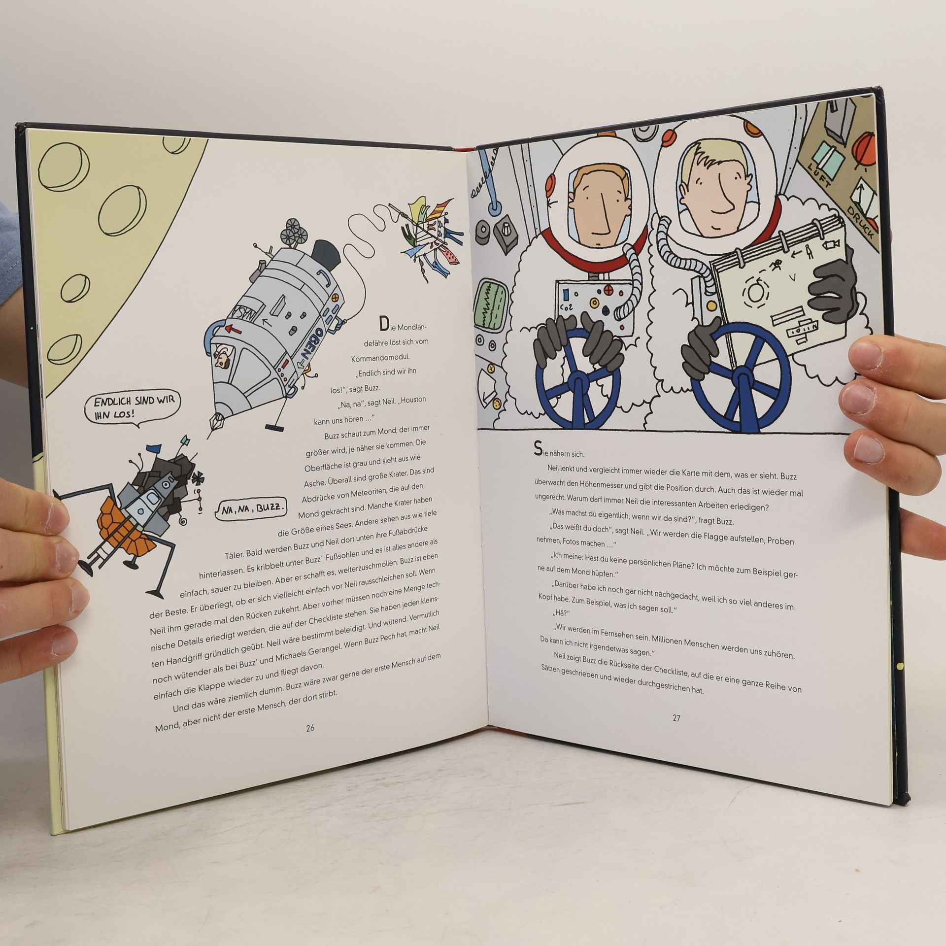 Dicke Luft in der Apollo 11. Buzz ist stinksauer. Eigentlich sollte er nämlich als erster Mensch den Mond betreten. Doch jetzt haben die Leute im Kontrollzentrum in Houston beschlossen, dass Neil diese Aufgabe übernehmen soll. Während des Flugs wird die Crew aber immer nervöser. Was wird sie auf dem Mond erwarten? Treibsand? Fiese Mondseuchen? Kurz vor der Landung bietet Neil Buzz den Vortritt an, aber der ist auf einmal gar nicht mehr so erpicht darauf, Erster zu sein. Und schließlich wird Buzz ohnehin noch etwas tun, das vor ihm garantiert noch keiner auf dem Mond gemacht hat. Die Geschichte der ersten Mondlandung, wie sie sich vermutlich wirklich zugetragen hat. Na ja, zumindest fast.