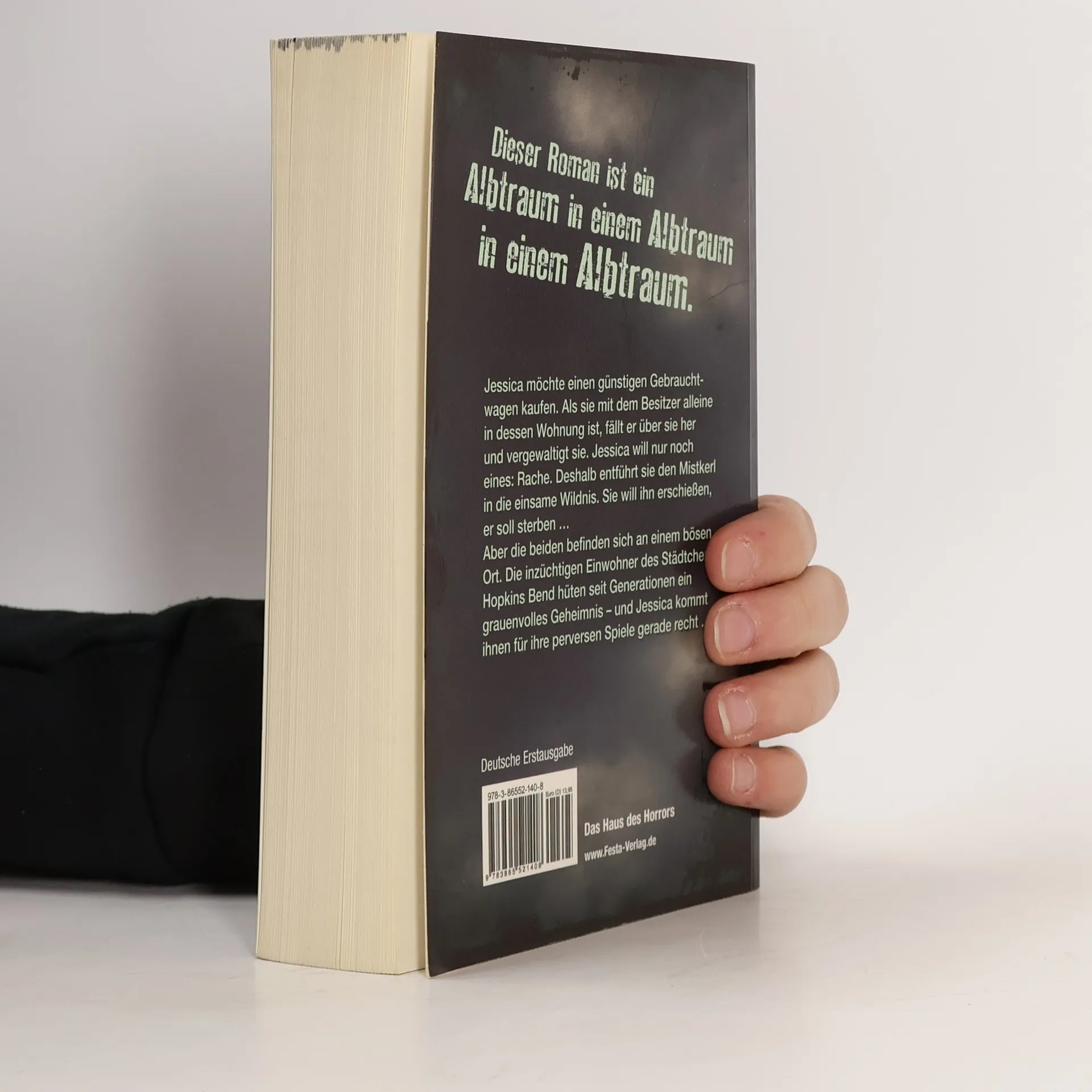 Jessica möchte einen günstigen Gebrauchtwagen kaufen. Als sie mit dem Besitzer alleine in dessen Wohnung ist, fällt er über sie her und vergewaltigt sie. Jessica will nur noch eines: Rache. Deshalb entführt sie den Mistkerl in die einsame Wildnis. Sie will ihn erschießen, er soll sterben … Aber die beiden befinden sich an einem bösen Ort. Die inzüchtigen Einwohner des Städtchens Hopkins Bend hüten seit Generationen ein grauenvolles Geheimnis – und Jessica kommt ihnen für ihre perversen Spiele gerade recht … Dieser Roman ist ein Albtraum in einem Albtraum in einem Albtraum. Deutsche Erstausgabe. Broschur 19 x 12 cm, Umschlag in Lederoptik.