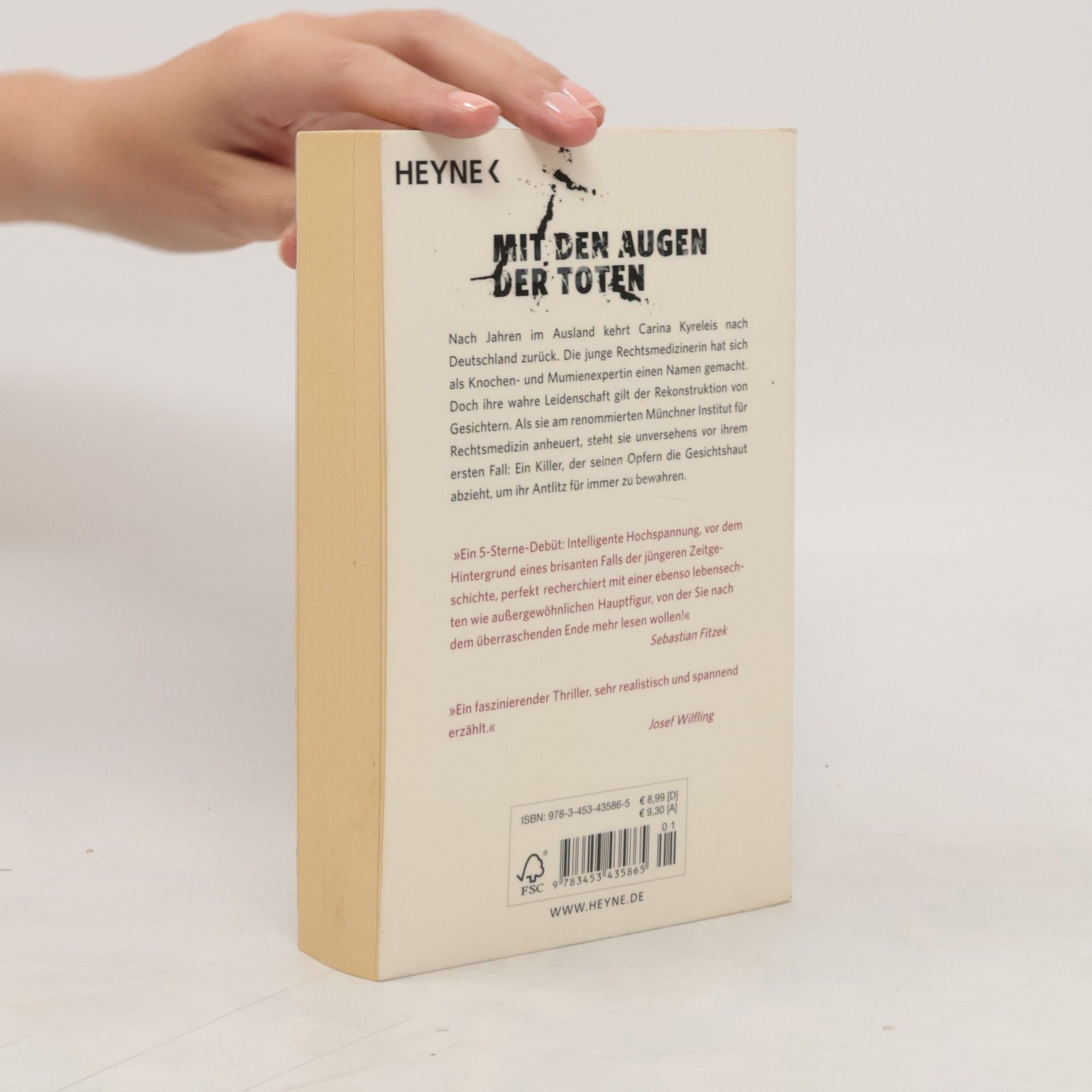 Mit den Augen der Toten Wenn Tote nicht mehr zu erkennen sind, wenn ihr Mörder sie entstellt hat oder nur noch Skelettteile übrig sind, wird Carina Kyreleis gerufen. Die junge Rechtsmedizinerin versteht es wie kaum eine Zweite, den Toten Glanz einzuhauchen und ihnen ihre Gesichter zurückzugeben. Nachdem sie zwei Jahre als Knochen- und Mumienexpertin in Mexiko-Stadt gearbeitet hat, kehrt sie nach Deutschland zurück, um am Münchner Institut für Rechtsmedizin einen Neuanfang zu wagen. Kaum angekommen, steht sie vor ihrem ersten Fall. Ein Killer, der seinen Opfern die Gesichtshaut abzieht, um für immer ihr Antlitz zu bewahren.