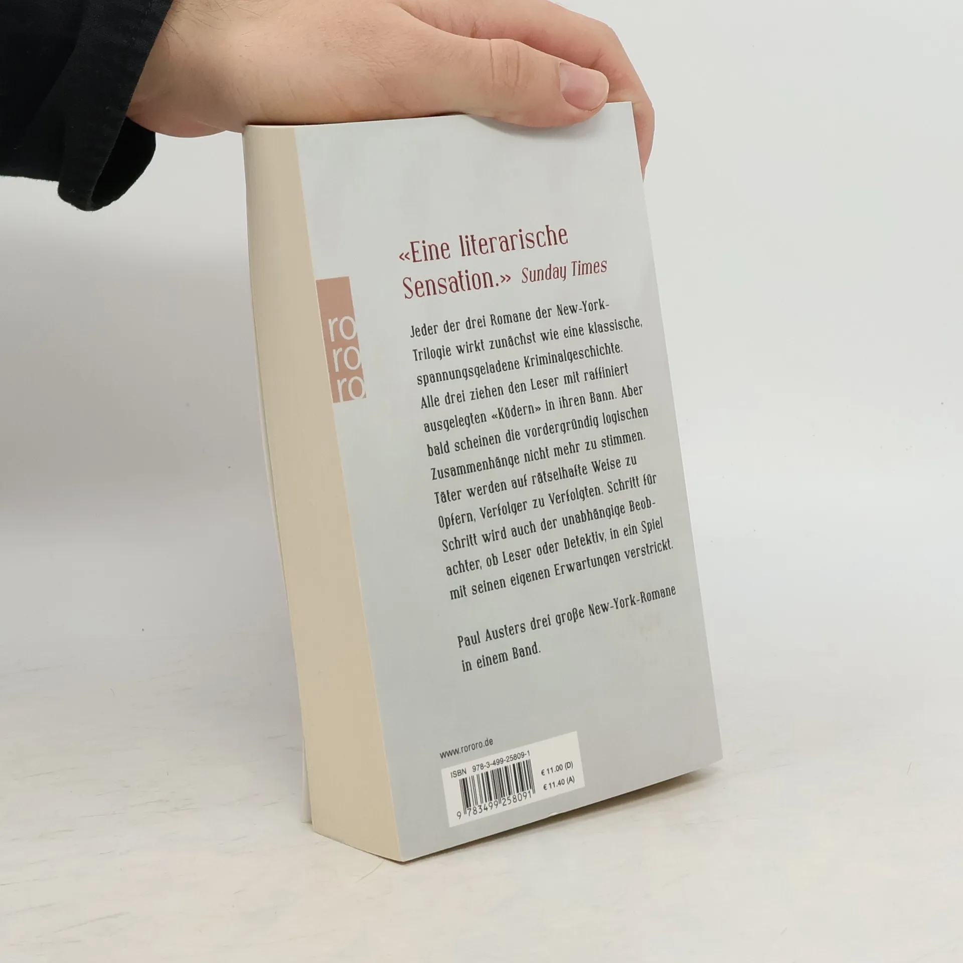 «Eine literarische Sensation.» Sunday Times Jeder der drei Romane der New-York-Trilogie wirkt zunächst wie eine klassische, spannungsgeladene Kriminalgeschichte. Alle drei ziehen den Leser mit raffiniert ausgelegten «Ködern» in ihren Bann. Aber bald scheinen die vordergründig logischen Zusammenhänge nicht mehr zu stimmen. Täter werden auf rätselhafte Weise zu Opfern, Verfolger zu Verfolgten. Schritt für Schritt wird auch der unabhängige Beobachter, ob Leser oder Detektiv, in ein Spiel mit seinen eigenen Erwartungen verstrickt.Paul Austers drei große New-York-Romane in einem Band.