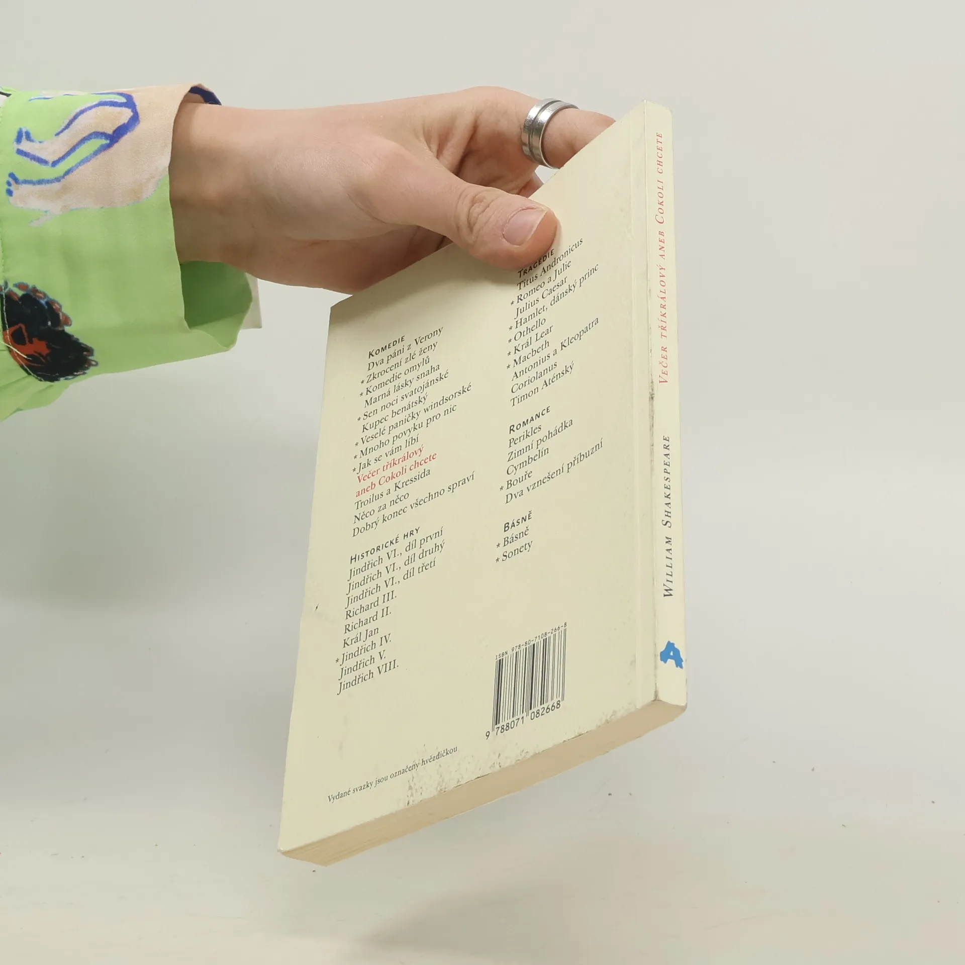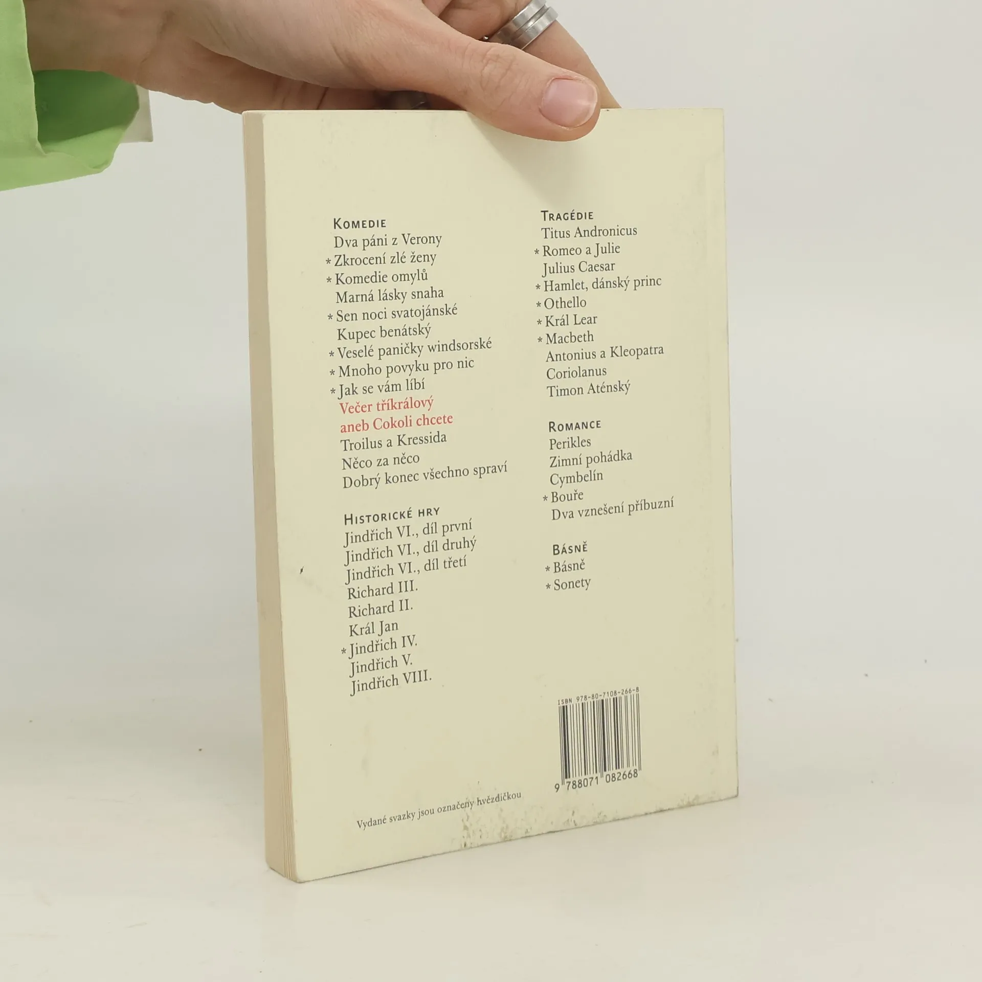 Jedná se o jednu z největších Shakespearových komedií lásky, převleků a zcela zvláštní hudebnosti a přeludovosti. Viola převlečená za Cesaria, pan Tobiáš Říhal či Ondřej Trasořitka, kníže ilyrský Orsino, hraběnka Olivie, samolibí puritán Malvolio a moudrý šašek Feste v ní vytvářejí veselicový svět neustálých proměn i pomíjivosti času. Přeložil Martin Hilský.