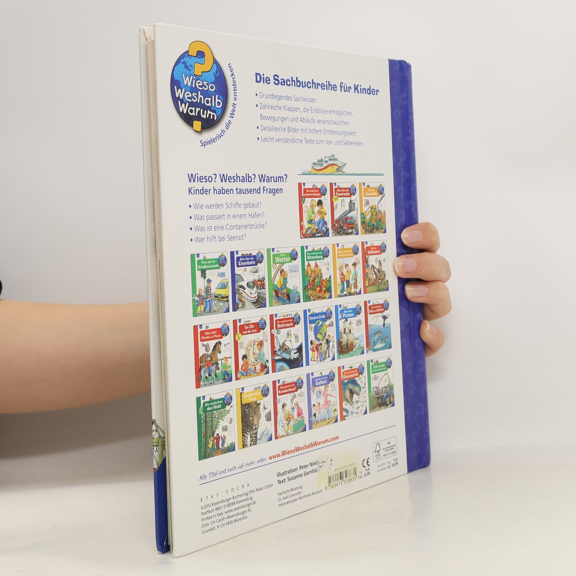 Schiff ahoi! In diesem Buch erfahren Badewannenkapitäne und Technikfans alles rund um die Schifffahrt auf Meeren und Flüssen: Wie werden Schiffe angetrieben und gesteuert? Wer gehört zur Besatzung? Und wer hilft bei Seenot? Mithilfe spannender Klappen erkunden die Kinder eine Werft und einen Containerhafen, wie Schiffe getauft werden und wie Schleusen funktionieren. Außerdem lernen sie das Flaggenalphabet kennen und erfahren, wie man die wichtigsten Knoten knüpft. Wieso? Weshalb? Warum? Die Sachbuchreihe für Kinder von 4–7 Jahren Jeden Tag entdecken Kinder etwas Neues – da kommen viele Fragen auf. Warum sind die Dinosaurier ausgestorben? Wo ist die Sonne in der Nacht? Wozu brauchen wir das Blut? Die beliebte Sachbuchreihe Wieso? Weshalb? Warum? gibt Kindern Antworten auf Augenhöhe. Dabei werden die unterschiedlichsten Themen aus der Alltags- und Interessenswelt der Kinder altersgerecht und mit viel Liebe zum Detail unter die Lupe genommen. Detailreiche Bilder, verständliche Sachtexte und überraschende Klappen, die Bewegungen oder Abläufe veranschaulichen und hinter die Dinge blicken lassen, ermöglichen Kindern, sich ihre Themen selbst zu erschließen. Der Spaß am eigenhändigen Entdecken, die liebevolle Umsetzung und die qualitativ hochwertige Ausstattung garantieren langanhaltende Freude an jedem einzelnen Buch.