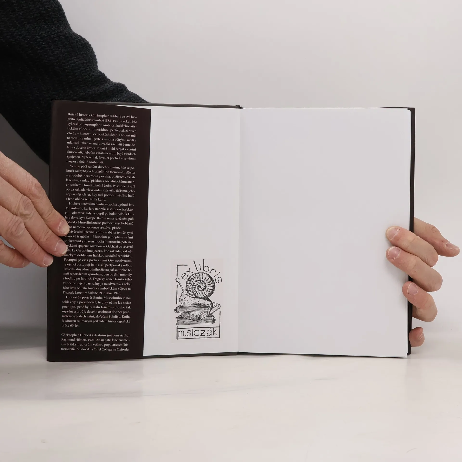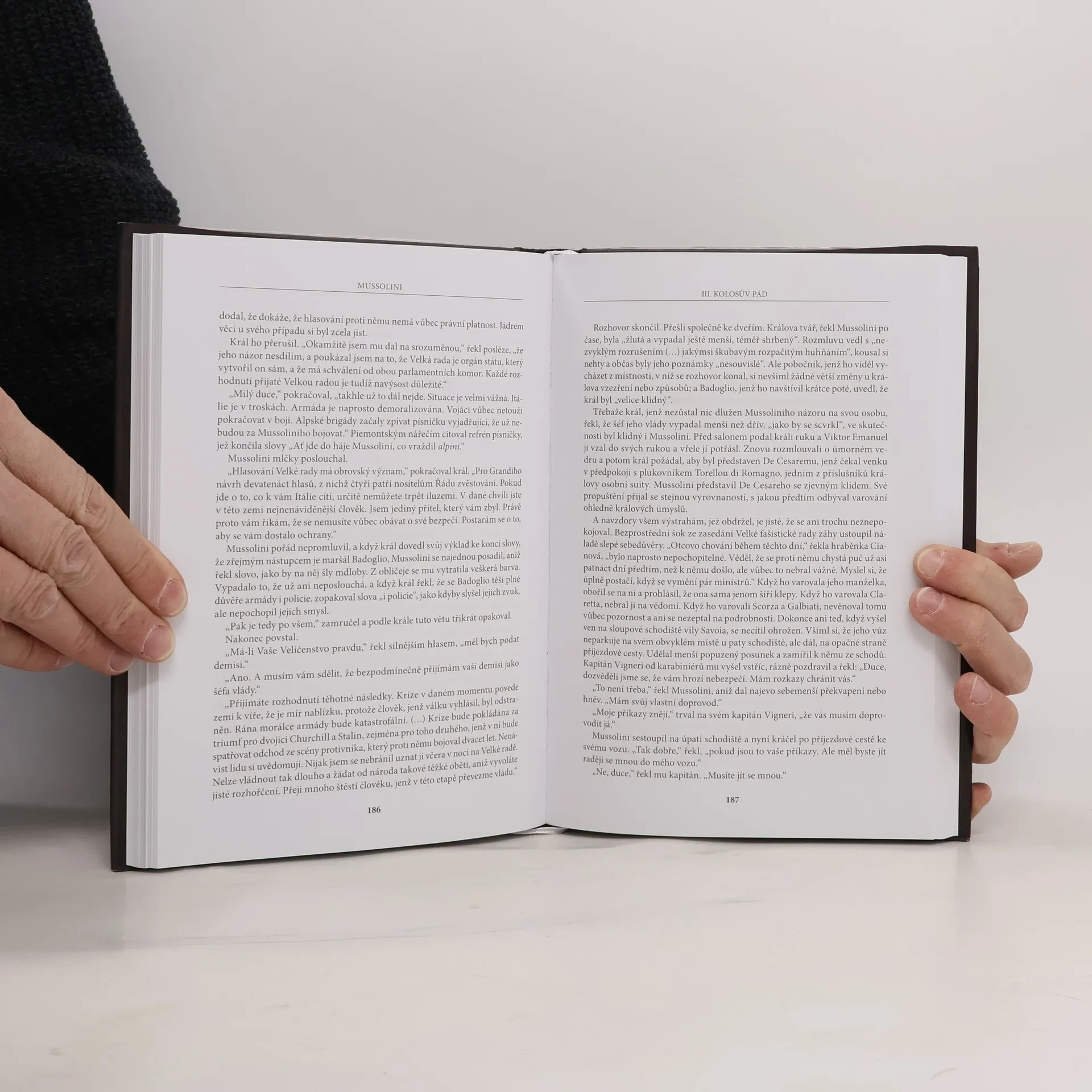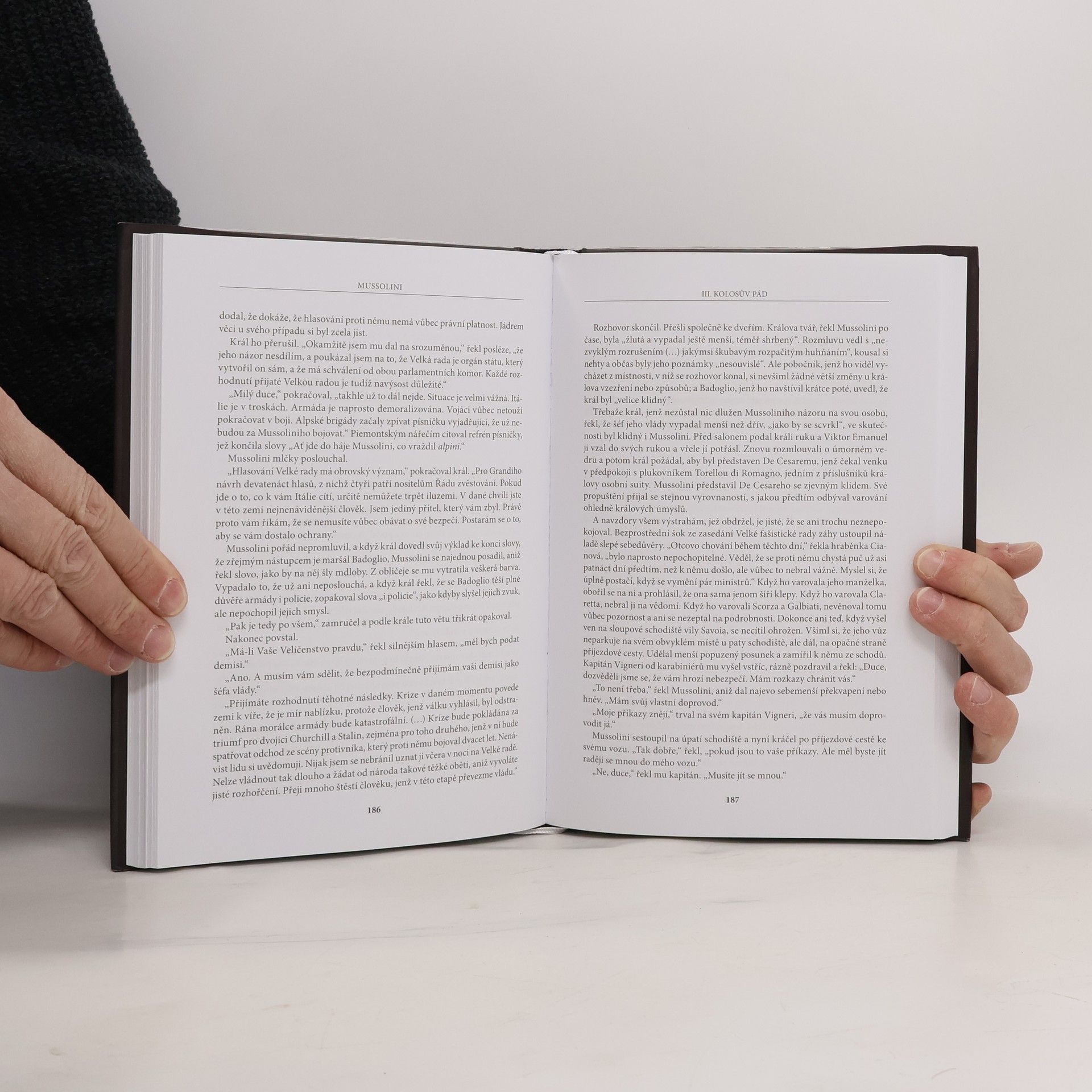 Britský historik Christopher Hibbert vykresluje rozporuplnou osobnost italského fašistického vůdce Benita Mussoliniho s mimořádnou pečlivostí, zároveň čtivě a poučeně, jak je ostatně jeho zvykem. Mussolini se narodil v neděli odpoledne v roce 1888 ve středoitalské vesnici. V sobotu odpoledne v roce 1945 byl zastřelen komunistickými partyzány na břehu Comského jezera. Behem šedesáti dvou let mezi těmito dvěma osudovými odpoledni prožil italský duce život tak dramatický, že se mu v moderních dějinách málokdo vyrovná. Hibbert mapuje Mussoliniho nezastavitelnou cestu k moci a drobné nuance fašistické ideologie, již Mussolini stvořil. Zamýšlí se i nad stopami, které Mussolini zanechal v soudobém myšlení a ptá se, proč je tato osobnost v Itálii dodnes předmětem vypjatých vášní, zlořečení i úcty..