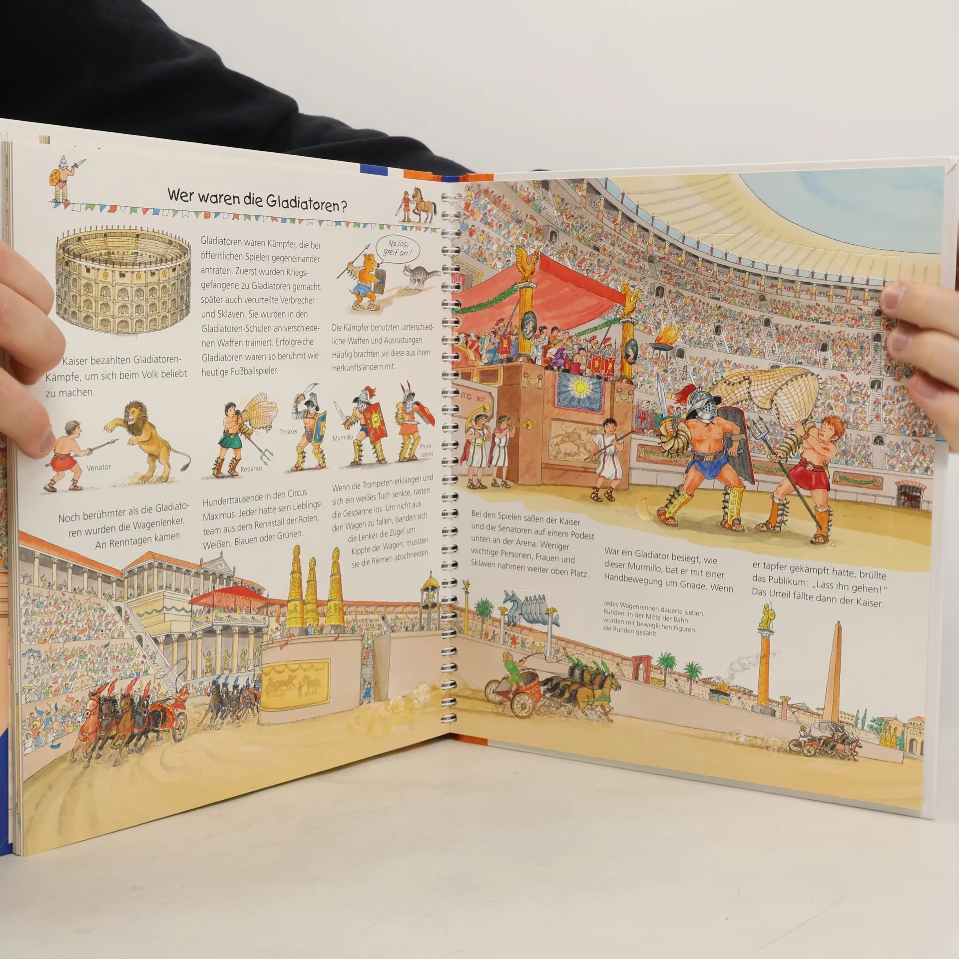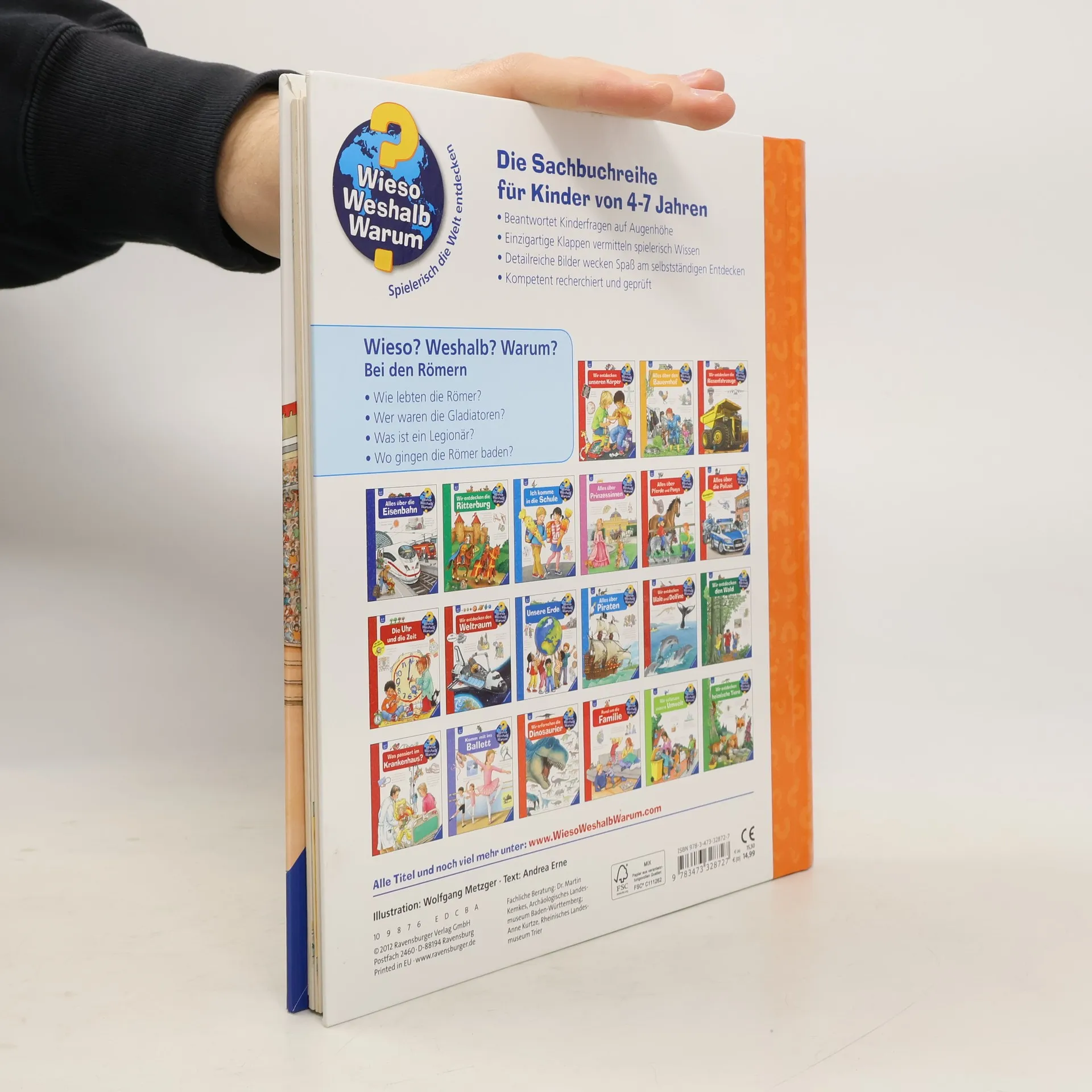 Eintauchen in das bunte Treiben der antiken Großstadt: Hier wandeln Kinder zwischen Händlern, Sklaven und Senatoren durch Roms Straßen. Dabei entdecken sie, wie unterschiedlich arme und reiche Römer lebten und womit ihre Kinder spielten. Sie besuchen die Gladiatoren in der Arena und ein römisches Heerlager. Klappen bieten spannende Einblicke in ein Legionärszelt, den Circus Maximus oder eine Therme. So wird die römische Kultur lebendig erfahrbar. Wieso? Weshalb? Warum? Die Sachbuchreihe für Kinder von 4–7 Jahren Jeden Tag entdecken Kinder etwas Neues – da kommen viele Fragen auf. Warum sind die Dinosaurier ausgestorben? Wo ist die Sonne in der Nacht? Wozu brauchen wir das Blut? Die beliebte Sachbuchreihe Wieso? Weshalb? Warum? gibt Kindern Antworten auf Augenhöhe. Dabei werden die unterschiedlichsten Themen aus der Alltags- und Interessenswelt der Kinder altersgerecht und mit viel Liebe zum Detail unter die Lupe genommen. Detailreiche Bilder, verständliche Sachtexte und überraschende Klappen, die Bewegungen oder Abläufe veranschaulichen und hinter die Dinge blicken lassen, ermöglichen Kindern, sich ihre Themen selbst zu erschließen. Der Spaß am eigenhändigen Entdecken, die liebevolle Umsetzung und die qualitativ hochwertige Ausstattung garantieren langanhaltende Freude an jedem einzelnen Buch.