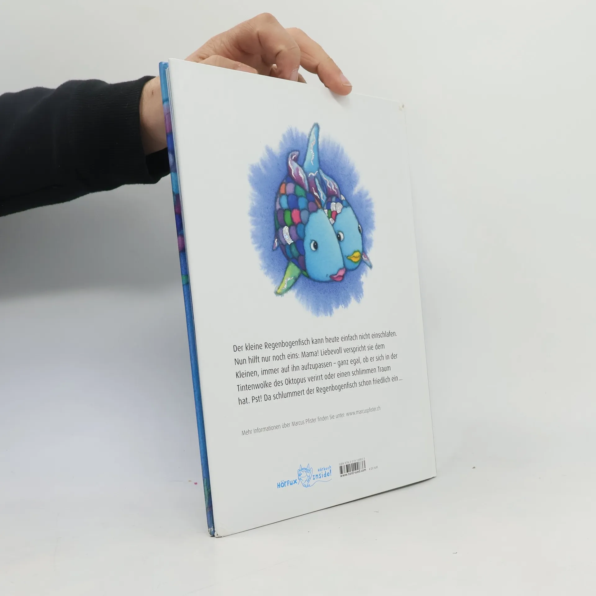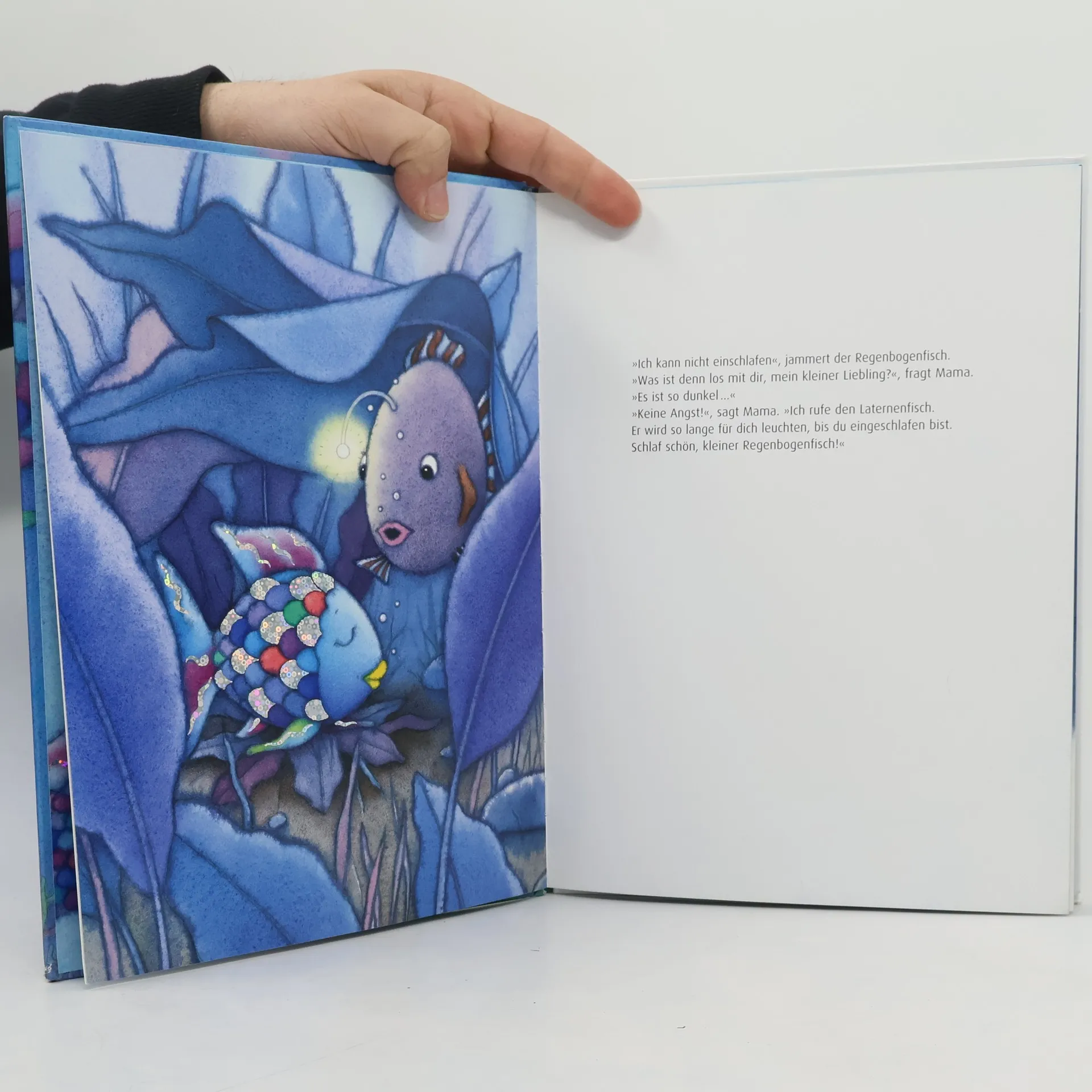 Der kleine Regenbogenfisch kann heute einfach nicht einschlafen, weil er sich fürchtet. Nun hilft nur noch eins: Mama! Liebevoll verspricht sie dem Kleinen, immer auf ihn aufzupassen – ganz egal, ob er sich in der Tintenwolke des Oktopus verirrt oder einen schlimmen Traum hat. Pst! Da schlummert der Regenbogenfisch schon friedlich ein …