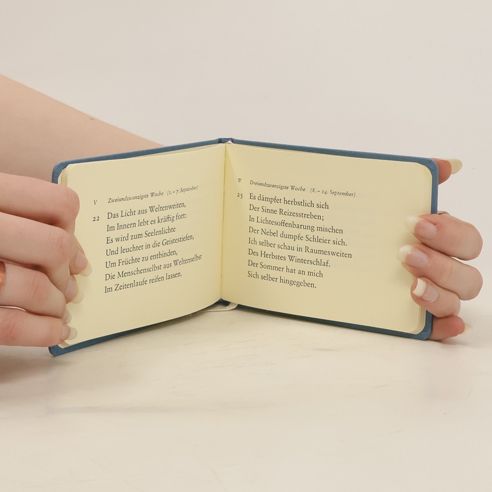 Vor 100 Jahren ist der anthroposophische Seelenkalender zum ersten Mal erschienen. Diese Sammlung von 52 Sprüchen, die das Verhältnis der Seele zur Natur in ihren jahreszeitlichen Metamorphosen zum Aus- druck bringt, begleitet viele Menschen und Gemeinschaften weltweit. Zum Jubiläum wird es den Seelenka- lender nun auch als Tischkalender zum Aufstellen geben. Vorne mit dem aktuellen Spruch, auf der Rück- seite mit dem Gegenspruch. Damit erhalten die Sprüche Präsenz und Öffentlichkeit und begleiten den Alltag auf neue Weise. Ob auf dem Schreibtisch, der Kommode, dem Konferenz- oder Nachttisch: Mit dem neuen Tischmodell des Seelenkalenders zieht meditative Stimmung in den Alltag ein.