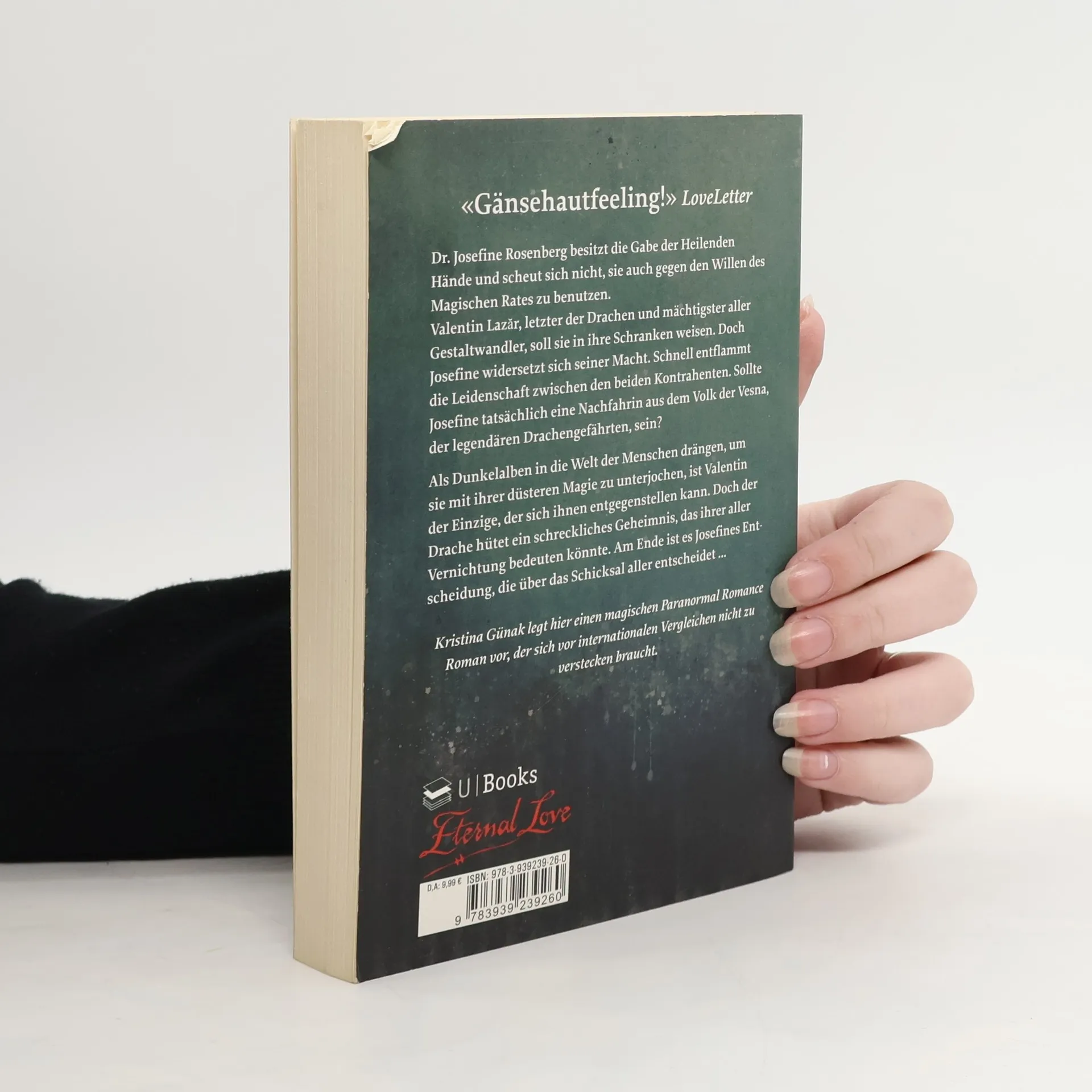 Dr. Josefine Rosenberg besitzt die Gabe der heilenden Hände und scheut sich nicht, sie auch gegen den Willen des Magischen Rates zu benutzen. Valentin Lazăr, mächtigster aller Gestaltwandler, soll sie in ihre Schranken weisen. Doch Josefine widersetzt sich seiner Macht. Schnell entflammt die Leidenschaft zwischen den beiden Kontrahenten. Sollte Josefine tatsächlich eine Nachfahrin aus dem Volk der Vesna, der legendären Drachengefährten, sein? Als Dunkelalben in die Welt der Menschen drängen, um sie mit ihrer düsteren Magie zu unterjochen, ist Valentin der Einzige, der sich ihnen entgegenstellen kann. Josefine ist bereit, an der Seite ihres Geliebten zu kämpfen. Doch der Drache hütet ein schreckliches Geheimnis, das ihrer aller Vernichtung bedeuten könnte. Kristina Günak legt hier einen magischen Paranormal Romance Roman vor, der sich vor internationalen Vergleichen nicht zu vertecken braucht. Actionreich, romantisch und mit großem Können erzählt sie hier eine wundervolle Geschichte.