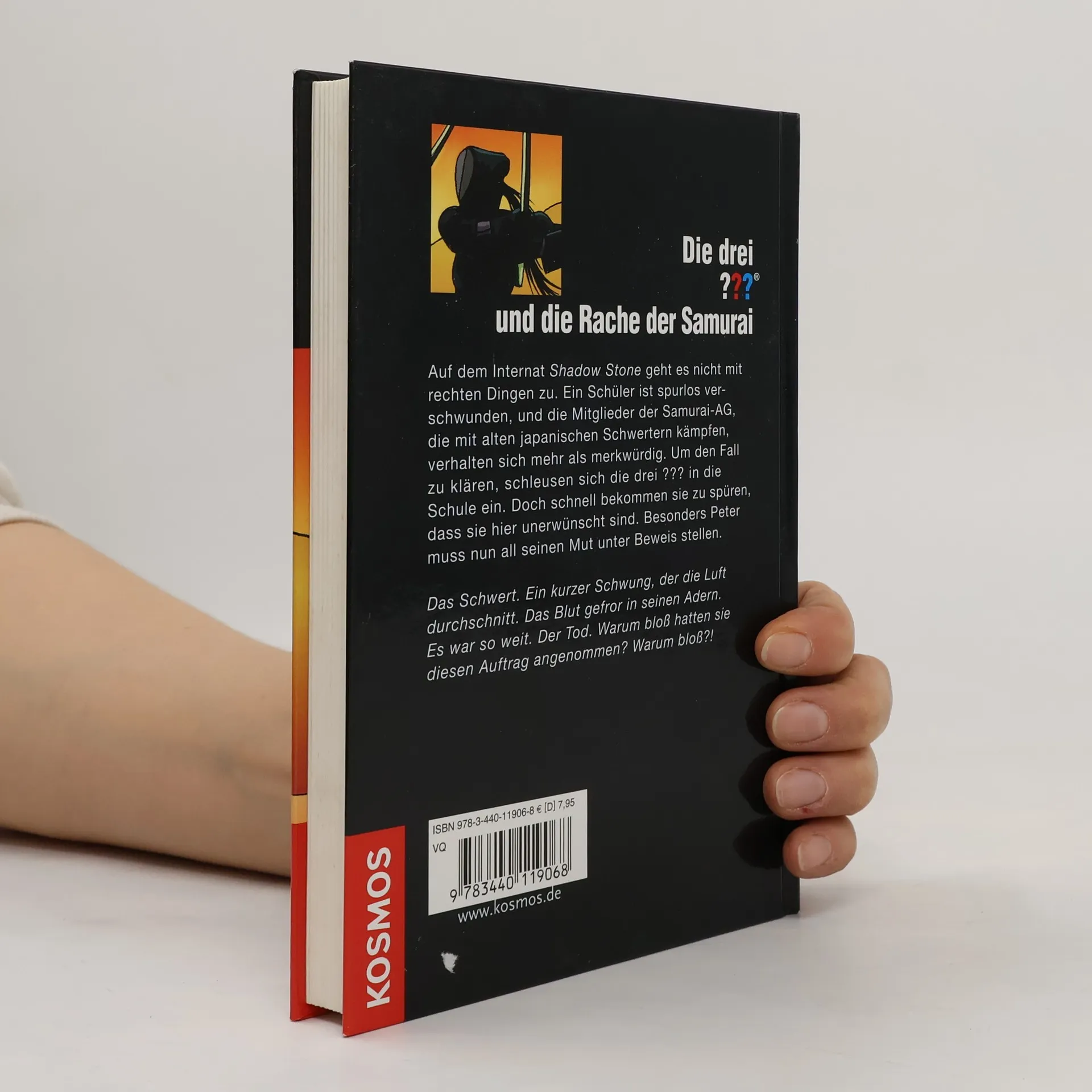 Auf dem Internat „Shadow Stone“ geht es nicht mit rechten Dingen zu. Ein Schüler ist spurlos verschwunden, und die Mitglieder der Samurai-AG, die mit alten japanischen Schwertern kämpfen, verhalten sich mehr als merkwürdig. Um den Fall zu klären, schleusen sich die drei ??? in die Schule ein. Doch schnell bekommen sie zu spüren, dass sie hier unerwünscht sind. Besonders Peter muss nun all seinen Mut unter Beweis stellen: Das Schwert. Ein kurzer Schwung, der die Luft durchschnitt. Das Blut gefror in seinen Adern. Es war so weit. Der Tod. Warum bloß hatten sie diesen Auftrag angenommen? Warum bloß?!