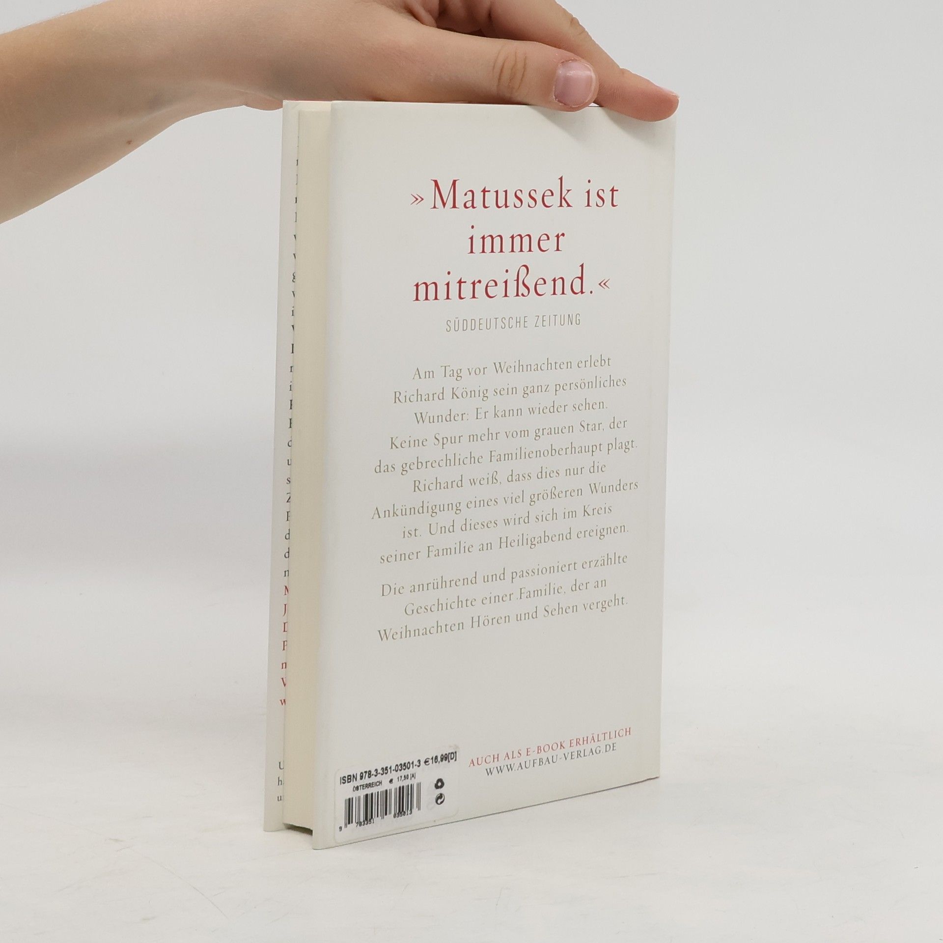 „Matussek ist immer mitreißend.“ Süddeutsche Zeitung In Richard Königs Haus laufen die Weihnachtsvorbereitungen auf Hochtouren. Doch Weihnachten ist weiß Gott nicht mehr das, was es einmal war, und auch Richard ist nicht mehr der, der er einmal war. Ihn plagt der graue Star, und er wartet auf die Ankunft Gottes in dieser gottlosen Finsternis. Als er plötzlich wieder sehen kann, weiß er, dass Gott ihm ein Zeichen gesandt hat. Seine Frau Waltraud dagegen möchte das Fest der Liebe feiern. Doch das Weihnachtsmahl missrät gründlich. Die Schwiegertochter ist in anderen Umständen, der Sohn Roman, ein impulsiver Journalist, hat den Halt und seine Frau verloren. Nur Nick, der 14-jährige Enkel, ist anders. Tief, klug und frühreif - ein bisschen wie Richard selbst, damals im Berlin der 30er Jahre. Zur heiligen Stunde scheint sich Richards Prophezeiung zu erfüllen: Plötzlich sind da Rauch und Licht und eine Gestalt, die wahrlich überirdisch und gewiss nicht gottlos ist. Die anrührend und passioniert erzählte Geschichte einer Familie, der an Weihnachten Hören und Sehen vergeht. Matthias Matussek ist ein engagierter Journalist und vielzitierter Erfolgsautor. Dass er auch ein Erzähler mit Witz und Passion ist, beweist er mit dieser Geschichte, mit der er seiner Lebensfrage nachgeht: Warum glauben wir eigentlich nicht, was wir doch sehen?