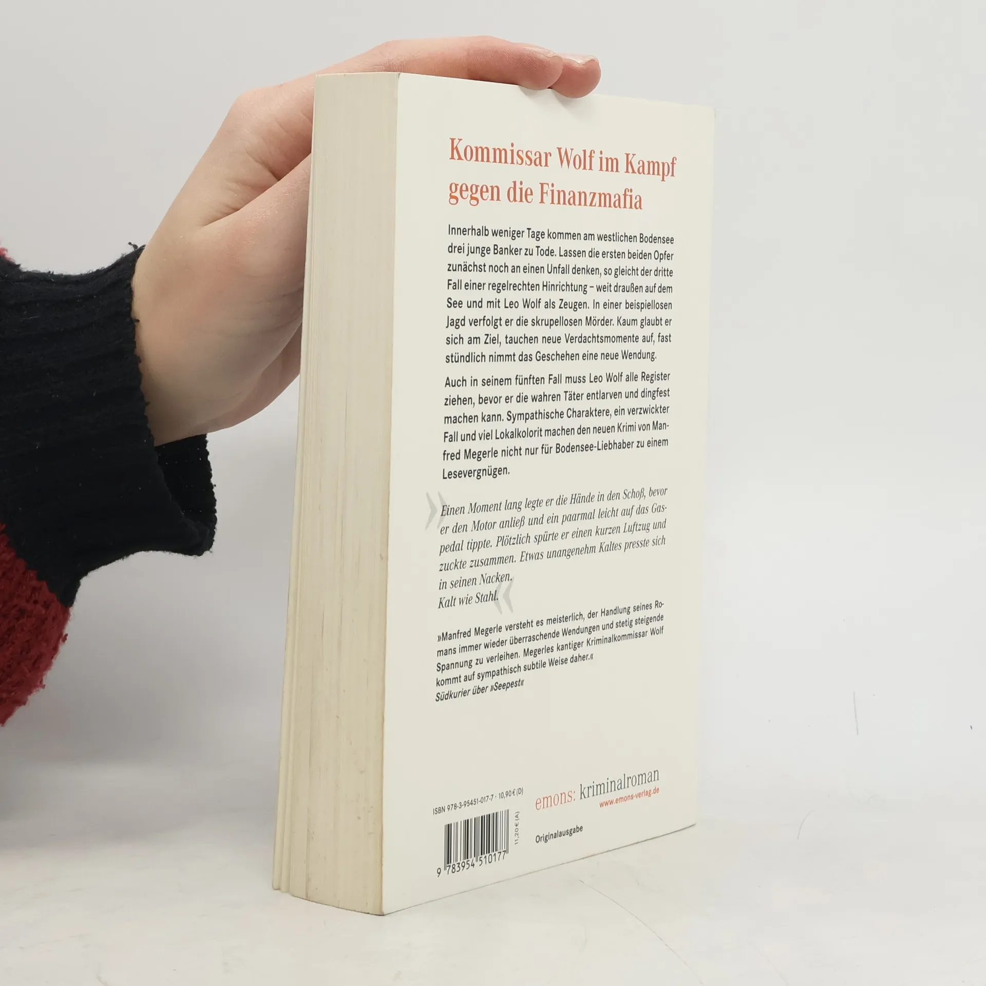 Innerhalb weniger Tage kommen am westlichen Bodensee drei junge Banker zu Tode. Lassen die ersten beiden Opfer zunächst noch an einen Unfall denken, so gleicht der dritte Fall einer regelrechten Hinrichtung – weit draußen auf dem See – und mit Leo Wolf als Zeugen. In einer beispiellosen Jagd verfolgt er die skrupellosen Mörder. Kaum glaubt er sich am Ziel, tauchen neue Verdachtsmomente auf, fast stündlich nimmt das Geschehen eine neue Wendung. Auch in seinem fünften Fall muss Leo Wolf alle Register ziehen, bevor er die wahren Täter entlarven und dingfest machen kann. Sympathische Charaktere, ein verzwickter Fall und viel Lokalkolorit machen den neuen Krimi von Manfred Megerle nicht nur für Bodensee-Liebhaber zu einem Lesevergnügen.