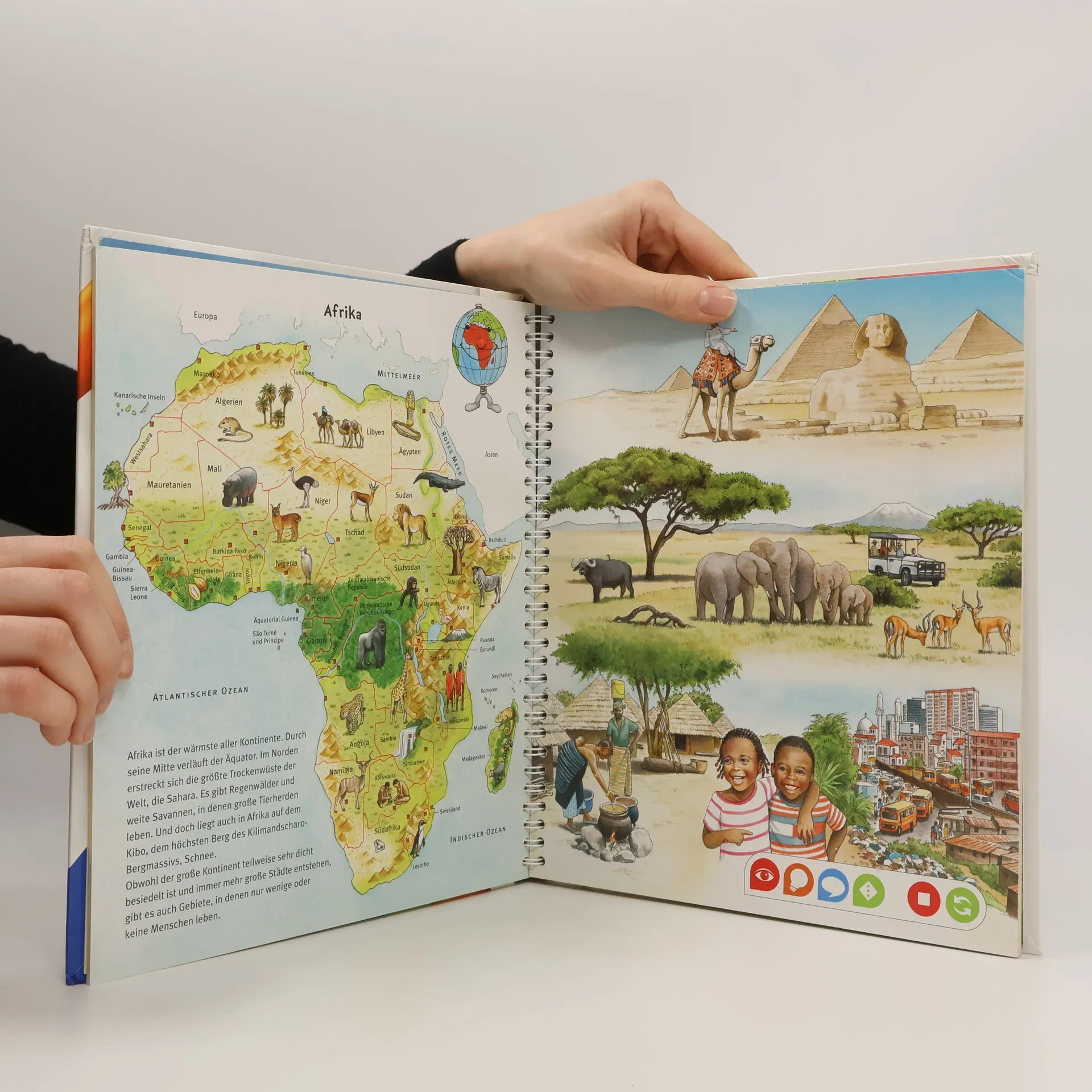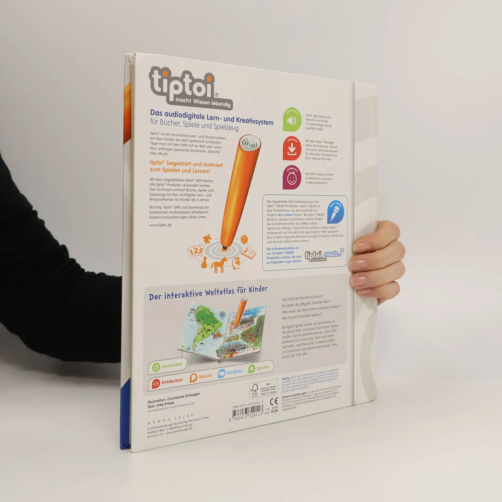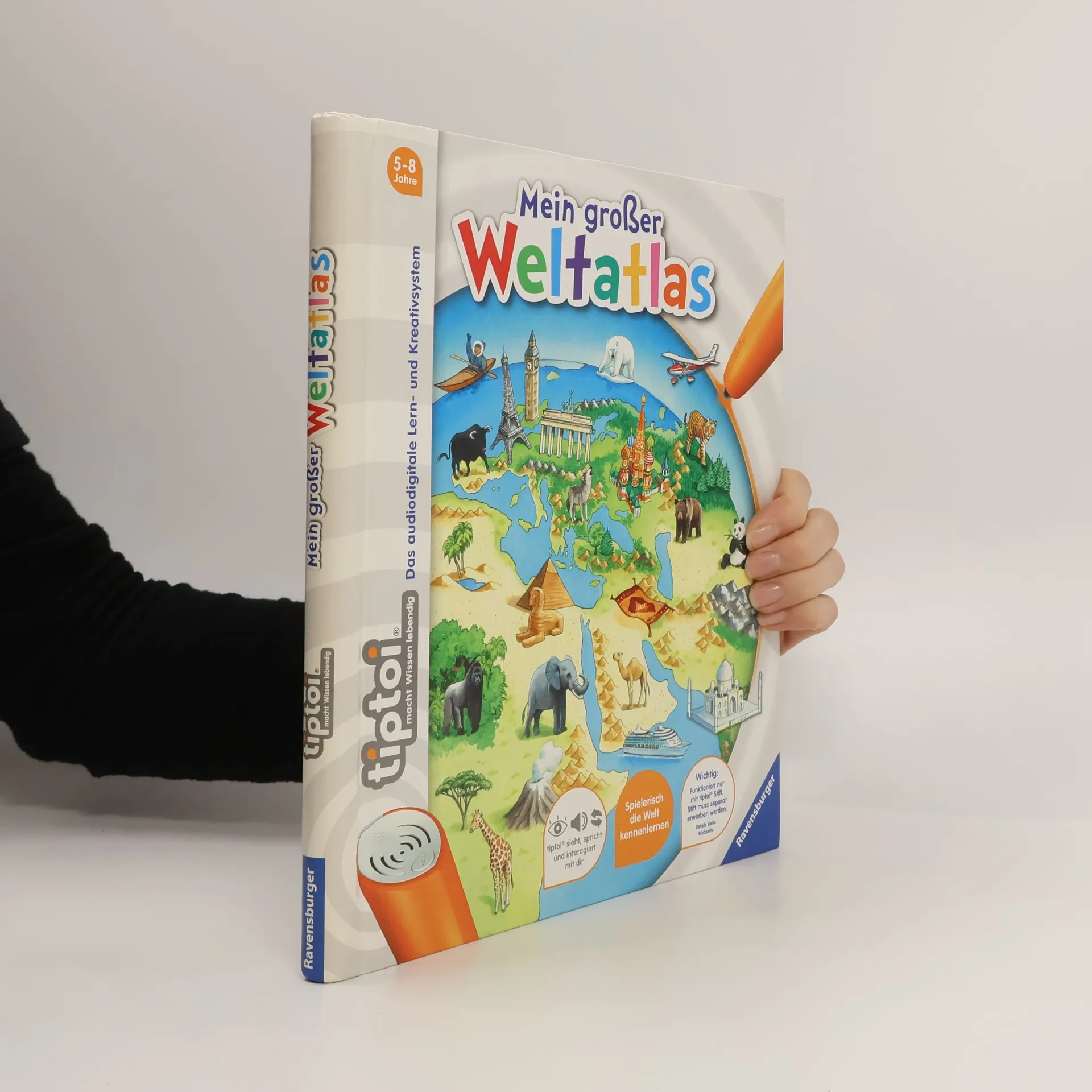 Mit tiptoi auf Weltreise Ferne Länder und Meere, Tiere und Landschaften. Wo liegt Europa? Was isst man in Asien? Wo leben die giftigsten Tiere? Kontinent für Kontinent wird im Detail vorgestellt. Exotische Tiere, fremde Sprachen, berühmte Bauwerke, landestypische Melodien und vieles mehr können entdeckt und erlebt werden. Außerdem wird auch das Kartenlesen vermittelt. So können die Kinder mit dem tiptoi-Stift selbstständig auf eine interaktive Weltreise gehen. Mein großer Weltatlas bietet Sachwissen auf Augenhöhe. Die Kinder können sich dank der einfachen und intuitiven Nutzung mit dem tiptoi-Stift das Wissen selbst erschließen. Geschichten, Lieder und Spiele laden dabei immer wieder zum selbstständigen Entdecken und Erforschen ein.