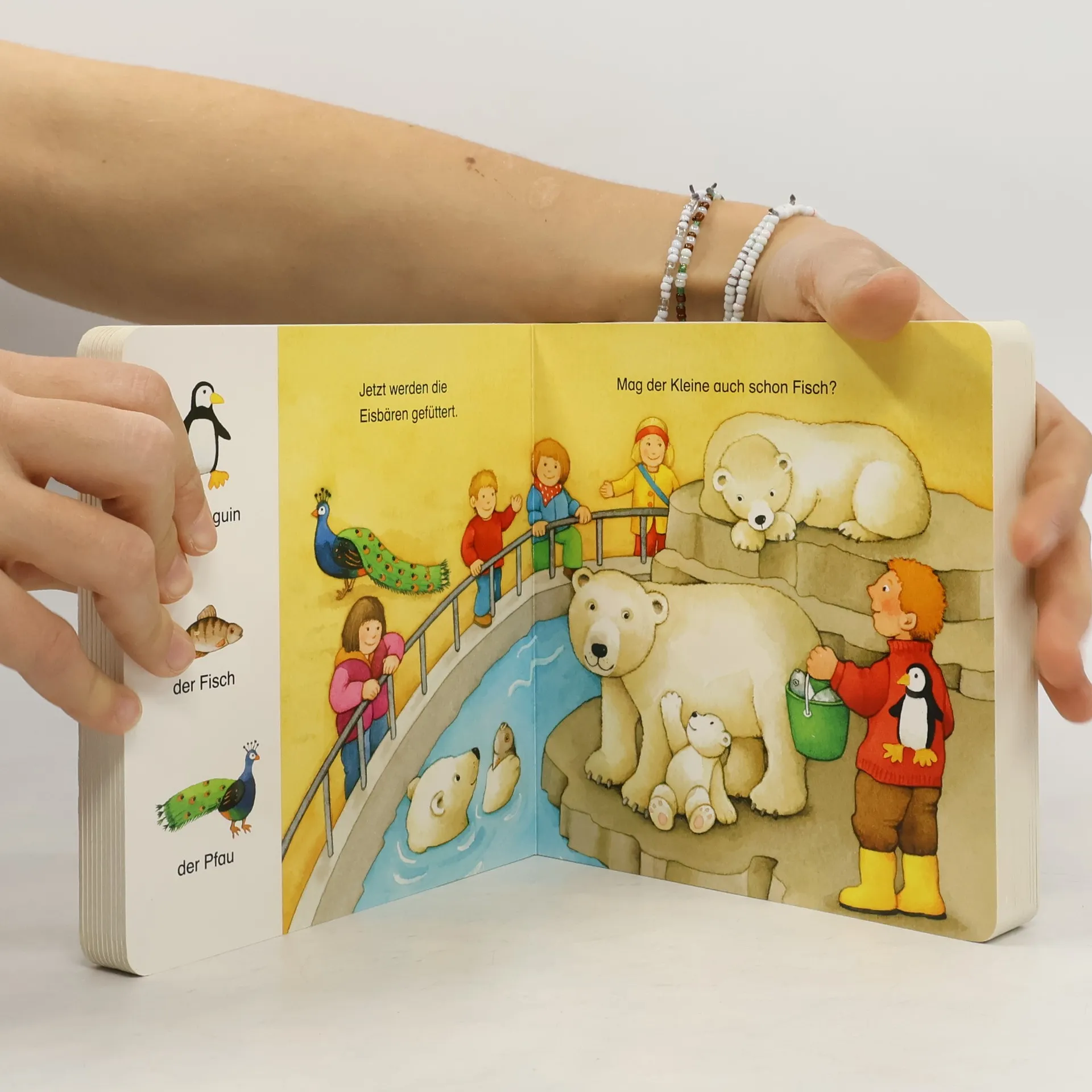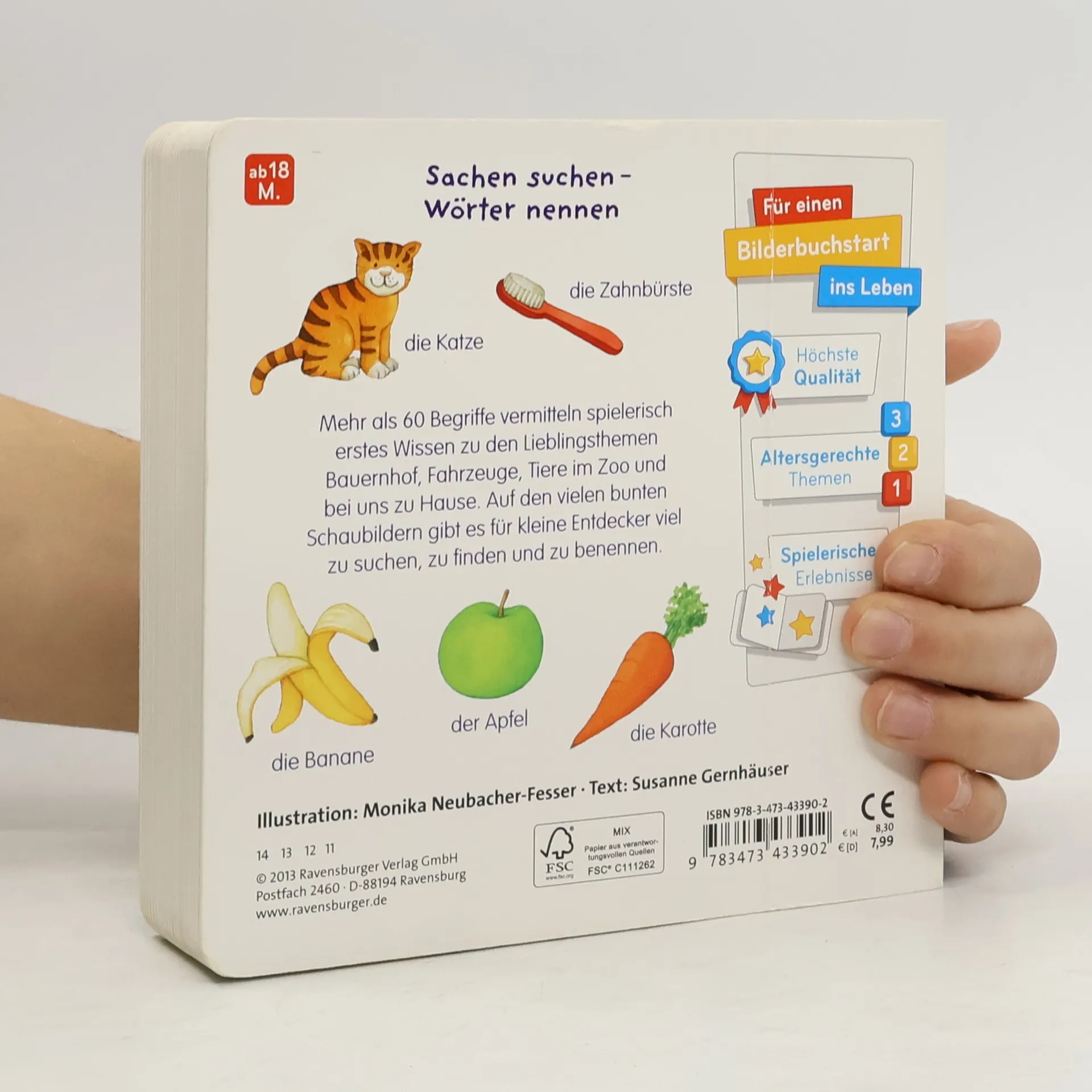 Ein Bilderbuch bei dem es viel zu entdecken gibt. Im Wechsel von großen Illustrationen und kleinen Detailbildern können Kinder Fahrzeuge, Tiere, Gegenstände und Menschen suchen, erkennen und benennen. Mehr als 60 Begriffe vermitteln spielerisch erstes Wissen zu den Lieblingsthemen Bauernhof, Fahrzeuge, Tiere im Zoo und bei uns zu Hause.