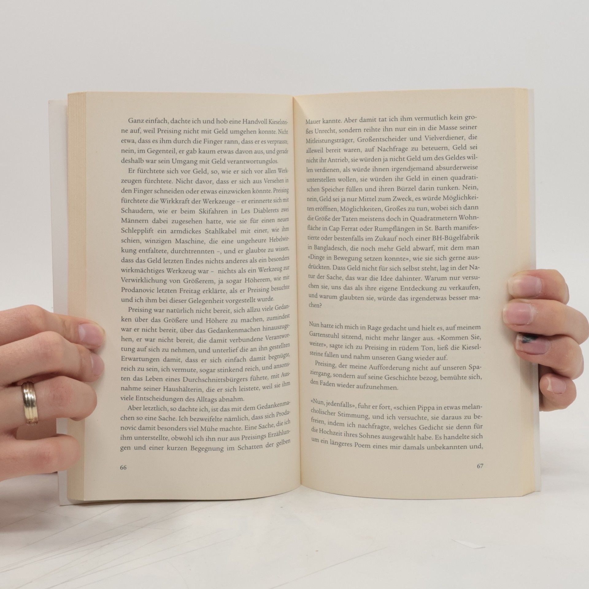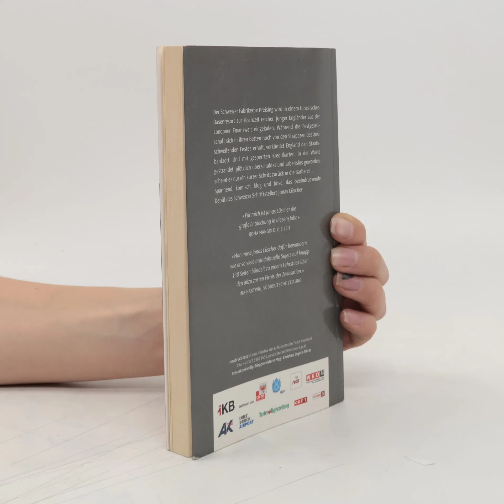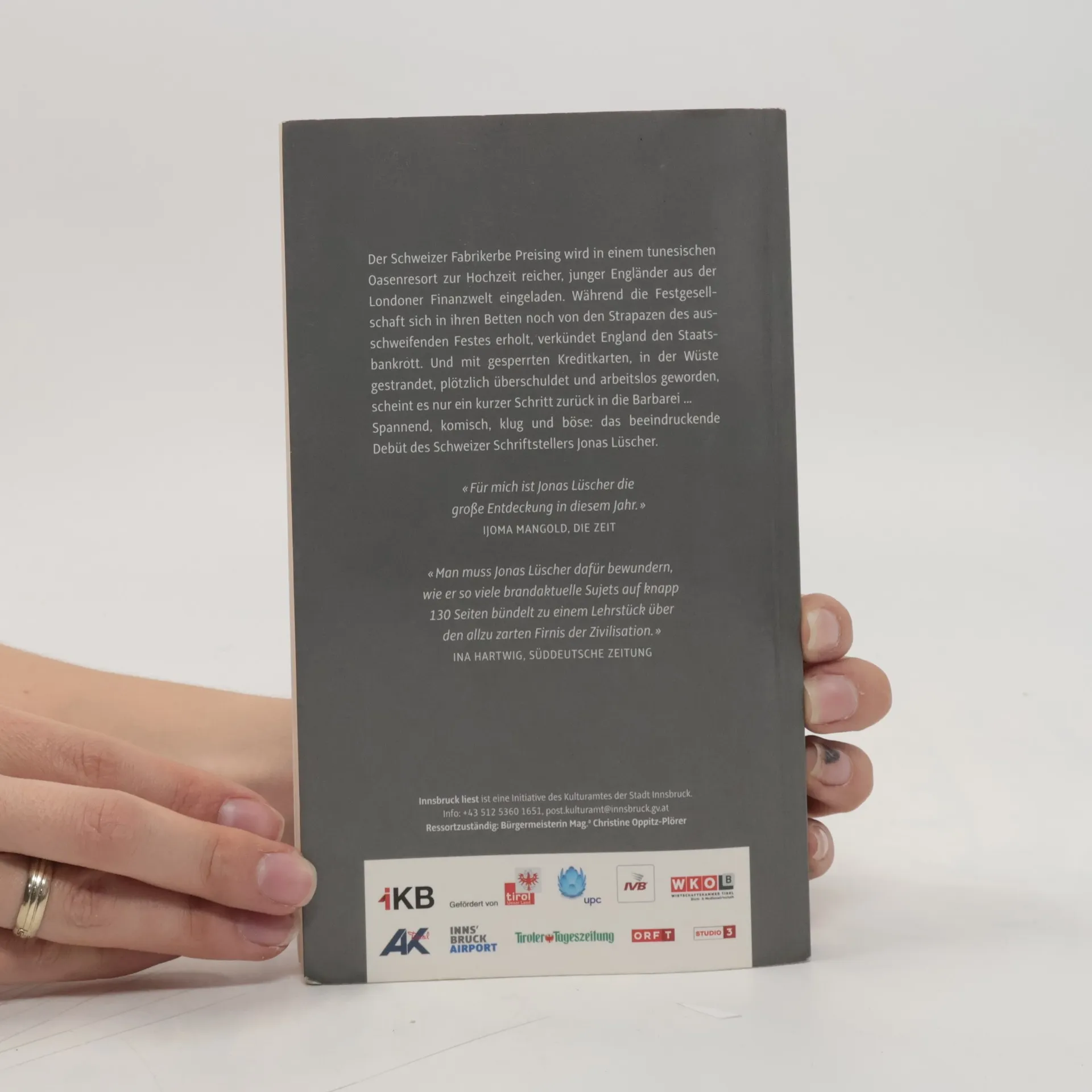 Der Protagonist dieser raffiniert gebauten Debütnovelle von Jonas Lüscher, der Schweizer Fabrikerbe Preising, wird auf einer Geschäftsreise in einem gehobenen tunesischen Oasenresort Zeuge aufwendiger Hochzeitsvorbereitungen. Reiche junge Engländer aus der Londoner Finanzwelt haben Freunde und Familie für ein großes Fest um sich versammelt und feiern schon im Voraus ausschweifend, als sich die wirtschaftlichen Krisensignale zur Katastrophe verdichten: Das britische Pfund stürzt ab, kurz danach ist England bankrott, mit unabsehbaren Folgen, die auch Tunesien nicht unberührt lassen. Preising, als Schweizer zwar von den schlimmsten Folgen ausgenommen, muss miterleben, wie dünn die Decke der Zivilisation ist, und lernt seine ganz eigene Lektion in Globalisierung, denn seine Firma lässt in Tunesien fertigen. Auch Preising bleibt nicht ungeschoren. Spannend, klug konstruiert, durchaus auch komisch, mit unvergesslichen Bildern und einer reichen, beweglichen Sprache erzählt, seziert dieses Buch menschliche Schwächen und zielt dabei mitten ins Herz der Gegenwart.