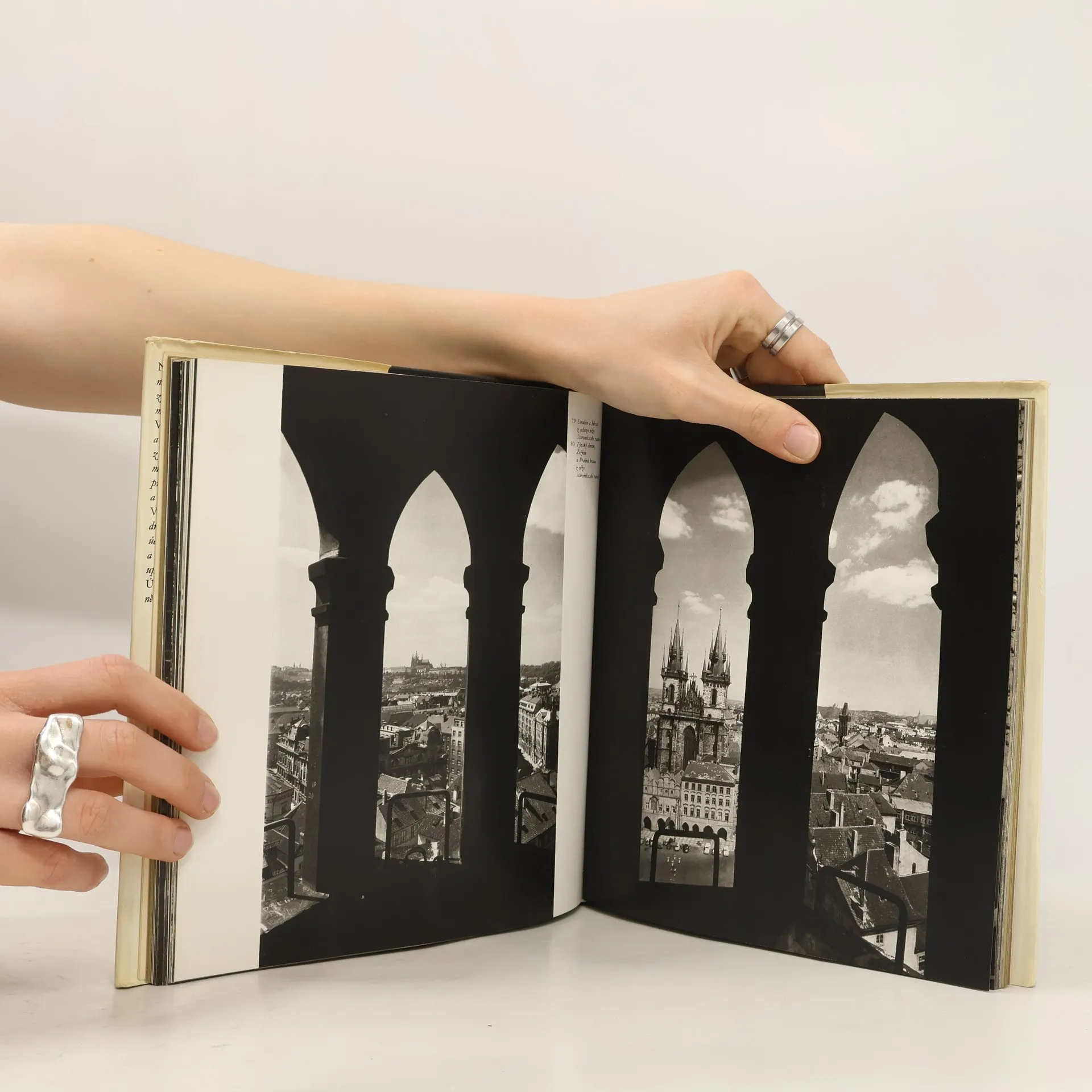 Ilustrovaná kniha, obrázky míst Prahy. Na stránkách publikace lze spatřit jednak věže historické části Prahy, do níž tu spadá Hrad, Hradčany, Malá Strana a Staré i Nové Město, a jednak výhledy z těchto věžních prostorů. Celkem 135 snímků zastihuje sice některé obvyklé pohledy, ale častěji jsou zde půvabná pražská místa objevována z neobyčejného zorného úhlu. Jeden objekt bývá zpravidla pozorován z různých stran a rovin. K obrazům je připojeno krátké průvodní slovo.