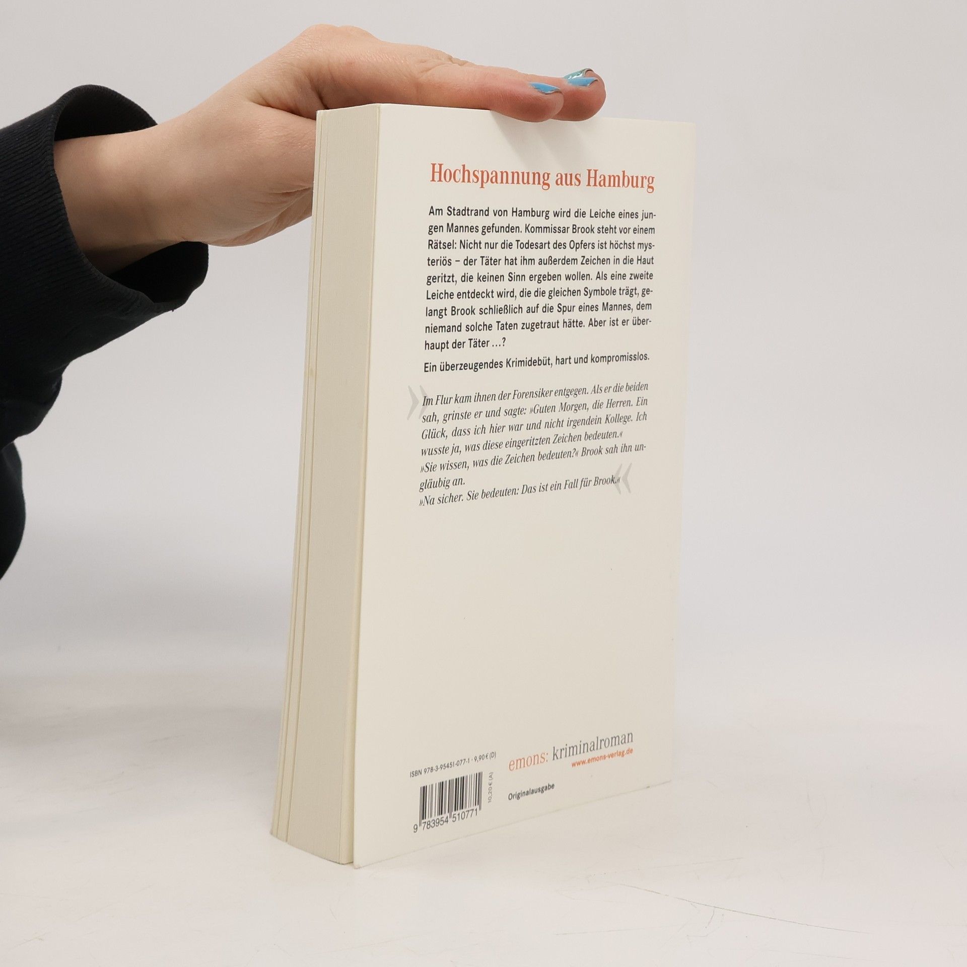 Am Stadtrand von Hamburg wird die Leiche eines jungen Mannes gefunden. Kommissar Brook steht vor einem Rätsel: Nicht nur die Todesart des Opfers ist höchst mysteriös – der Täter hat ihm außerdem Zeichen in die Haut geritzt, die keinen Sinn ergeben wollen. Als eine zweite Leiche entdeckt wird, die die gleichen Symbole trägt, gelangt Brook schließlich auf die Spur eines Mannes, dem niemand solche Taten zugetraut hätte. Aber ist er überhaupt der Täter.?