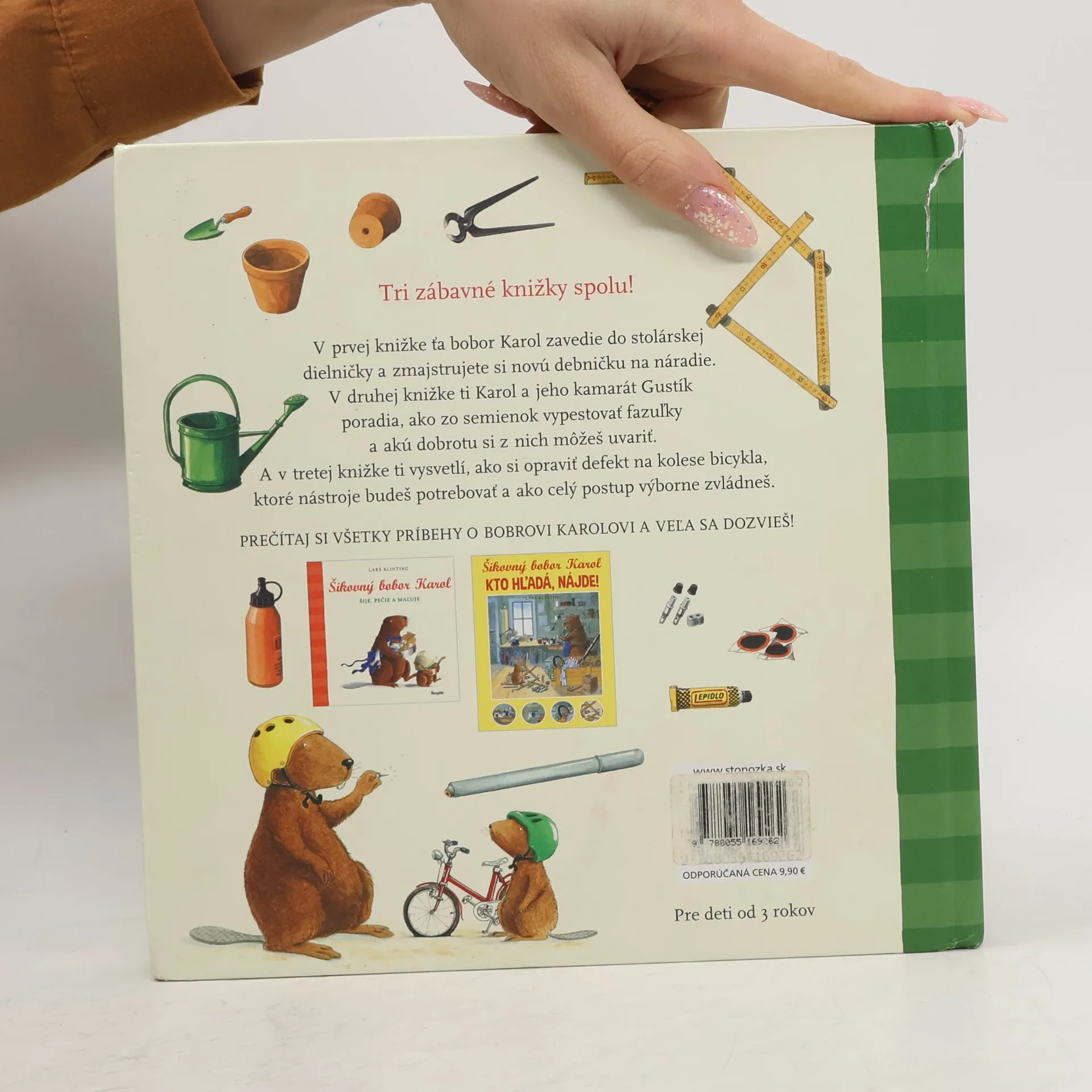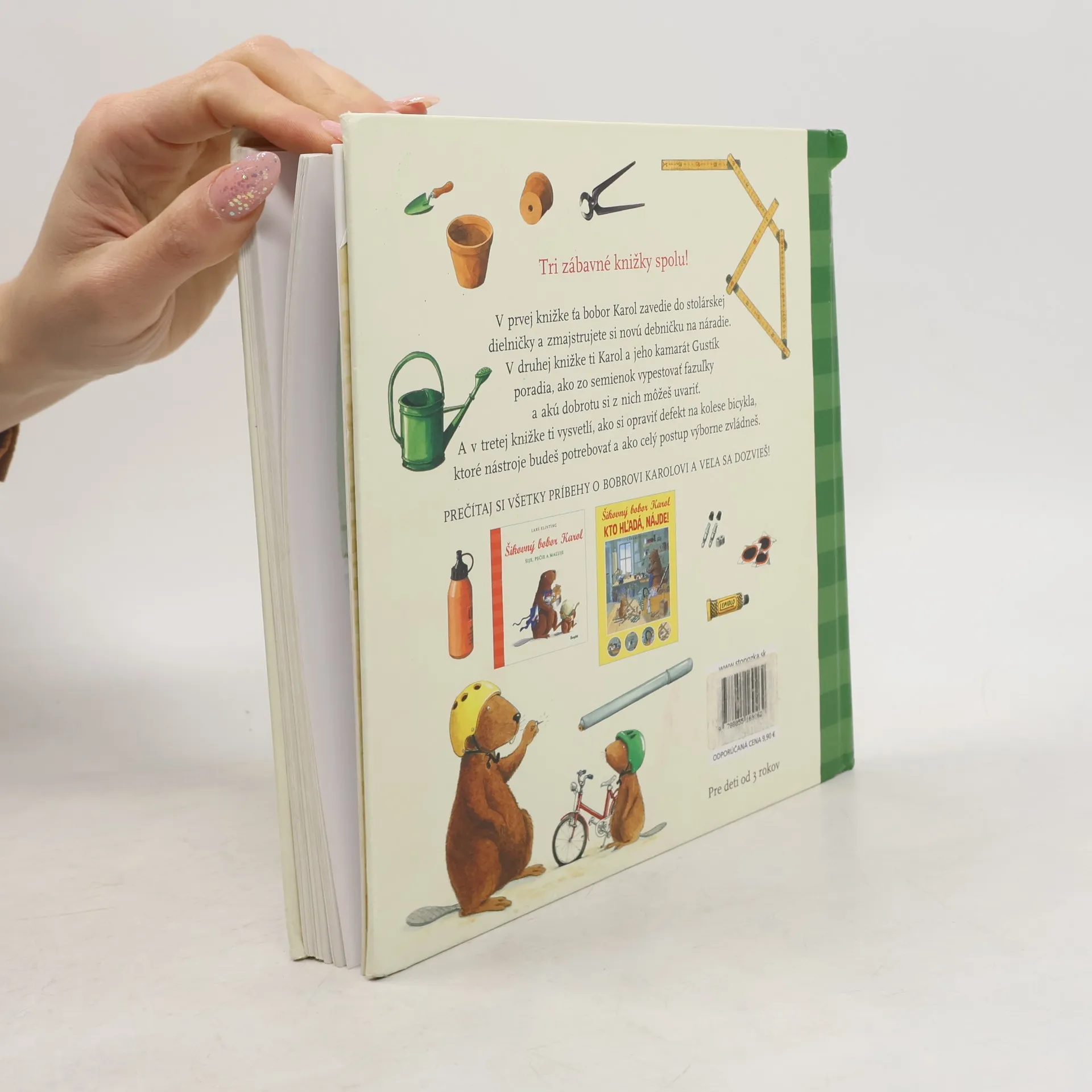 Tri zábavné knižky spolu! V prvej knižke ťa bobor Karol zavedie do stolárskej dielničky a zmajstrujete si novú debničku na náradie. V druhej knižke ti Karol a jeho kamarát Gustík poradia,ako zo semienok vypestovať fazuľky,a akú dobrotu si z nich môžeš uvariť. A v tretej knižke ti vysvetlí, ako si opraviť defekt na kolese bicykla, ktoré nástroje budeš potrebovať a ako celý postup výborne zvládneš.