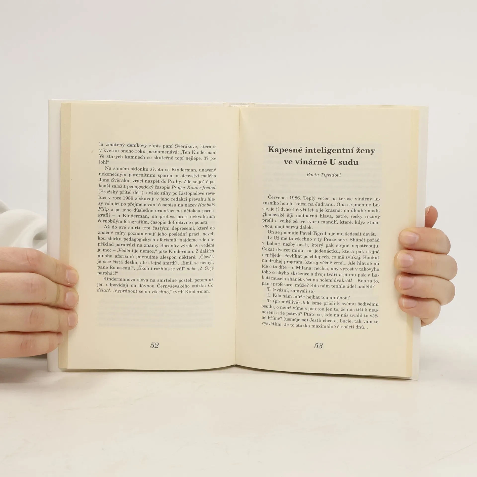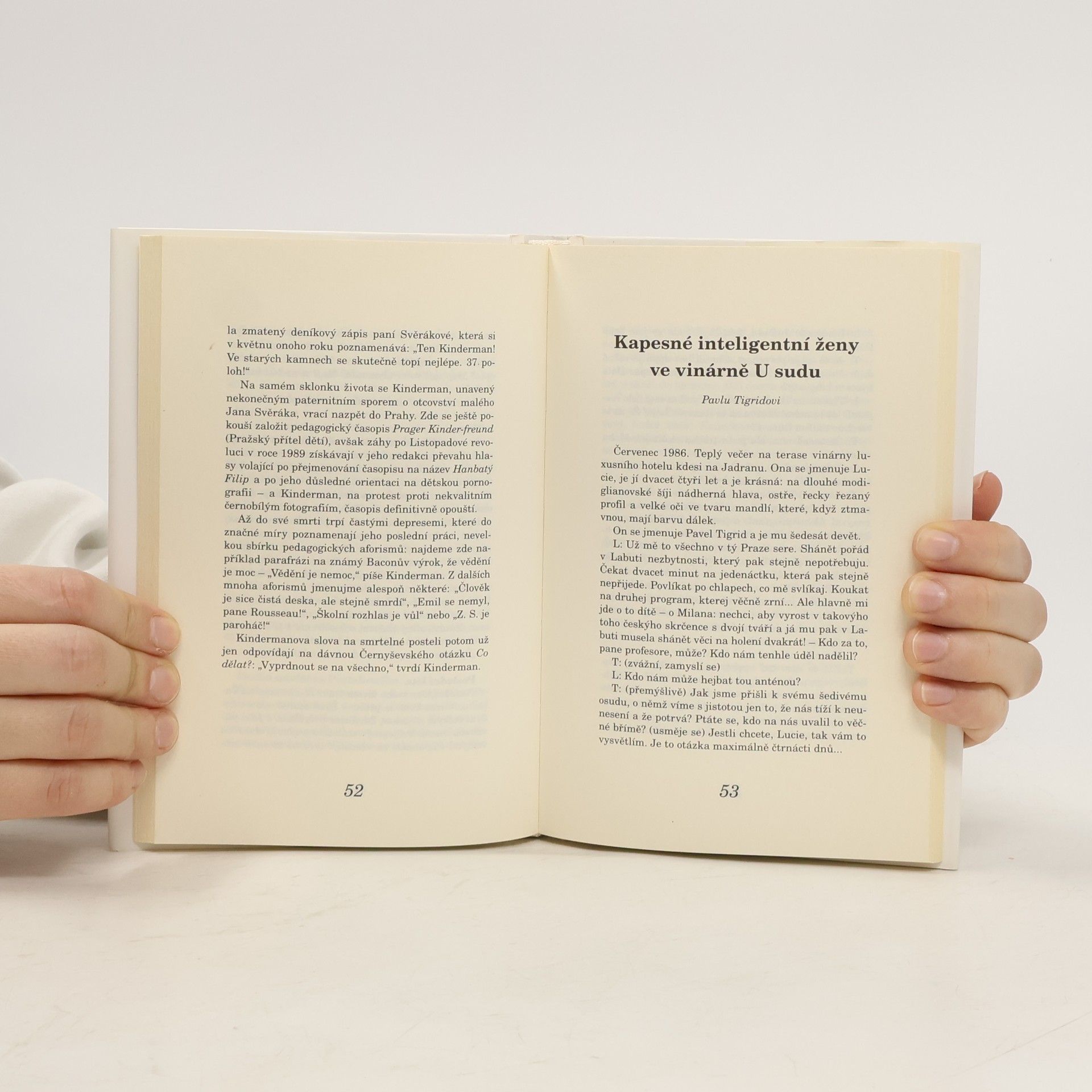 Rozverné nactiutrhačné literární parodie, v nichž Michal Viewegh se svým pověstným nadhledem napodobuje styl jedenácti českých a deseti světových autorů. V jedné z parodií se setkáváme s Lucií, krásnou dvacet čtyřletou ženou, a Pavlem Tigridem, šedesát devítiletým mužem. Na terase vinárny v Jadranu se Lucie vyjadřuje k frustracím ze života v Praze, včetně čekání na tramvaje a obtížného hledání potřebných věcí. Její hlavní obava se týká syna Milana, kterého nechce vidět vyrůstat jako „českého skrčence“. Tigrid se zamýšlí nad tím, jak se dostali k „šedivému osudu“, a Lucie se snaží najít viníka, přičemž se domnívá, že za vše mohou Rusové. Tigrid souhlasí, ale naznačuje, že situace je složitější. Diskutují o politických svobodách, které byly slibovány, ale nikdy nenaplněny. Lucie se zmíní o Dubčekovi, jehož obraz v plavkách ji pobavil, ale Tigrid ji varuje, že nebyl skutečným reformátorem. Rozmlouvají o politických represích a Tigrid zmiňuje, že Stalin byl symbolem hrůzy a mučení. Lucie, šokována, se ptá, kdo za to všechno může. Tigrid se snaží odpovědět, ale je přerušen mladým Černohorcem, který žádá Lucii o tanec, což ji potěší.