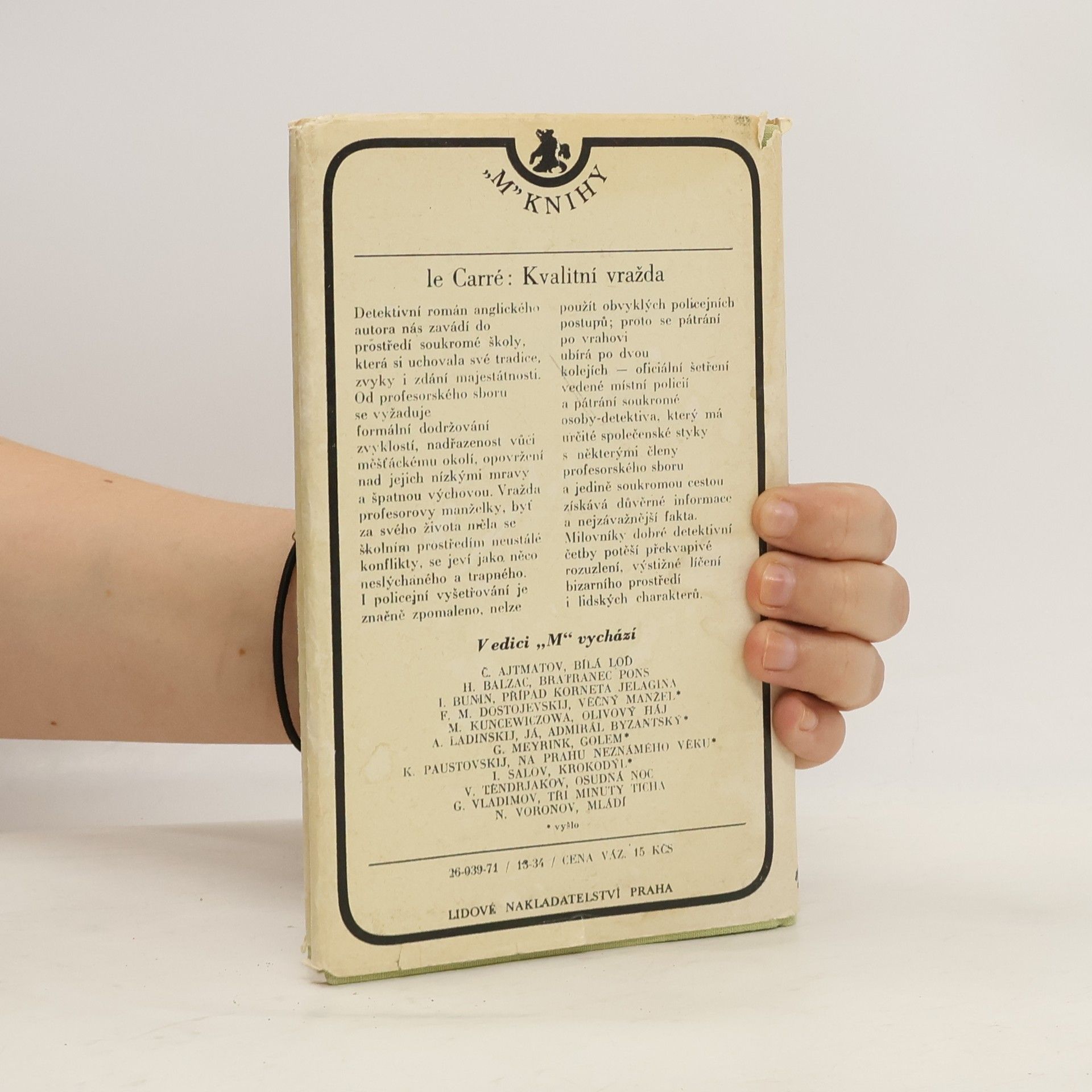 V detektivním románě z prostředí anglické soukromé školy, v příběhu zrcadlícím společenské přehrady mezi profesorským sborem a měšťanským prostředím, dojde k vraždě profesorovy manželky. Během pátrání po pachateli, v němž se vedle policie účastní i soukromý detektiv, dojde ještě k vraždě nepohodlného svědka. Příběh anglického autora, budovaný na spletitosti lidských charakterů, je završen překvapivým rozuzlením. Z anglického originálu A murder of quality, vydaného nakladatelstvím Penguin Books, London 1965, přeložila Anna van Dijková.