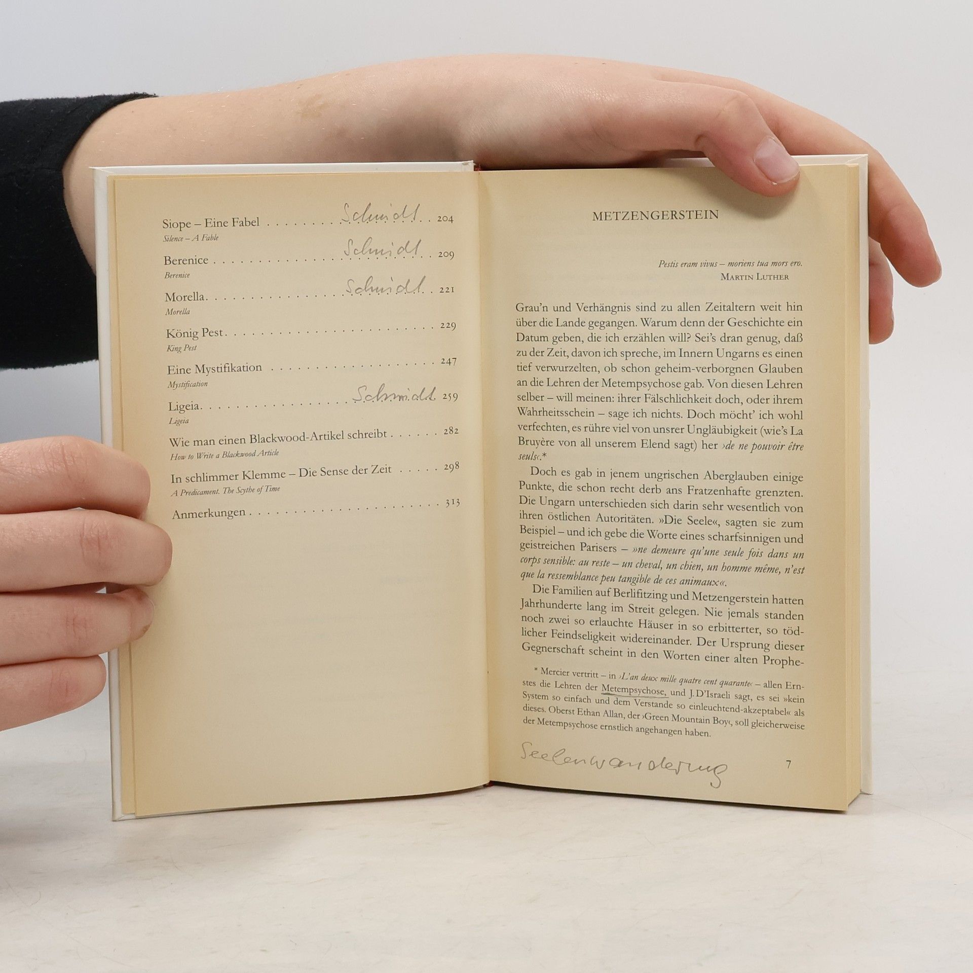 Haffmans, Zürich o.J. (c1994), hier als Lizenzausgabe für Zweitausendeins Versand, Frankfurt/M. Textidentisch mit der ersten Ausgabe der Neuübertragung durch Arno Schmidt, Hans Wollschläger u. a., Walter Verlag, Olten und Freiburg 1966-73; Gedichte zweisprachig (Original | Übertragung) Band 1 „König Pest“ – Erzählungen 1831–38, 359 S. Übersetzer: Arno Schmidt, Hans Wollschläger Band 2 „Der Fall des Hauses Ascher“ – Erzählungen 1839–42, 438 S. Übersetzer: Arno Schmidt, Hans Wollschläger Band 3 „Der schwarze Kater“ – Erzählungen 1843–49, 656 S. Übersetzer: Arno Schmidt, Hans Wollschläger, Kuno Schumann Band 4 „Arthur Gordon Pym“ – Roman, 278 S. Übersetzer: Arno Schmidt Band 5 „Der Rabe“ – Gedichte und Essays, 494 S. Übersetzer: Arno Schmidt, Hans Wollschläger, Friedrich Polakovics, Ursula Wernicke