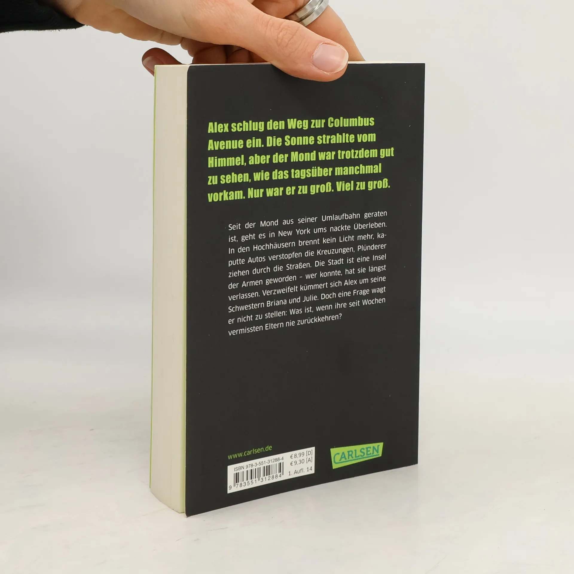Seit der Mond aus seiner Umlaufbahn verschoben wurde, geht es in New York ums nackte Überleben. In den Hochhäusern brennt kein Licht mehr, kaputte Autos verstopfen die Kreuzungen, Plünderer ziehen durch die Straßen. Die Stadt ist eine Insel der Armen geworden – wer konnte, hat sie längst verlassen. Verzweifelt kümmert sich Alex um seine Schwestern Briana und Julie. Doch eine Frage wagt er nicht zu stellen: Was ist, wenn ihre seit Wochen vermissten Eltern nie zurückkehren?