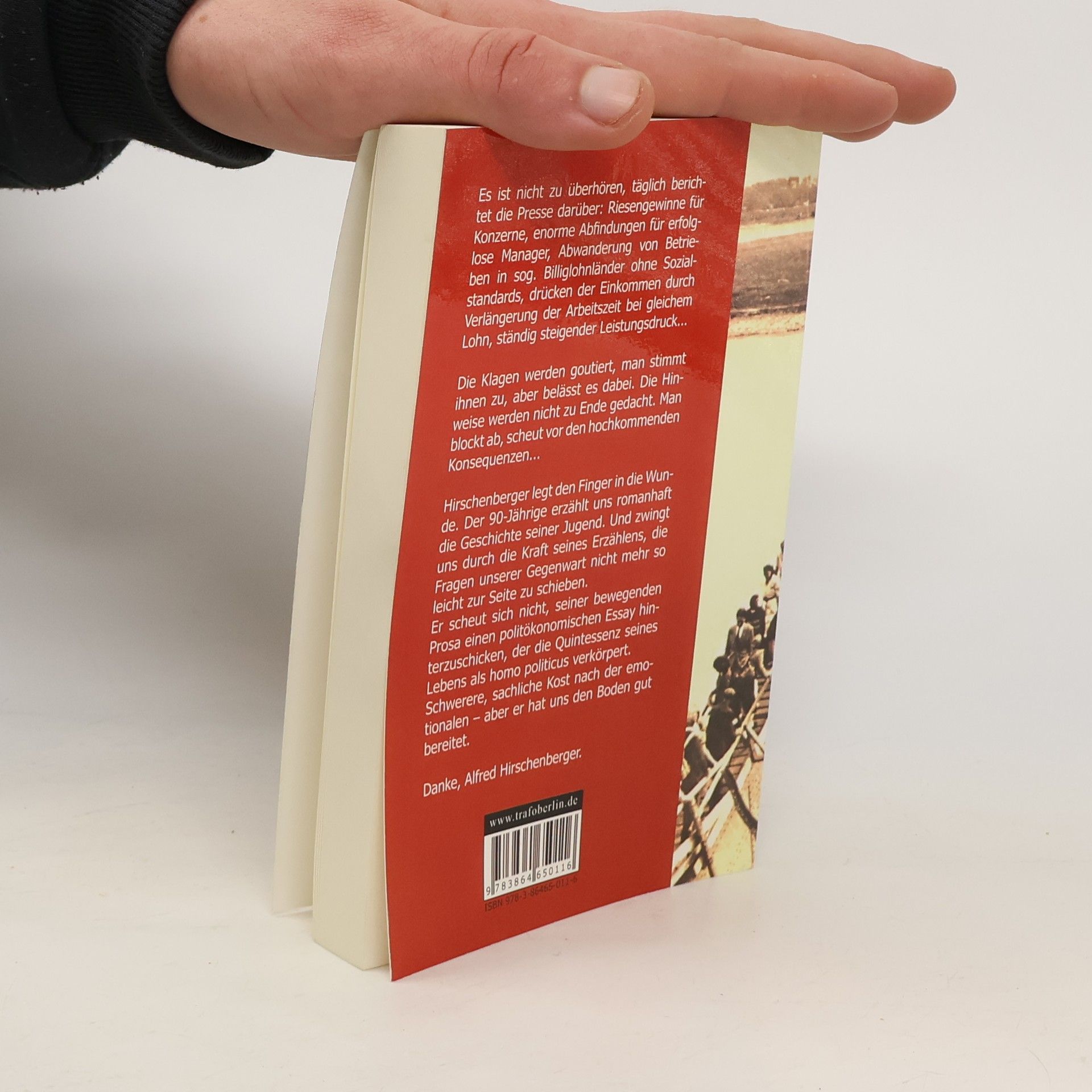 Es ist nicht zu überhören, täglich berichtet die Presse darüber: Riesengewinne für Konzerne, enorme Abfindungen für erfolglose Manager, Abwanderung von Betrieben in sog. Billiglohnländer ohne Sozialstandards, drücken der Einkommen durch Verlängerung der Arbeitszeit bei gleichem Lohn, ständig steigender Leistungsdruck. Die Klagen werden goutiert, man stimmt ihnen zu, aber belässt es dabei. Die Hinweise werden nicht zu Ende gedacht. Man blockt ab, scheut vor den hochkommenden Konsequenzen. Hirschenberger legt den Finger in die Wunde. Der 90-Jährige erzählt uns romanhaft die Geschichte seiner Jugend. Und zwingt uns durch die Kraft seines Erzählens, die Fragen unserer Gegenwart nicht mehr so leicht zur Seite zu schieben. Er scheut sich nicht, seiner bewegenden Prosa einen politökonomischen Essay hinterzuschicken, der die Quintessenz seines Lebens als homo politicus verkörpert. Schwerere, sachliche Kost nach der emotionalen – aber er hat uns den Boden gut bereitet. Danke, Alfred Hirschenberger.