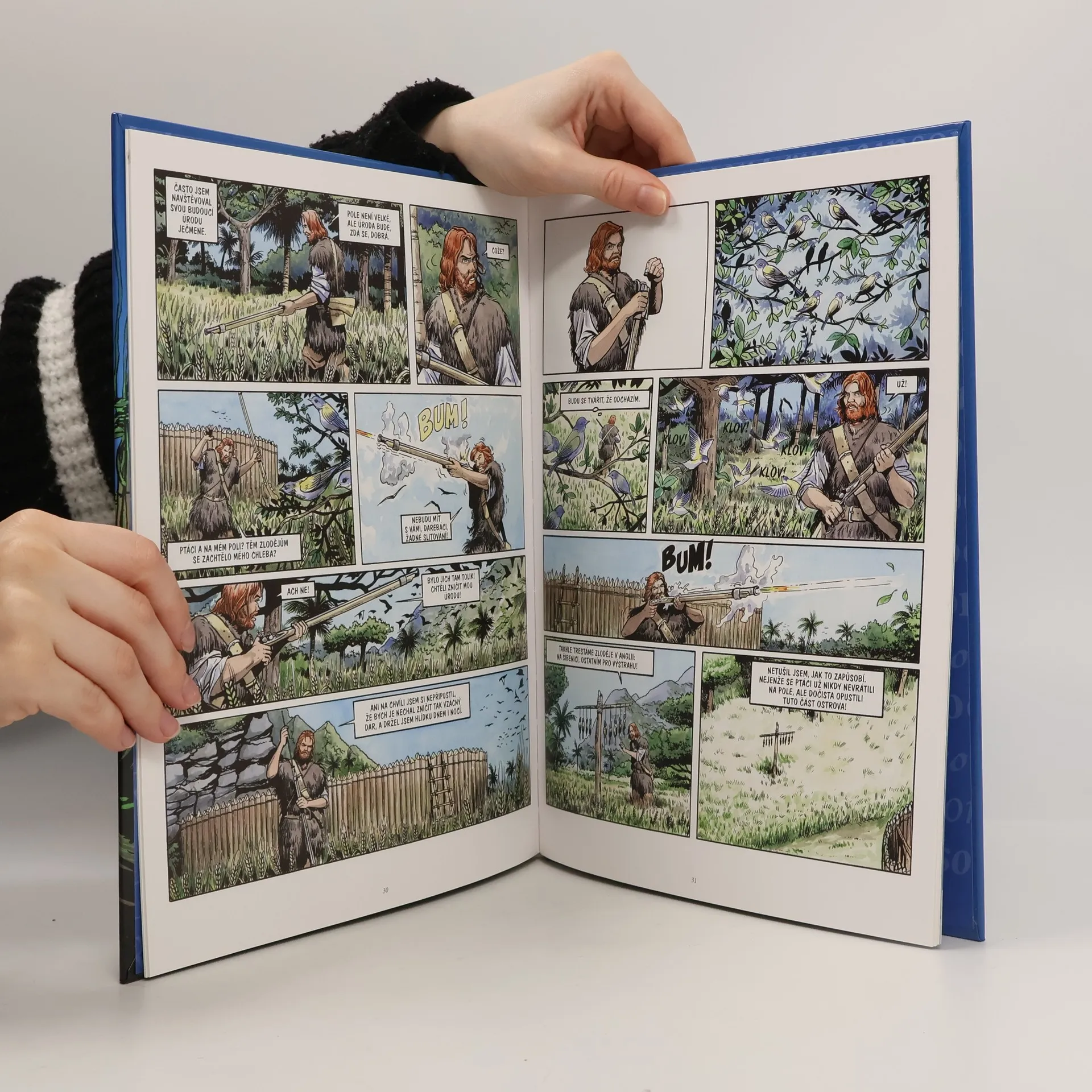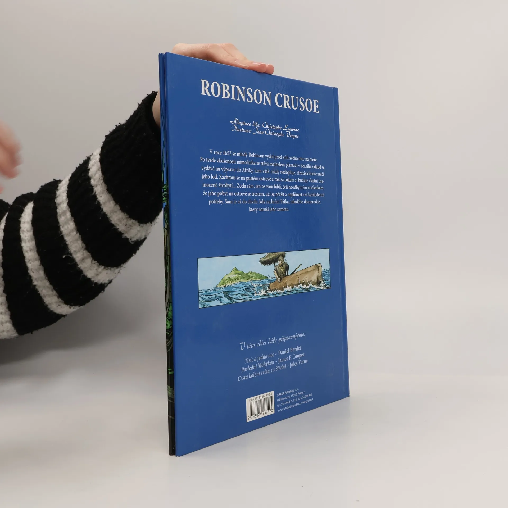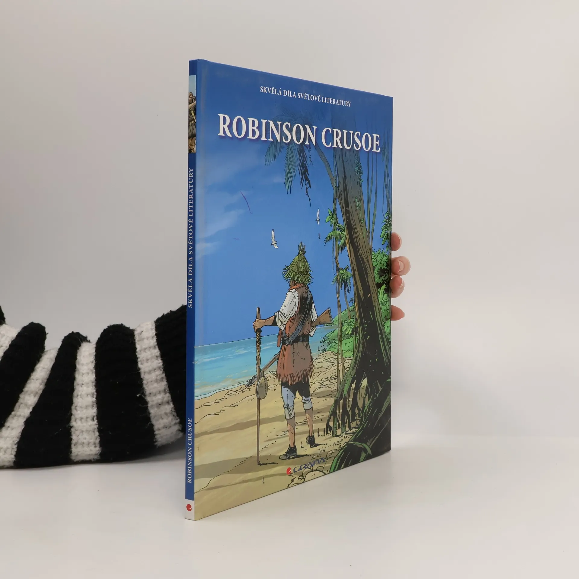 Nový komiks velkého formátu! Známý a velmi oblíbený příběh anglického námořníka, který se zachrání po ztroskotání lodi na pustém ostrově a musí se naučit se o sebe postarat. Poznává svůj ostrov, snaží se ochočit zvířata, pěstovat banány a další jedné plodiny, hledá pitnou vodu a staví si přístřeší. Robinsonovi se podaří zachránit jednoho z domorodců, kteří občas na ostrov přijíždějí na svých lodích. Spřátelí se a Pátek, jak jej pojemnovat mu dělá společnost a pomáhá. Po mnoha letech života na neobydleném ostrově se přece jen objeví loď, která Robinsona i Pátka zachrání a doveze je zpět do Anglie. V závěru knihy je informativní text o autorovi a historie celého příběhu.