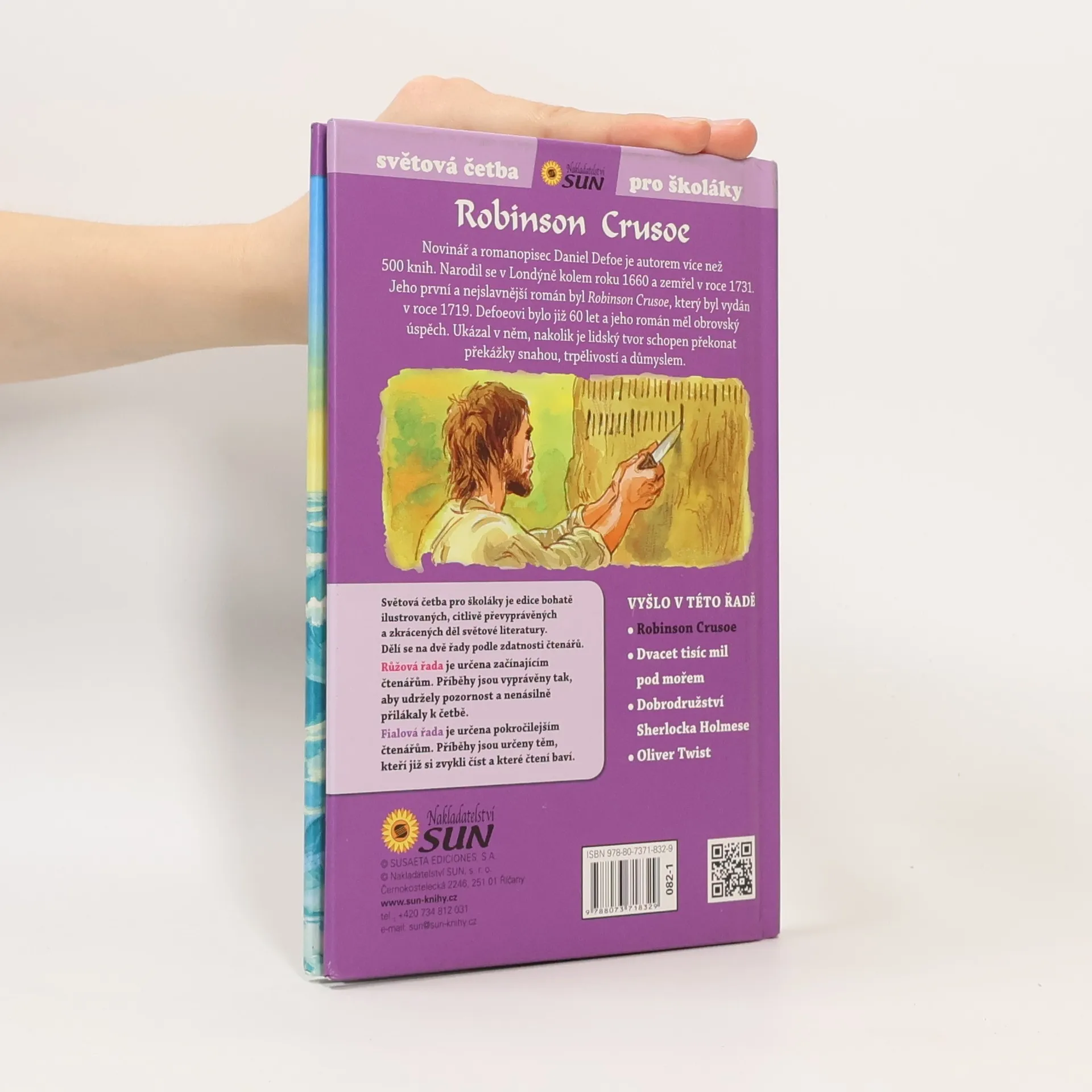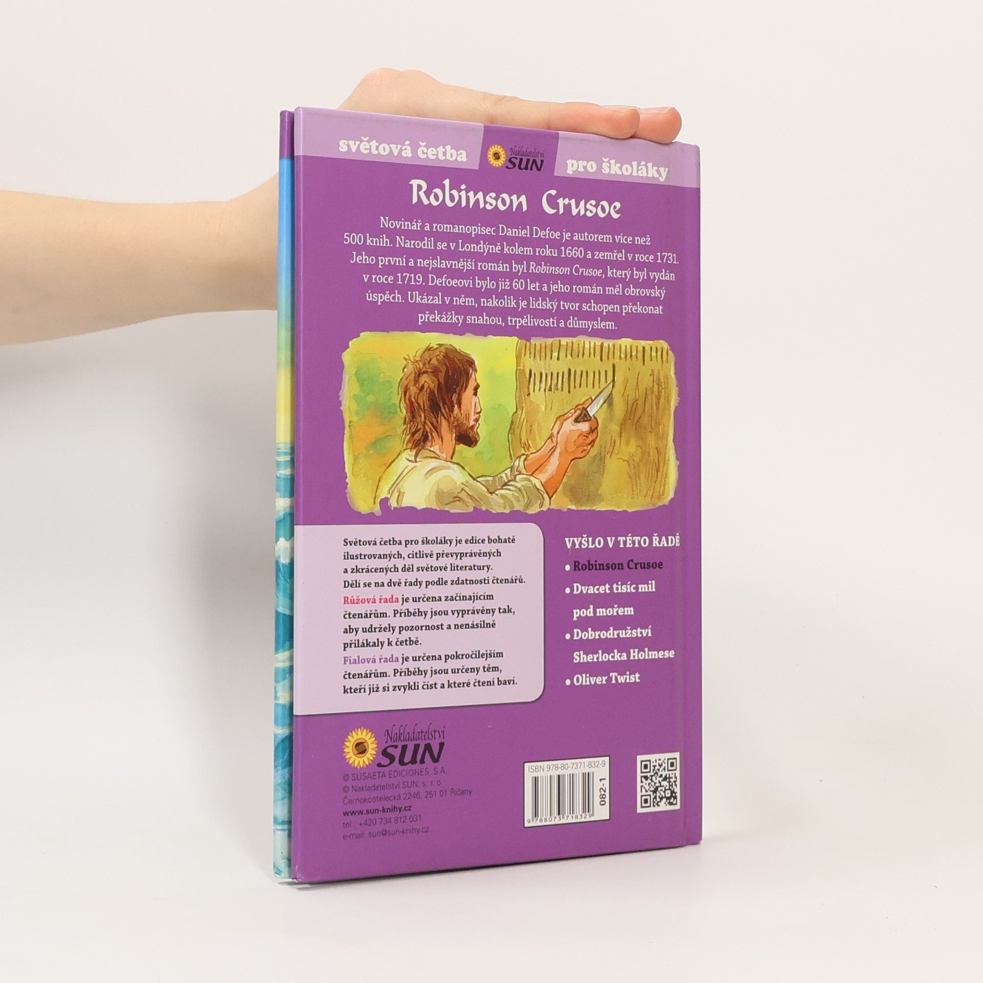 Světová četba pro školáky je edice bohatě ilustrovaných, citlivě převyprávěných a zkrácených děl světové literatury. Defoeovi bylo již 60 let a jeho román měl obrovský úspěch. Ukázal v něm, nakolik je člověk schopen překonat překážky snahou, trpělivostí a důmyslem. Fialová řada knih je určena mírně pokročilým čtenářům, kteří již si zvykli číst. ( 9+ )