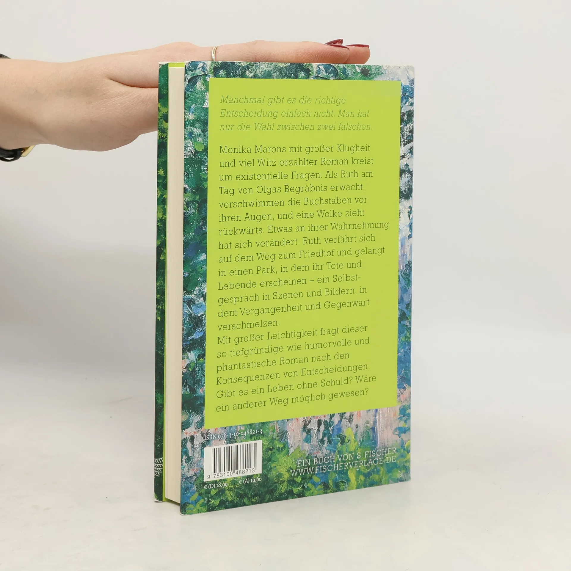 Manchmal gibt es die richtige Entscheidung einfach nicht. Man hat nur die Wahl zwischen zwei falschen. Monika Marons mit großer Klugheit und viel Witz erzählter Roman kreist um existentielle Fragen. Als Ruth am Tag von Olgas Begräbnis erwacht, verschwimmen die Buchstaben vor ihren Augen, und eine Wolke zieht rückwärts. Etwas an ihrer Wahrnehmung hat sich verändert. Ruth verfährt sich auf dem Weg zum Friedhof und gelangt in einen Park, in dem ihr Tote und Lebende erscheinen – ein Selbstgespräch in Szenen und Bildern, in dem Vergangenheit und Gegenwart verschmelzen. Mit großer Leichtigkeit fragt dieser so tiefgründige wie humorvolle und phantastische Roman nach den Konsequenzen von Entscheidungen. Gibt es ein Leben ohne Schuld? Wäre ein anderer Weg möglich gewesen?