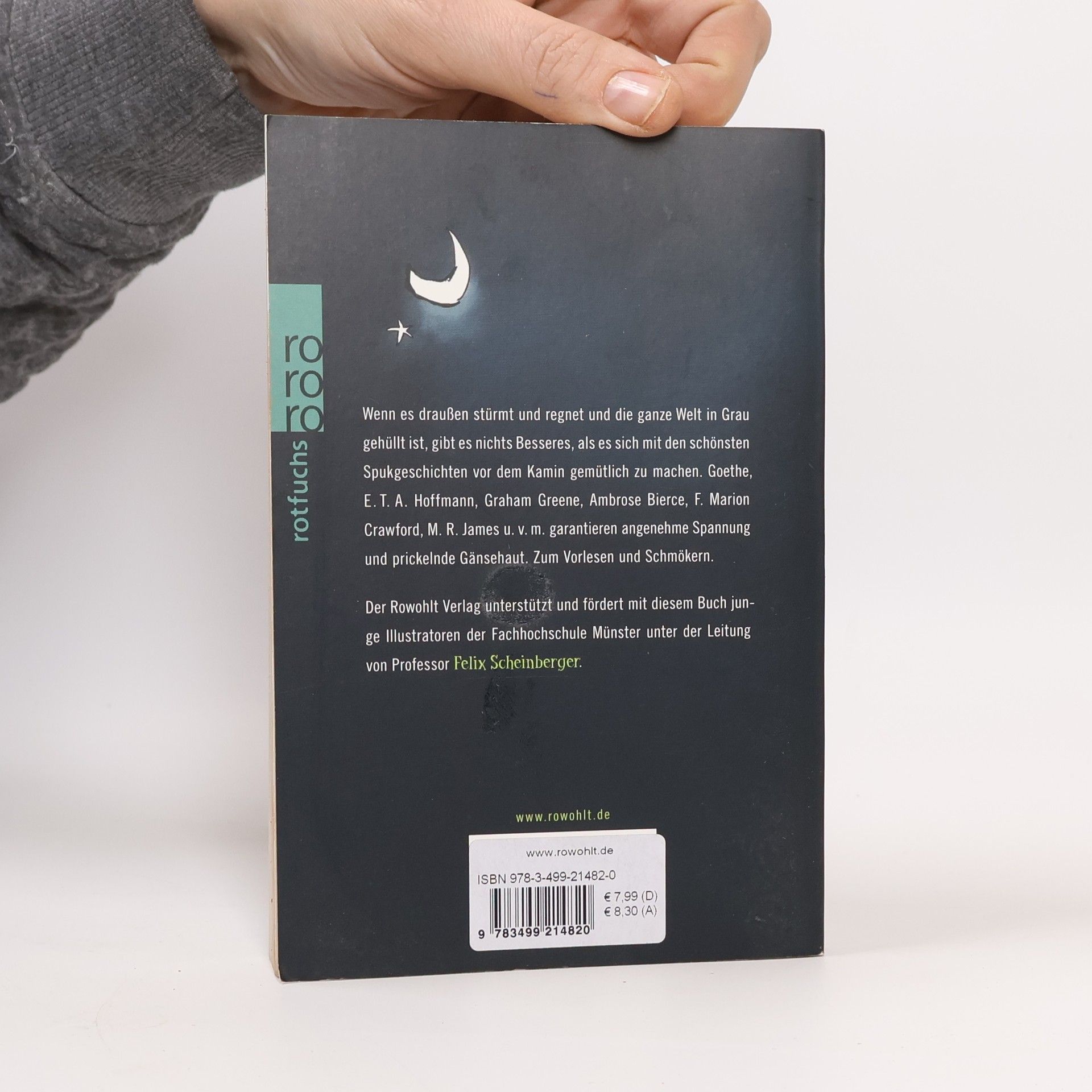 Wenn es draußen stürmt und regnet und die ganze Welt in Grau gehüllt ist, gibt es nichts Besseres, als es sich mit den schönsten Spukgeschichten vor dem Kamin gemütlich zu machen. Goethe, E. T. A. Hoffmann, Graham Greene, Ambrose Bierce, F. Marion Crawford, M. R. James u. v. m. garantieren angenehme Spannung und prickelnde Gänsehaut. Zum Vorlesen und Schmökern. Der Rowohlt Verlag unterstützt und fördert mit diesem Buch junge Illustratoren der Fachhochschule Münster unter der Leitung von Professor Felix Scheinberger.