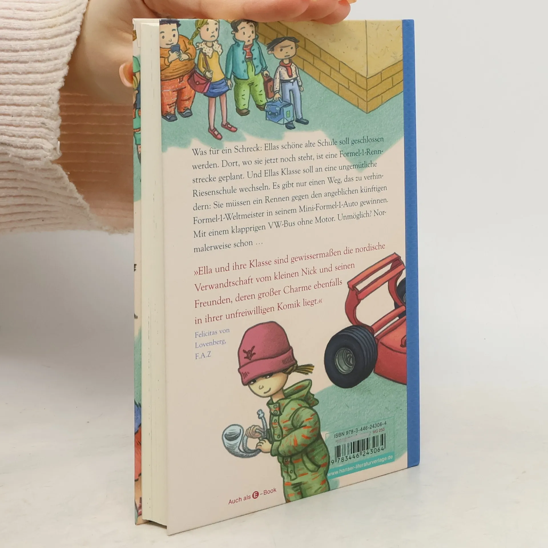 Was für ein Schreck: Ellas schöne alte Schule soll geschlossen werden. Dort, wo sie steht, ist eine neue Formel-1-Rennstrecke geplant. Und Ellas Klasse soll an eine ungemütliche Riesenschule wechseln. So groß ist diese Schule, dass eine Erstklässlerin darin seit Monaten herumirrt und ihre Klasse sucht. Nein, da wollen Ella und ihre Freunde nicht hin. Und es gibt sogar ein Fünkchen Hoffnung. Sie müssen nur ein Rennen gegen den zukünftigen Formel-1-Weltmeister gewinnen. Mit einem klapprigen VW-Bus ohne Motor. Unmöglich? Normalerweise schon. Aber nicht bei Ella. Im neuen Kinderbuch des Erfolgsautors aus Finnland endet das komischste Autorennen der Welt natürlich mit einem Sieg der Guten.