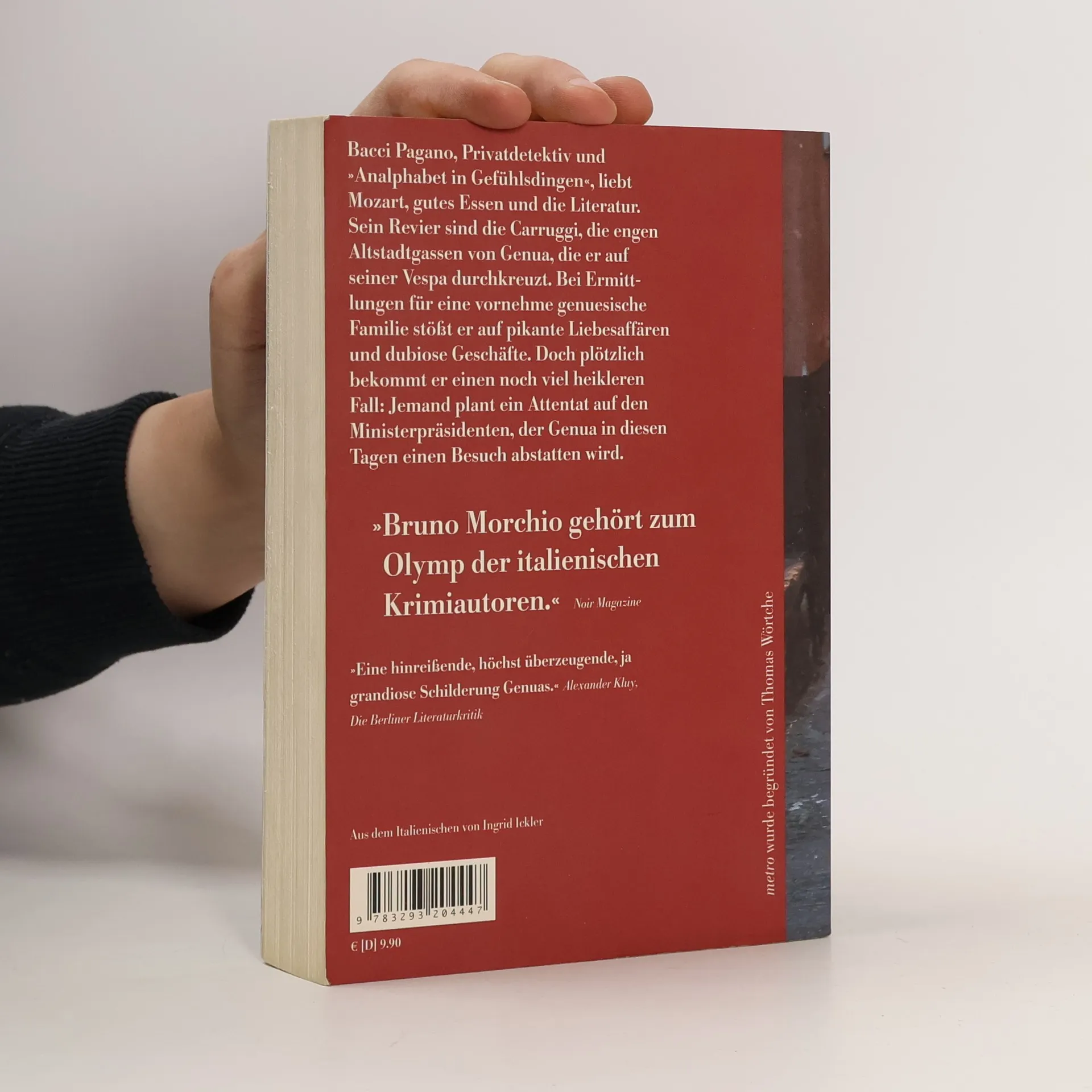 Bacci Pagano, Privatdetektiv und »Analphabet in Gefühlsdingen«, liebt Mozart, gutes Essen und die Literatur. Sein Revier sind die Carruggi, die engen Gassen in der Altstadt von Genua, die er auf seiner amarantroten Vespa 200 PX durchkreuzt. Bei Ermittlungen für eine vornehme Familie aus dem Genueser Industrieadel stößt er auf pikante Liebesaffären und dubiose Millionengeschäfte. Doch plötzlich bekommt er einen noch viel heikleren Fall: Aus dem Studio eines linken Radiosenders wurde ein Gewehr gestohlen. Irgendjemand plant damit ein Attentat auf den Ministerpräsidenten, der Genua in diesen Tagen einen Besuch abstatten wird