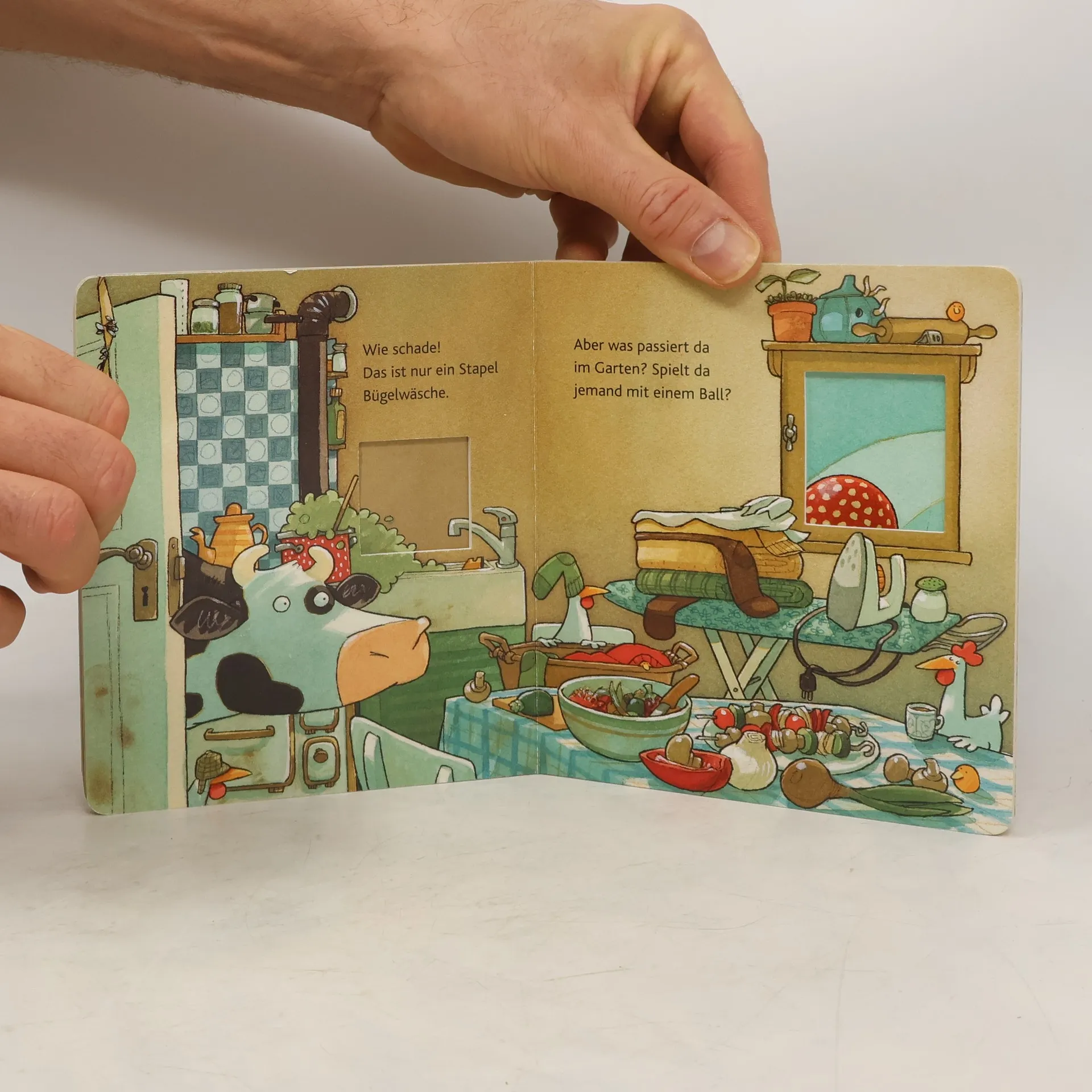 Perfekter Spaß für die Allerkleinsten durch das Entdecken und Wiedererkennen von Alltagsgegenständen in aufwendig gestaltetem Pappbilderbuch. Lieselotte schaut neugierig aus ihrer Stalltür. Viele spannende Dinge sind da zu sehen: durch das Küchenfenster zum Beispiel. Da steht doch eine Torte, oder? Wie lecker! Aber als Lieselotte die Tür öffnet, liegt da nur ein bunter Stapel Wäsche. Ein Pappenbuch mit vielen Gucklöchern. Lieselottes Abenteuer für die Kleinsten! Auch Kinder ab 2 Jahren haben jede Menge Spaß mit der lustigen Lieblingskuh und ihren Freunden. Fröhliche Bilder und stabile Pappseiten mit abgerundeten Ecken für kleine Kinderhände begeistern Mädchen wie Jungen. Ein schönes Geschenk zum 2. Geburtstag, zu Ostern, Nikolaus und Co.