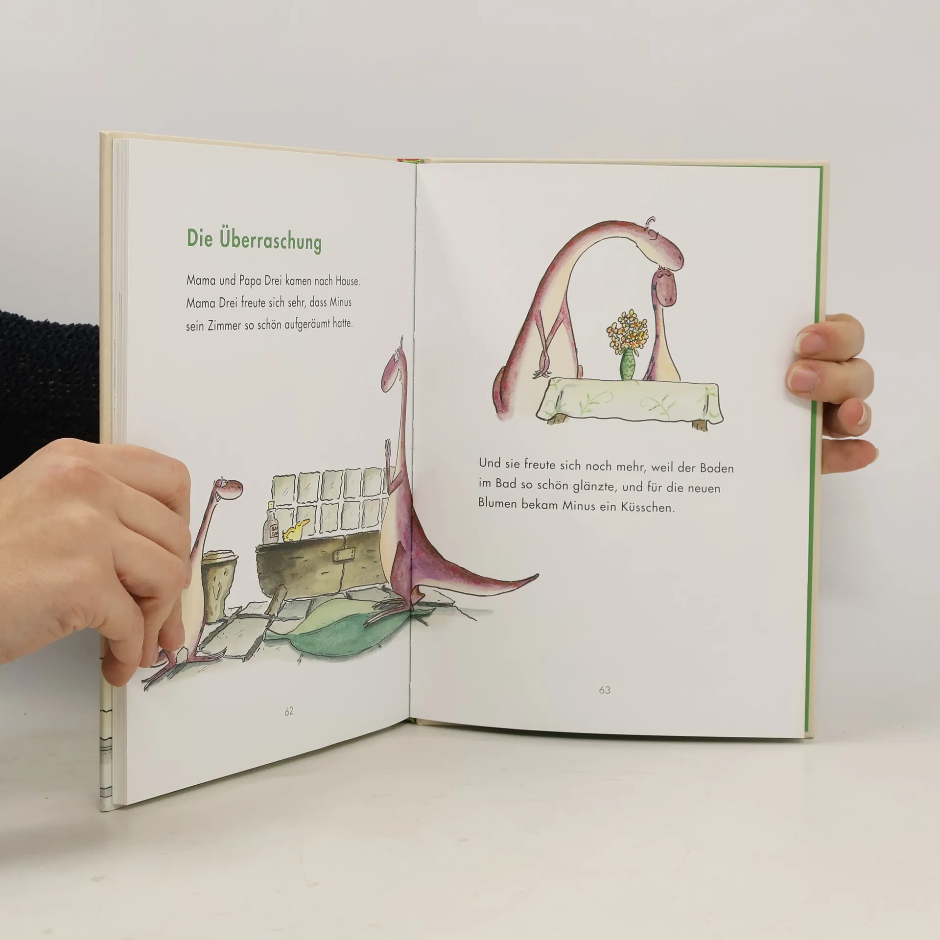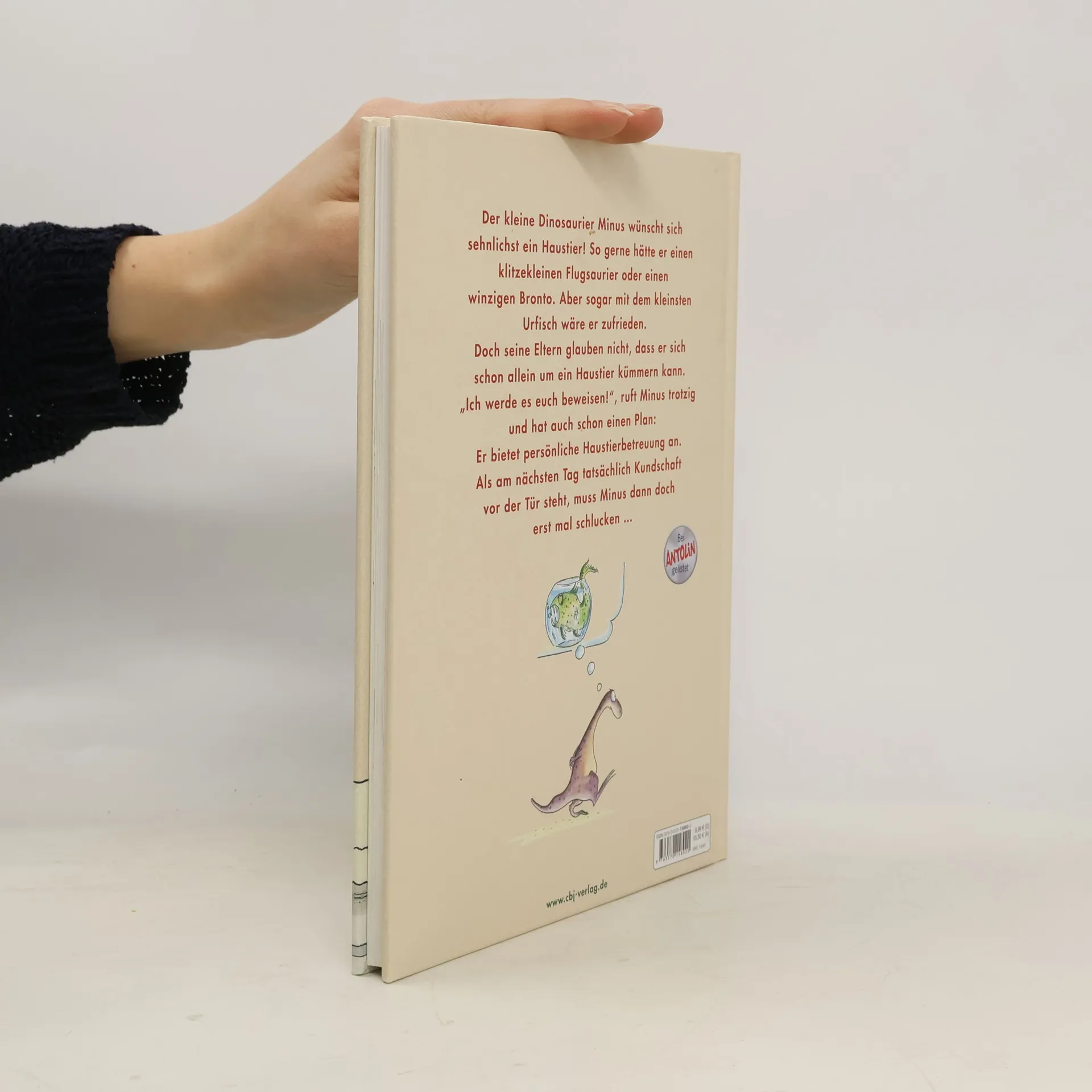 Dinosaurier Minus wünscht sich ein Haustier. Sogar mit einem Urfisch wäre er zufrieden! Doch seine Eltern glauben nicht, dass er sich schon allein um ein Tier kümmern kann. »Ich werde es euch beweisen!«, ruft Minus trotzig und hat schon einen Plan: Auf Plakaten bietet er Haustierbetreuung an. Schnell steht Kundschaft vor der Tür: T. Rex soll gebadet werden, Triceratops »Topsi« braucht Auslauf und Stegosaurus »Stigi« Krallenpflege. Nachdem die ungestümen Haustiere wieder weg sind und Minus die verwüstete Wohnung in Ordnung gebracht hat, fällt er total erledigt auf sein Bett. Von Haustieren hat er vorerst genug! Doch da kommen seine Eltern und haben eine Überraschung für ihn ... Ausstattung: Mit fbg. Illustrationen