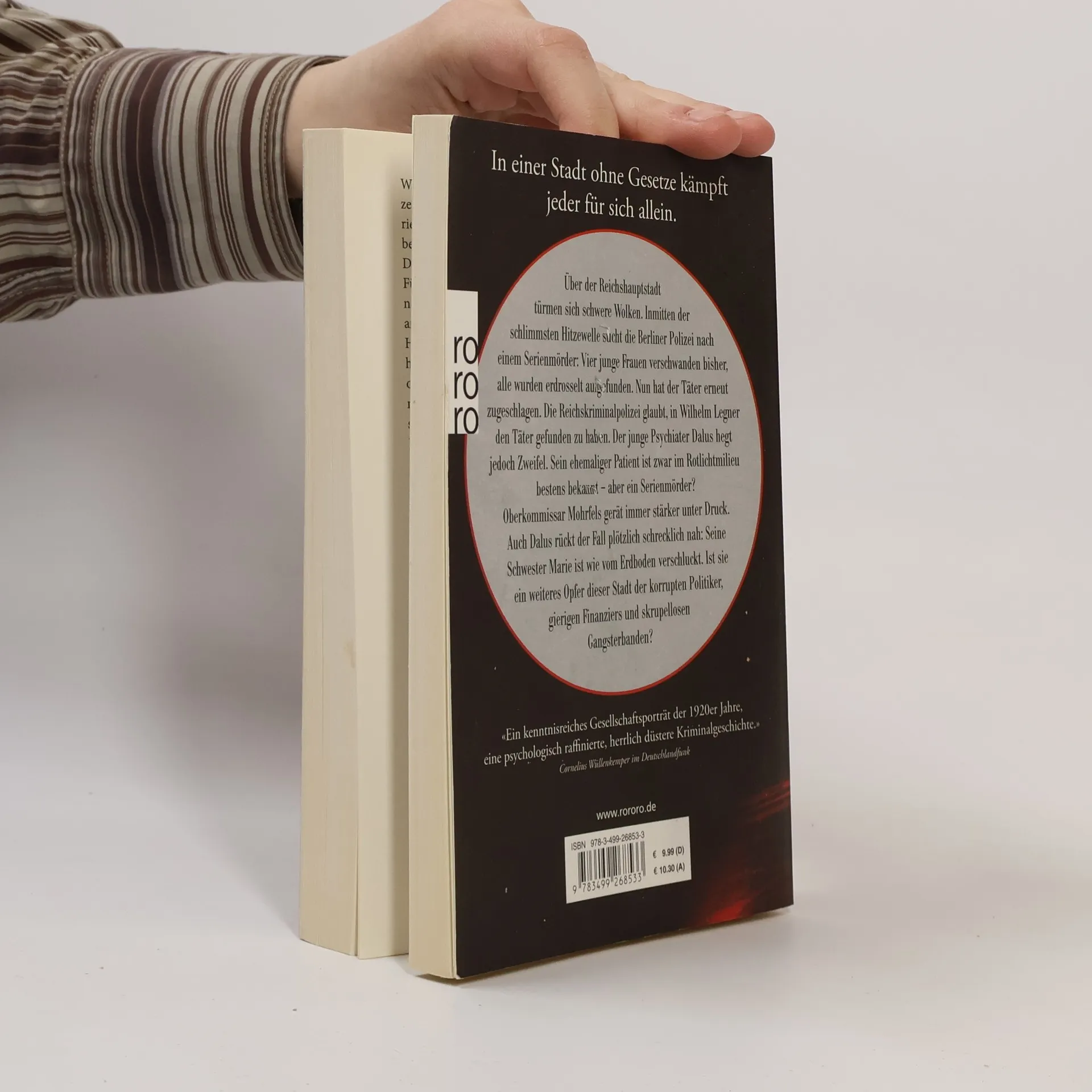 In einer Stadt ohne Gesetze kämpft jeder für sich allein. Über der Reichshauptstadt türmen sich schwere Wolken. Inmitten der schlimmsten Hitzewelle sucht die Berliner Polizei nach einem Serienmörder: Vier junge Frauen verschwanden bisher, alle wurden erdrosselt aufgefunden. Nun hat der Täter erneut zugeschlagen. Die Reichskriminalpolizei glaubt, in Wilhelm Legner den Täter gefunden zu haben. Der junge Psychiater Dalus hegt jedoch Zweifel. Sein ehemaliger Patient ist zwar im Rotlichtmilieu bestens bekannt - aber ein Serienmörder? Oberkommissar Mohrfels gerät immer stärker unter Druck. Auch Dalus rückt der Fall plötzlich schrecklich nah: Seine Schwester Marie ist wie vom Erdboden verschluckt. Ist sie ein weiteres Opfer dieser Stadt der korrupten Politiker, gierigen Finanziers und skrupellosen Gangsterbanden?