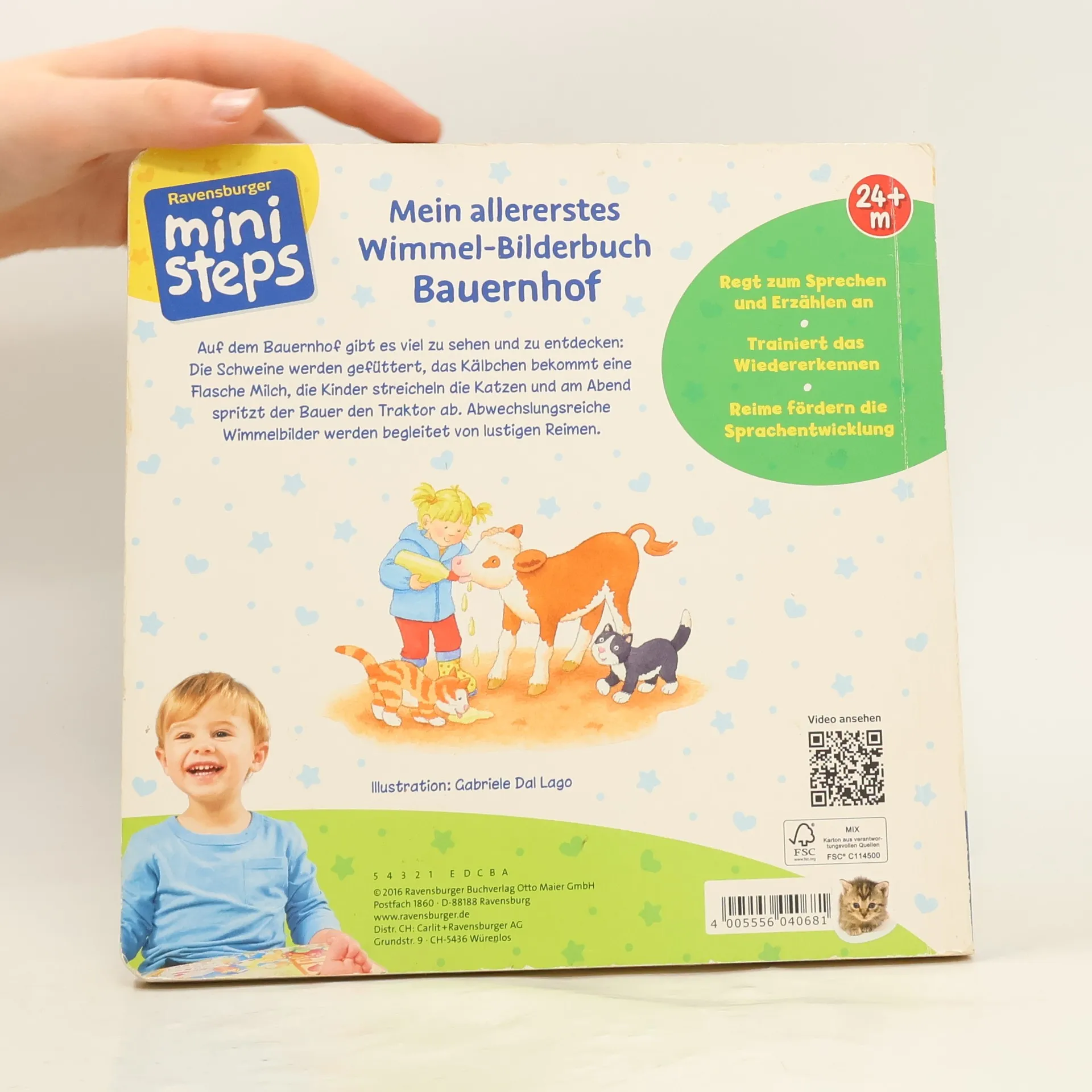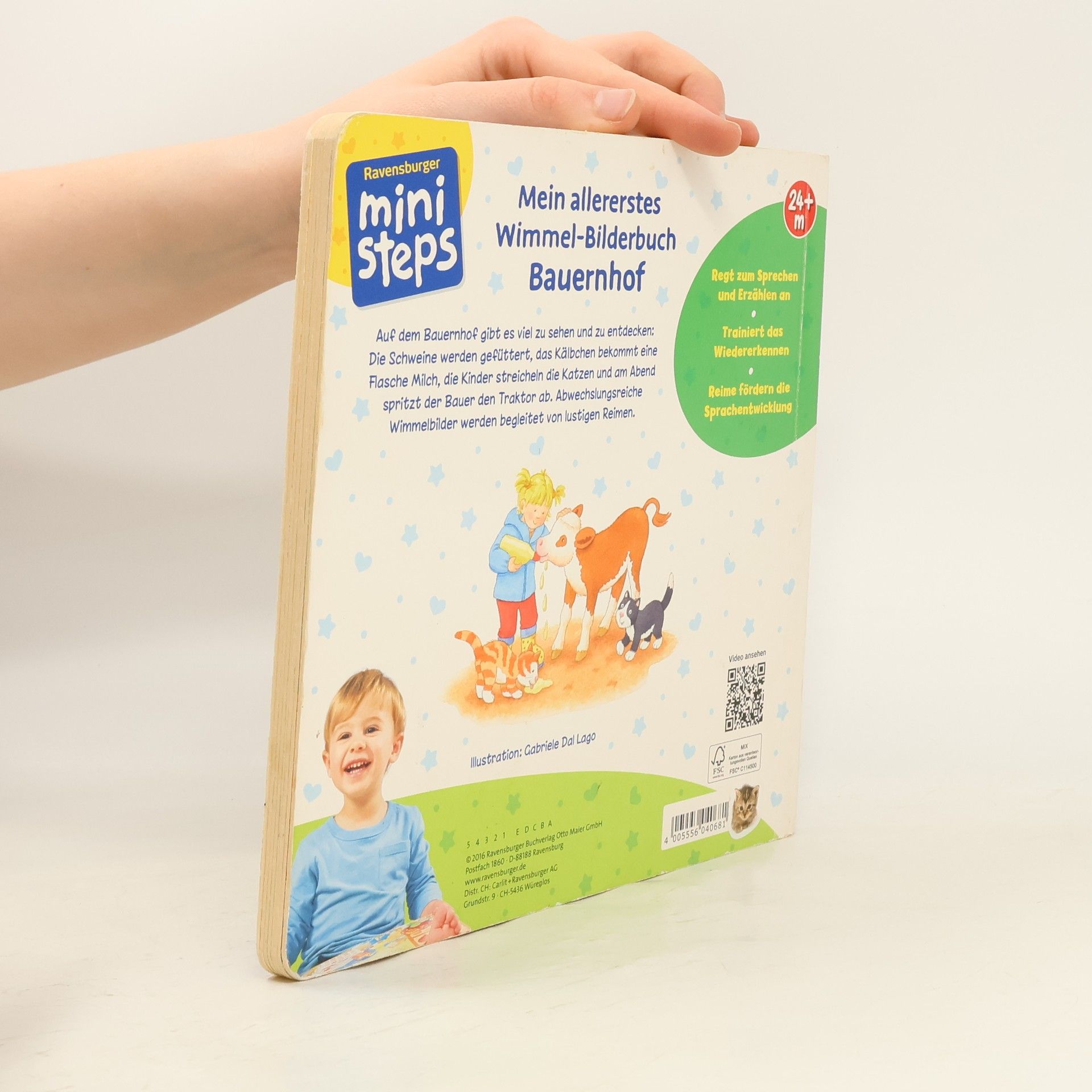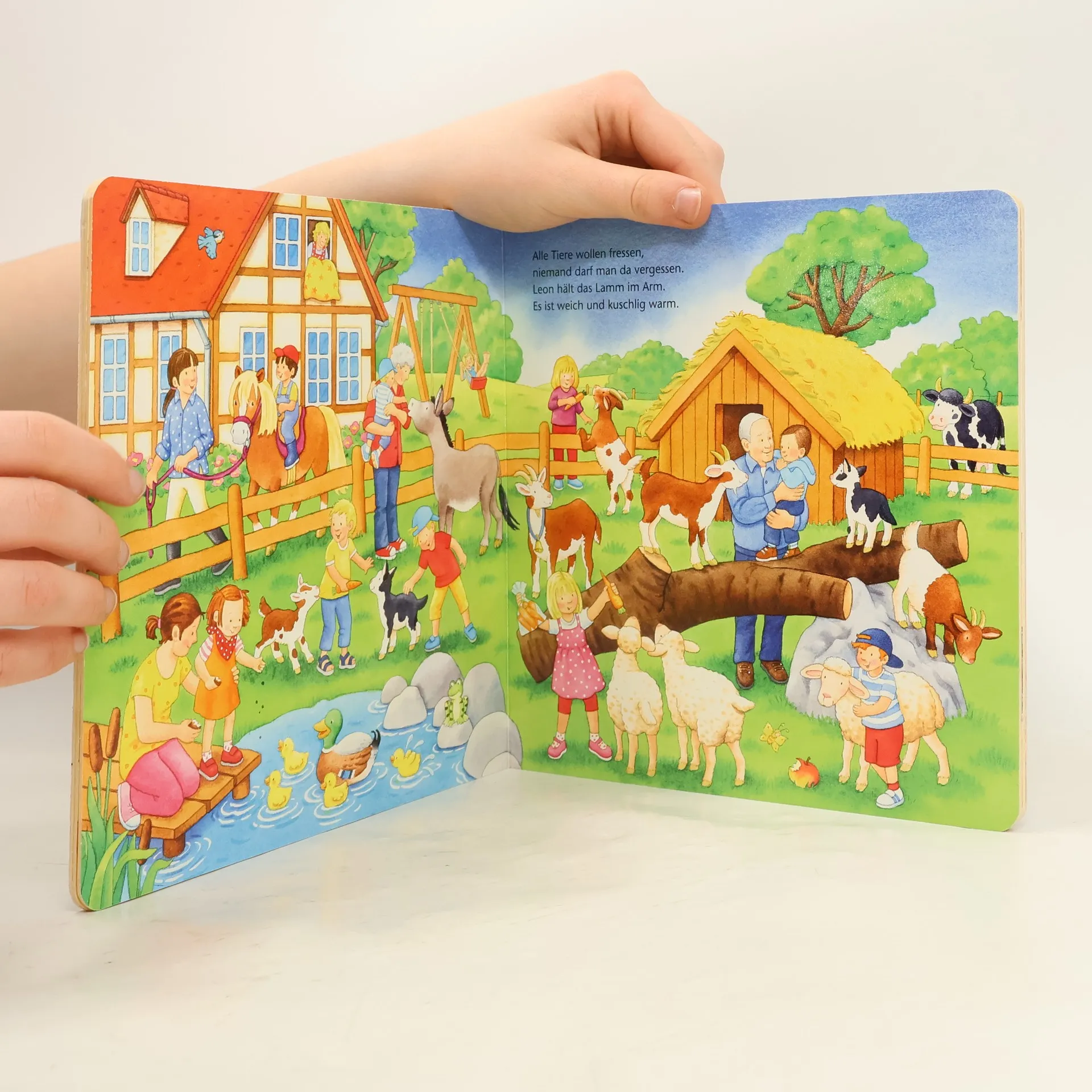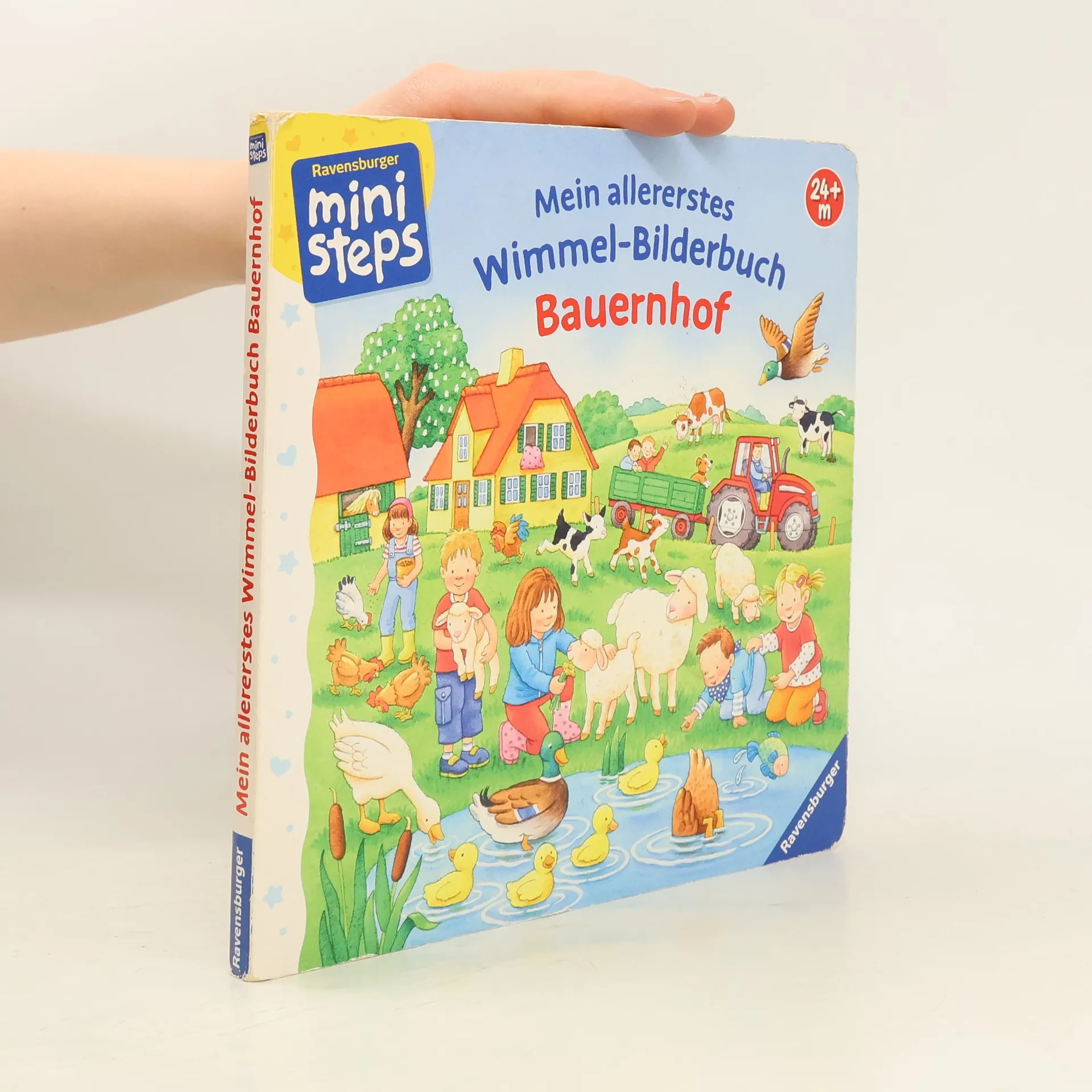 Sieben große Wimmelbilder zeigen unterschiedliche Szenen auf dem Bauernhof, bei denen die Kleinen allerhand entdecken können: Die Hühner werden gefüttert, die Kühe gemolken, im Hofladen herrscht großer Betrieb und auch der Traktor wird geputzt.